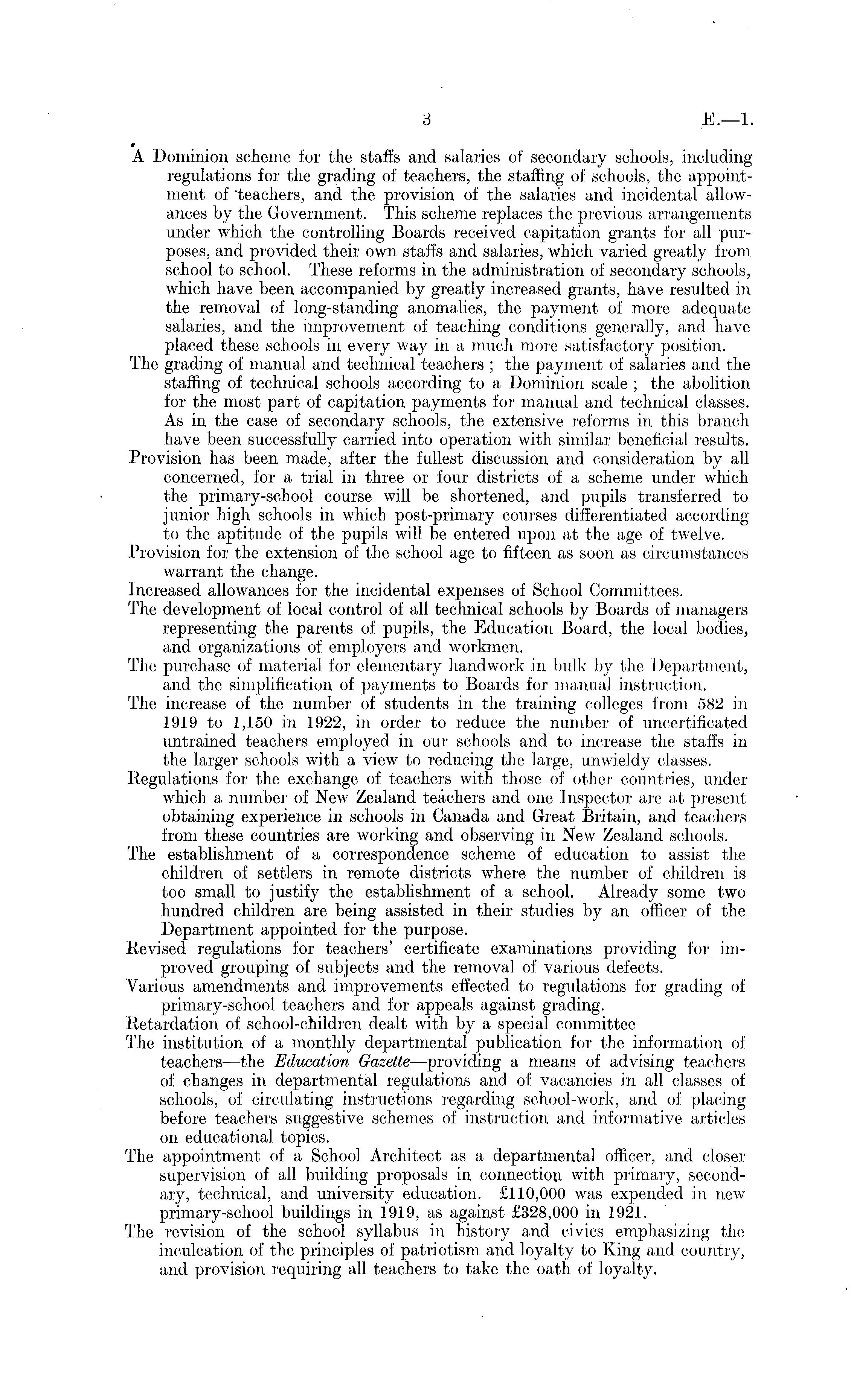 A Dominion scheme for the staffs and salaries of secondary schools, including regulations for the grading of teachers, the staffing of schools, the appointment of "teachers, and the provision of the salaries and incidental allowances by the Government. This scheme replaces the previous arrangements under which the controlling Boards received capitation grants for all purposes, and provided their own staffs and salaries, which varied greatly from school to school. These reforms in the administration of secondary schools, which have been accompanied by greatly increased grants, have resulted in the removal of long-standing anomalies, the payment of more adequate salaries, and the improvement of teaching conditions generally, and have placed these schools in every way in a much more satisfactory position. The grading of manual and technical teachers ; the payment of salaries and the staffing of technical schools according to a Dominion scale ; the abolition for the most part of capitation payments for manual and technical classes. As in the case of secondary schools, the extensive reforms in this branch have been successfully carried into operation with similar beneficial results. Provision has been made, after the fullest discussion and consideration by all concerned, for a trial in three or four districts of a scheme under which the primary-school course will be shortened, and pupils transferred to junior high schools in which post-primary courses differentiated according to the aptitude of the pupils will be entered upon at the age of twelve. Provision for the extension of the school age to fifteen as soon as circumstances warrant the change. Increased allowances for the incidental expenses of School Committees. The development of local control of all technical schools by Boards of managers representing the parents of pupils, the Education Board, the local bodies, and organizations of employers and workmen. The purchase of material for elementary handwork in bulk' by the Department, and the simplification of payments to Boards for manual instruction. The increase of the number of students in the training colleges from 582 in 1919 to 1,150 in 1922, in order to reduce the number of uncertificated untrained teachers employed in our schools and to increase the staffs in the larger schools with a view to reducing the large, unwieldy classes. Regulations for the exchange of teachers with those of other countries, under which a number of New Zealand teachers and one Inspector are at present obtaining experience in schools in Canada and Great Britain, and teachers from these countries are working and observing in New Zealand schools. The establishment of a correspondence scheme of education to assist the children of settlers in remote districts where the number of children is too small to justify the establishment of a school. Already some two hundred children are being assisted in their studies by an officer of the Department appointed for the purpose. Revised regulations for teachers' certificate examinations providing for improved grouping of subjects and the removal of various defects. Various amendments and improvements effected to regulations for grading of primary-school teachers and for appeals against grading. Retardation of school-children dealt with by a special committee The institution of a monthly departmental publication for the information of teachers —the Education Gazette —providing a means of advising teachers of changes in departmental regulations and of vacancies in all classes of schools, of circulating instructions regarding school-work, and of placing before teachers suggestive schemes of instruction and informative articles on educational topics. The appointment of a School Architect as a departmental officer, and closer supervision of all building proposals in connection with primary, secondary, technical, and university education. £110,000 was expended in new primary-school buildings in 1919, as against £328,000 in 1921. The revision of the school syllabus in history and civics emphasizing the inculcation of the principles of patriotism and loyalty to King and country, and provision requiring all teachers to take the oath of loyalty.