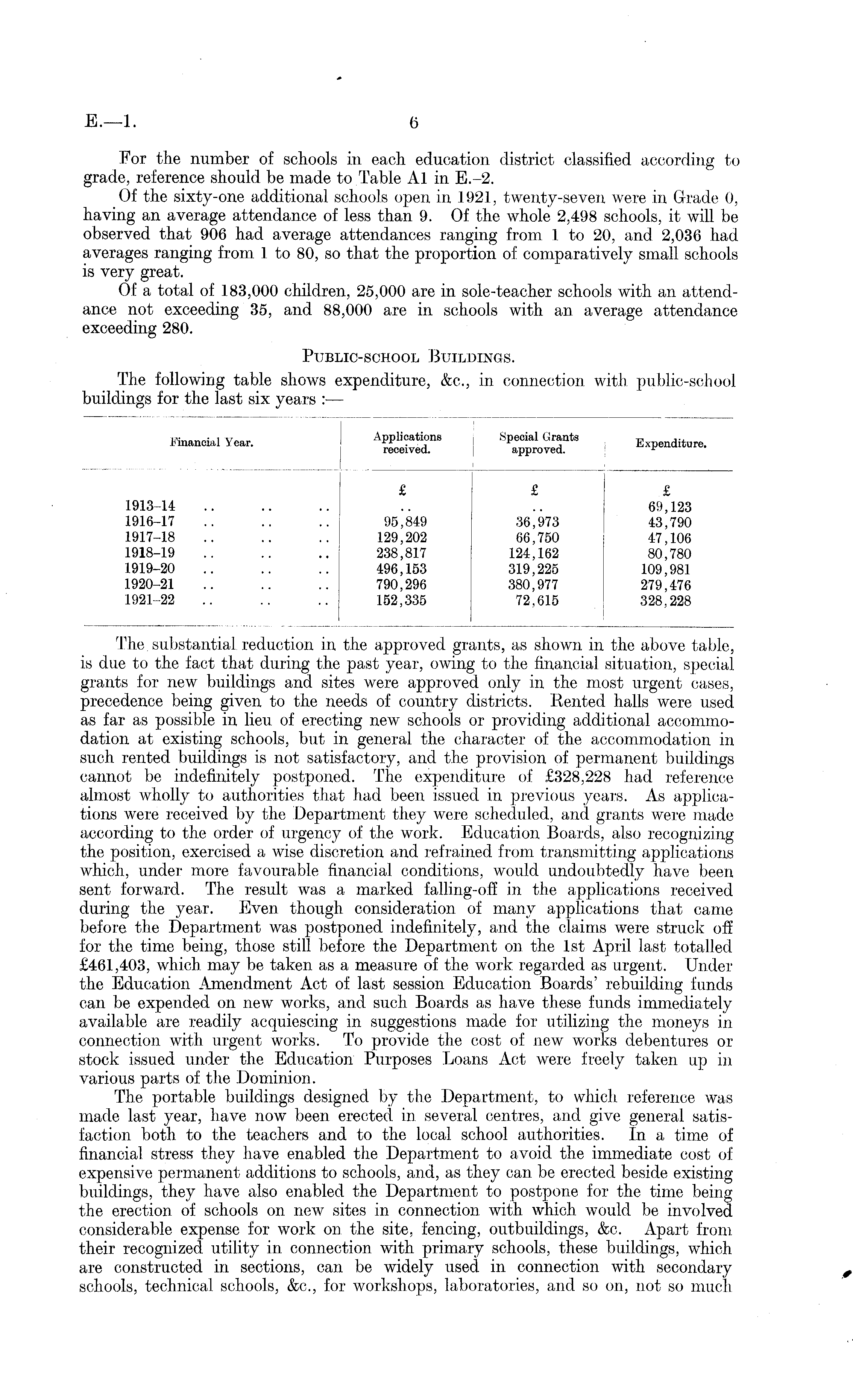 For the number of schools in each education district classified according to grade, reference should be made to Table Al in E.-2. Of the sixty-one additional schools open in 1921, twenty-seven were in Grade; 0, having an average attendance of less than 9. Of the whole 2,498 schools, it will be observed that 906 had average attendances ranging from 1 to 20, and 2,036 had averages ranging from I to 80, so that the proportion of comparatively small schools is very great. Of a total of 183,000 children, 25,000 are in sole-teacher schools with an attendance not exceeding 35, and 88,000 are in schools with an average attendance exceeding 280. Public-school Buildings. The following table shows expenditure, &c, in connection with public-school buildings for the last six years : —