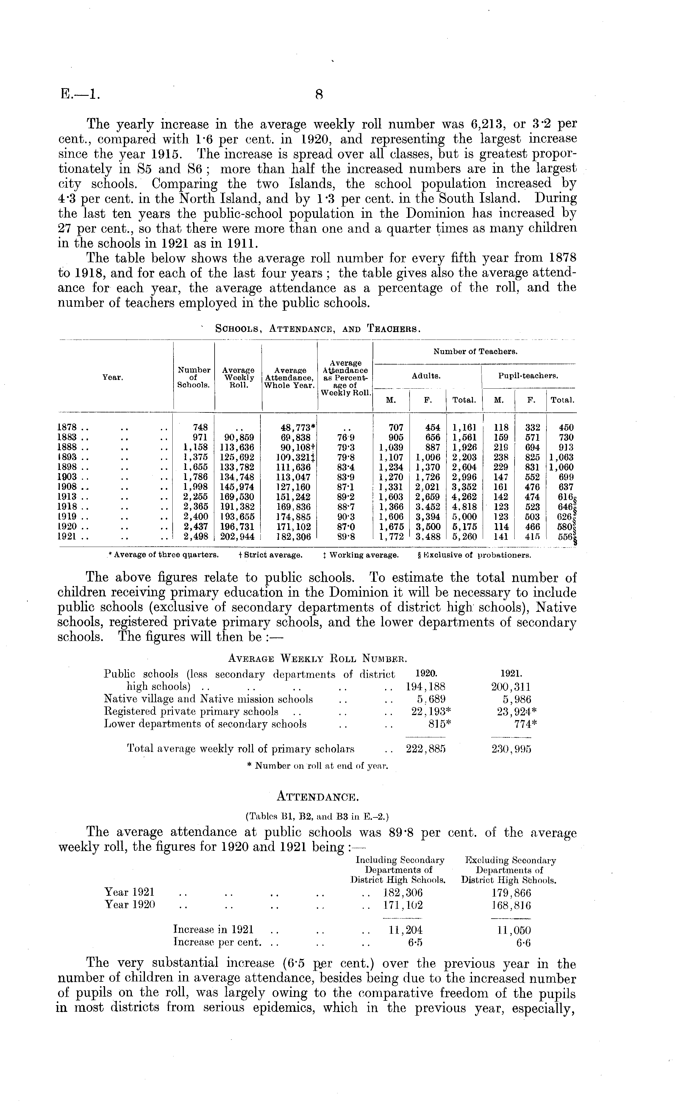 Year. Average Number Average Average Attendance of Woekly Attendance, as PercentSchools. Roll. Whole Year. age of Weekly Roll. Adults. M. P. Number of Teachers. Pupil-teachers. I Total. M. F. Total. 1878 .. 1883 .. 1888 .. 1893 .. 1898 .. 1903 .. 1908 ... 1913 .. 1918 .. 1919 .. 1920 .. 1921 .. 748 971 1,158 1,375 1,655 1,786 1,998 2,255 2,365 2,400 2,437 2,498 90,859 113,636 125,692 133,782 134,748 145,974 169,530 191,382 193,655 196,731 202,944 48,773* 69,838 90,108+ 100,321} 111,636 113,047 127,160 151,242 169,836 174,885 171,102 182,306 769 79-3 79-8 83-4 83-9 87T 89-2 88-7 90-3 87-0 89-8 707 905 1,039 1.107 1,234 1,270 1,331 1,603 1,366 1,606 1,675 1,772 454 656 887 1,096 1,370 1,726 2,021 2,659 3.452 3,394 3,500 3,488 1,161 1,561 1,926 2,203 2,604 2,996 3,352 4,262 4,818 5.000 5,175 5,260 118 159 218 238 229 147 161 142 123 123 114 141 332 571 694 825 831 552 476 474 523 503 466 415 450 730 913 1,063 1,060 699 637 616, 646? 626? 580? 556| 'obatio; * Average of three quarters. t Strict average. J Working a 'erage. _ Exclusive of p: iers.