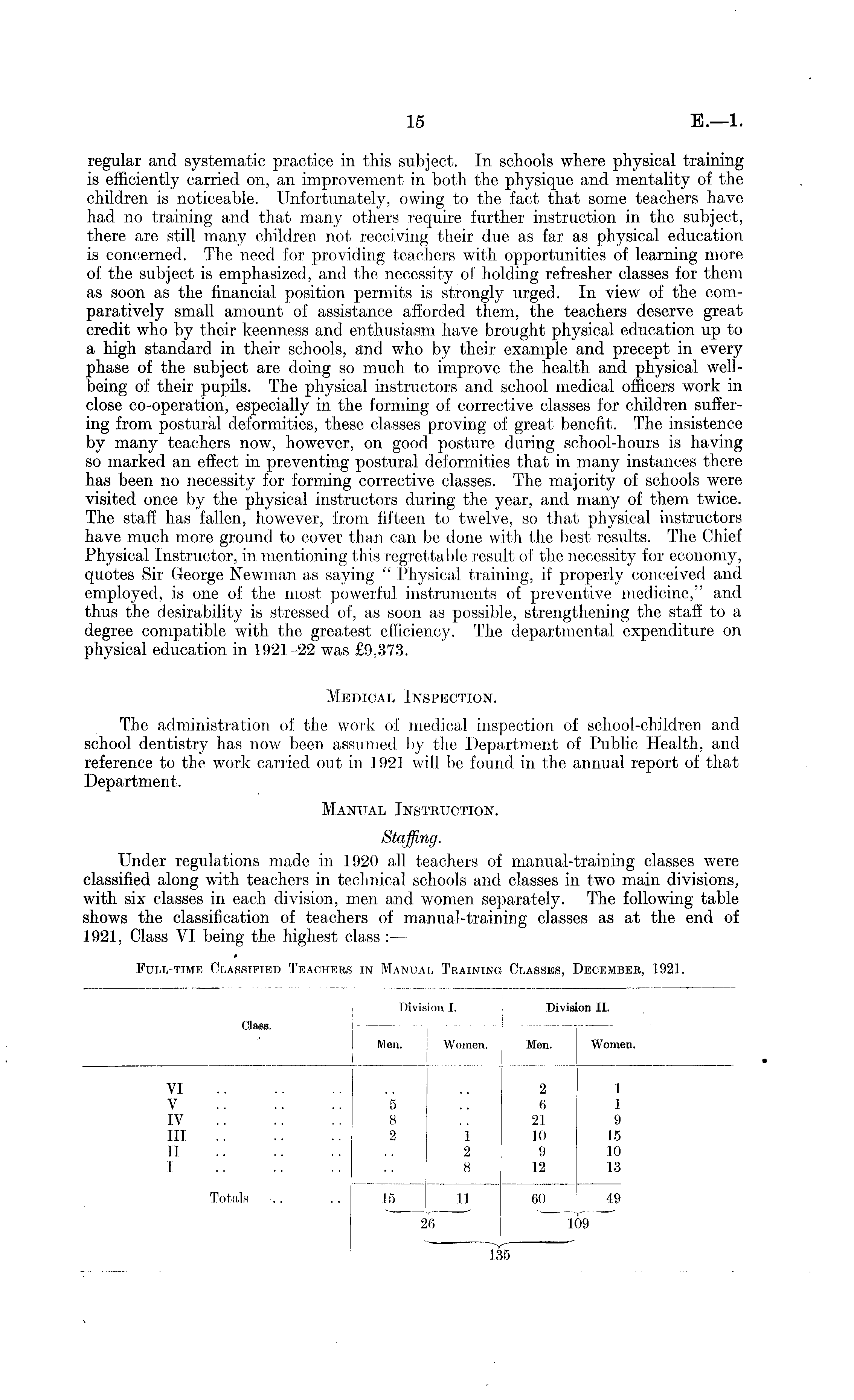 regular and systematic practice in this subject. In schools where physical training is efficiently carried on, an improvement in both the physique and mentality of the children is noticeable. Unfortunately, owing to the fact that some teachers have had no training and that many others require further instruction in the subject, there are still many children not receiving their due as far as physical education is concerned. The need for providing teachers with opportunities of learning more of the subject is emphasized, and the necessity of holding refresher classes for them as soon as the financial position permits is strongly urged. In view of the comparatively small amount of assistance afforded them, the teachers deserve great credit who by their keenness and enthusiasm have brought physical education up to a high standard in their schools, and who by their example and precept in every phase of the subject are doing so much to improve the health and physical wellbeing of their pupils. The physical instructors and school medical officers work in close co-operation, especially in the forming of corrective classes for children suffering from postural deformities, these classes proving of great benefit. The insistence by many teachers now, however, on good posture during school-hours is having so marked an effect in preventing postural deformities that in many instances there has been no necessity for forming corrective classes. The majority of schools were visited once by the physical instructors during the year, and many of them twice. The staff has fallen, however, from fifteen to twelve, so that physical instructors have much more ground to cover than can be done with the best results. The Chief Physical Instructor, in. mentioning this regrettable result of the necessity for economy, quotes Sir George Newman as saying " Physical training, if properly conceived and employed, is one of the most powerful instruments of preventive .medicine," and thus the desirability is stressed of, as soon as possible, strengthening the staff to a degree compatible with the greatest efficiency. The departmental expenditure on physical education in 1921-22 was £9,373. Medical Inspection. The administration of the work of medical inspection of school-children and school dentistry has now been assumed by the Department of Public Health, and reference to the work carried out in 1921 will be found in the annual report of that Department. Manual Instruction. Staffing. Under regulations made in 1920 all teachers of manual-training classes were classified along with teachers in technical schools and classes in two main divisions, with six classes in each division, men and women separately. The following table .shows the classification of teachers of manual-training classes as at the end of 1921, Class VI being the highest class : —