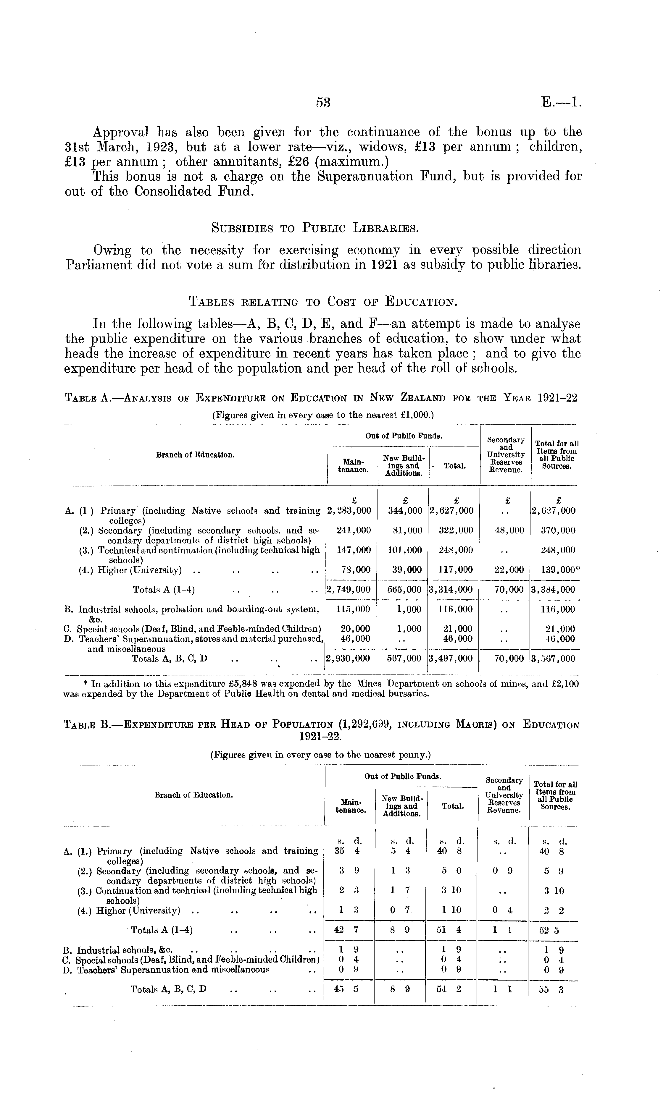 Approval has also been given for the continuance of the bonus up to the 31st March, 1923, but at a lower rate—viz., widows, £13 per annum ; children, £13 per annum ; other annuitants, £26 (maximum.) This bonus is not a charge on the Superannuation Fund, but is provided for out of the Consolidated Fund. Subsidies to Public Libraries. Owing to the necessity for exercising economy in every possible direction Parliament did not vote a sum for distribution in 1921 as subsidy to public libraries. Tables relating to Cost of Education. In the following tables —A, B, C, D, E, and F —an attempt is made to analyse the public expenditure on the various branches of education, to show under what heads the increase of expenditure in recent years has taken place ; and to give the expenditure per head of the population and per head of the roll of schools.