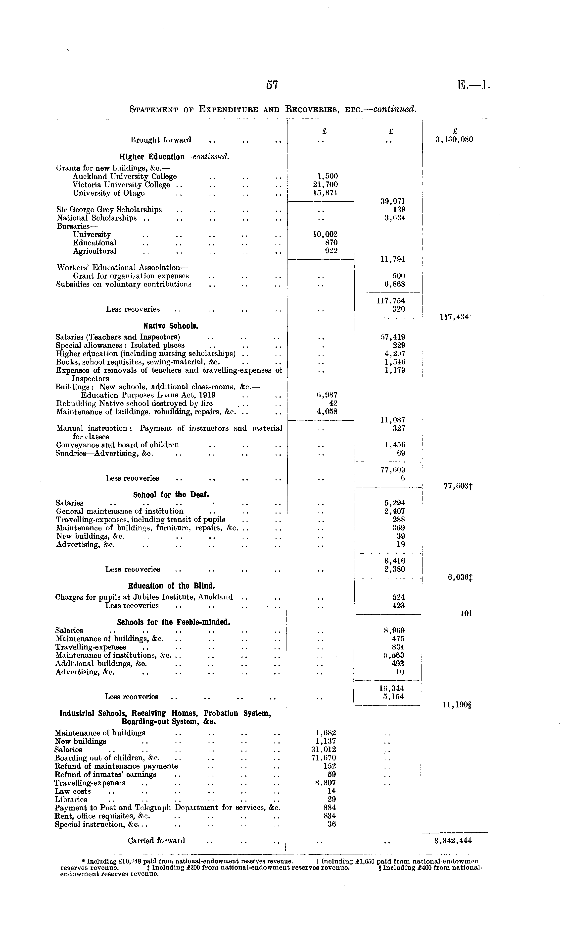 Brought forward £ £ £ 3,130,080 Higher Education — continued. Grants for new buildings, &c. —■ Auckland University College .. .. .. 1.500 Victoria University College .. .. .. .. 21,700 University of Otago .. .. .. .. 15,871 I 39.071 1.500 21,700 15,871 —■—'——• OH, U M Sir George Grey Scholarships .. .. .. .. .. 139 National Scholarships .. .. .. .. .. .. j 3,634 BursariesUniversity .. .. .. .. .. 10,002 Educational .. .. .. .. 870 Agricultural . . .. .. .. .. 922 11.794 —-— I 39,071 139 3,634 10,002 870 922 Workers' Educational Association— Grant for organization expenses .. .. .. .. 500 Subsidies on voluntary contributions .. .. .. .. 6,868 11,794 500 6,868 117,754 320 117,754 Less recoveries .. .. .. .. .. 320 Native Schools. 117,434* Salaries (Teachers and Inspectors) .. .. .. .. 57,419 Special allowances: Isolated plaoes .. .. .. . 229 Higher education (including nursing scholarships) .. .. .. 4,297 Books, school requisites, sewing-material, &c. .. .. .. 1,546 Expenses of removals of teachers and travelling-expenses of .. 1,179 Inspectors Buildings : New schools, additional class-rooms, &c.—■ Education Purposes Loans Aot, 1919 .. .. 6,987 Rebuilding Native school destroyed by fire ... .. 42 Maintenance of buildings, rebuilding, repairs, &c. .. .. 4,058 ■ ■ 11.087 57,419 229 4,297 1,546 1,179 6,987 42 4,058 11,087 327 . 11,US7 Manual instruction: Payment of instructors and material .. 327 for classes Conveyance and board of children .. .. .. .. 1,456 Sundries—Advertising, &c. .. .. .. .. .. 69 1,456 69 77,609 Less recoveries .. .. .. .. .. 6 77,609 6 School for the Deaf. Salarios .. .. .. • .. .. .. 5,294 General maintenance of institution .. .. .. .. 2,407 Travelling-expenses, including transit of pupils .. .. .. 288 Maintenance of buildings, furniture, repairs, &c. .. .. . . 369 New buildings, &c. .. .. .. .. .. .. 39 Advertising, &o. .. .. .. .. .. .. 19 5,294 2,407 288 369 39 19 77,603f 8,416 Less recoveries .. .. .. .. .. 2,380 8,416 2,380 6.036J Education of the Blind. 524 423 Charges for pupils at Jubilee Institute, Auckland .. .. .. 524 Less recoveries .. .. .. .. .. 423 Schools for the Feeble-minded. 101 Salaries .. .. .. .. .. .. .. 8,969 Maintenance of buildings, &c. .. .. .. .. .. 475 Travelling-expenses .. .. .. .. .. .. 834 Maintenance of institutions, &c. .. .. .. .. .. 5,563 Additional buildings, <fcc. .. .. .. .. .. 493 Advertising, .fee. .. .. .. .. .. .. 10 8,969 475 834 5,563 493 10 in mi 16,344 Less recoveries .. .. .. .. .. 5,154 16,344 5,154 11,190. Industrial Schools, Receiving Homes, Probation System, Boarding-out System, &c. Maintenance of buildings .. .. .. .. 1,682 New buildings .. .. .. .. .. 1,137 Salaries .. .. .. .. .. .. 31,012 Boarding out of children, &c. .. .. .. .. 71,670 Refund of maintenance payments .. .. .. 152 Refund of inmates' earnings .. .. .. .. 59 Travelling-expenses .. .. .. . . .. 8,807 Law costs .. .. . . .. .. .. 14 Libraries .. . • •. ■. . • .. 29 Payment to Post and Telegraph Department for services, &c. 884 Rent, office requisites, &c. .. .. .. .. 834 Special instruction, &c... .. .. . . .. 36 Carried forward 3,342,444 * Including £10,248 paid from national-endowment roserves revenue. t Including £1,050 paid from nai reserves revenue. J Including £200 from national-endowment reserves revenue. § Including £ endowment reserves revenue. tional-endowmen 1400 from national