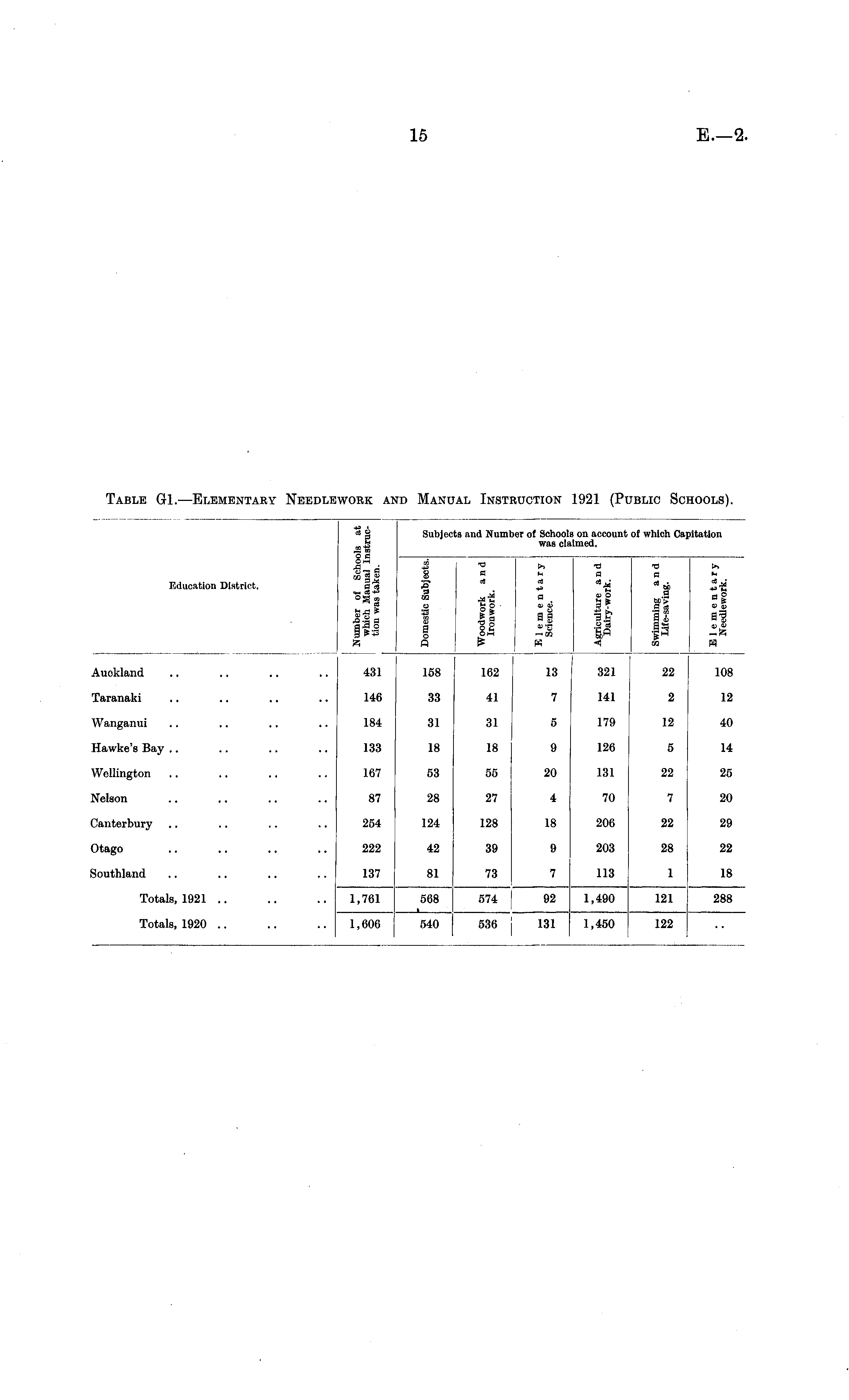 Table G1. —Elementary Needlework and Manual Instruction 1921 (Public Schools).