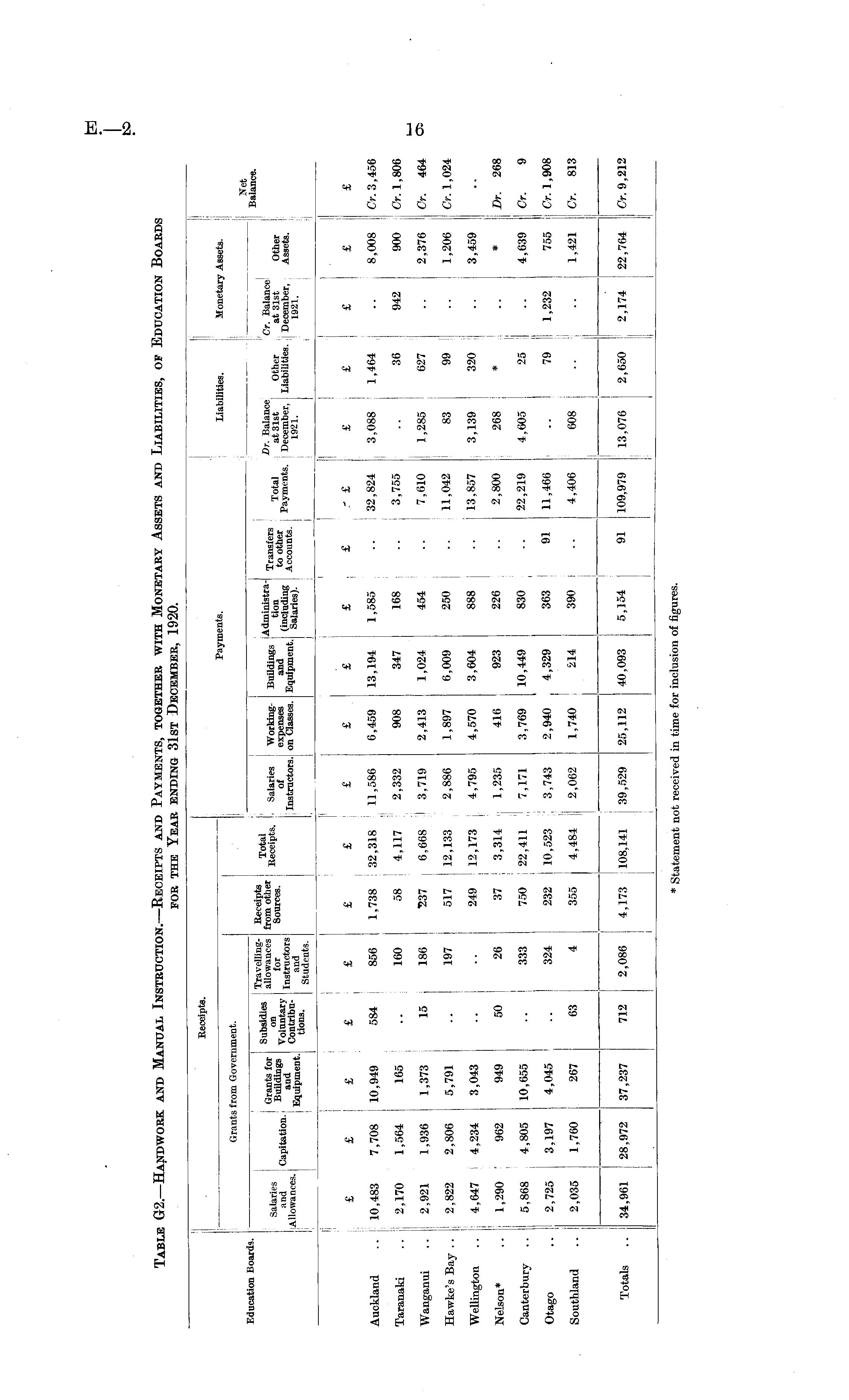Table G2.—Handwork and Manual Instruction.— Receipts and Payments, together with Monetary Assets and Liabilities, of Education Boards for the Year ending 31st December, 1920.