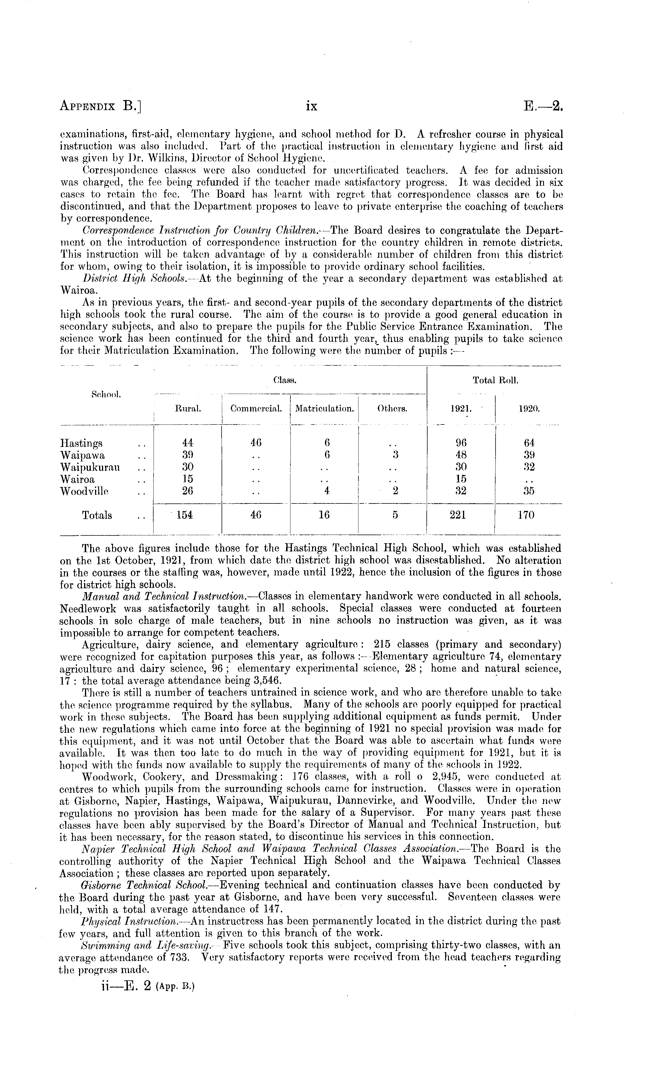 I School. Clai IS. Total Boll. Rural. Commercial. Matriculation. Others. 1921. 1920. Hastings Waipawa Waipukurau Wairoa Woodville 44 39 30 15 26 46 6 6 3 96 48 30 15 32 64 39 32 4 2 35 Totals 154 46 Ki 5 221 .170