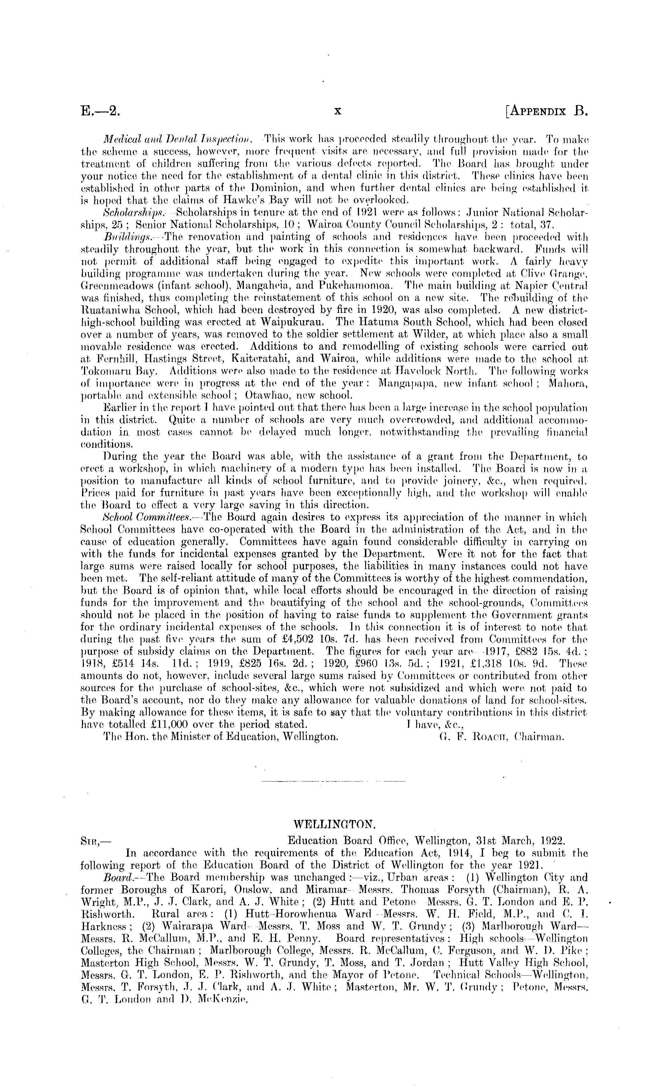 WELLINGTON. Sir,— Education Board Offie'e, Wellington, 31st March, 1922. In accordance with tho requirements of the Education Act, 1914, I beg to submit the following report of the Education Board of the District of Wellington for the: year 1921. Board. —The Board membership was unchanged: —viz., Urban areas: (I) Wellington City and former Boroughs of Karori, Onslow, and Miramar- Messrs. Thomas Forsyth (Chairman), R. A. Wright, M.P., J. J. Clark, and. A. J. White ; (2) Hutt anel Petone Messrs. G. T. London and E. P. Rishworth. Rural area: (1) Hutt ,Horowhe:nua Ware! Messrs. W. 11. Field, M.P., anel C. I. Harkness; (2) Wairarapa Ward Messrs. T. Moss and W. T. Grundy; (3) Marlborough WardMessrs. R. McCallum, M.P., and E. H. Penny. Board representatives : High schools- Wellington Colleges, the Chairman ; Marlborough College, Messrs. R. McCallum, C. Feirguson, and W. I). Pike ; Masterton High School, Messrs. W. T. Grundy, T. Moss, and T. Jordan ; Hutt Valley High School, Messrs. G. T. London, E. P. Rishworth, and the Mayor of Pet One. Technical Schools —Wellington, Messrs. T. Forsyth, J. J. Clark, anel A. J. White; Masterton, Mr. W. T. Grundy; Petone, Messrs, G, T, London and D. MoKenzie,