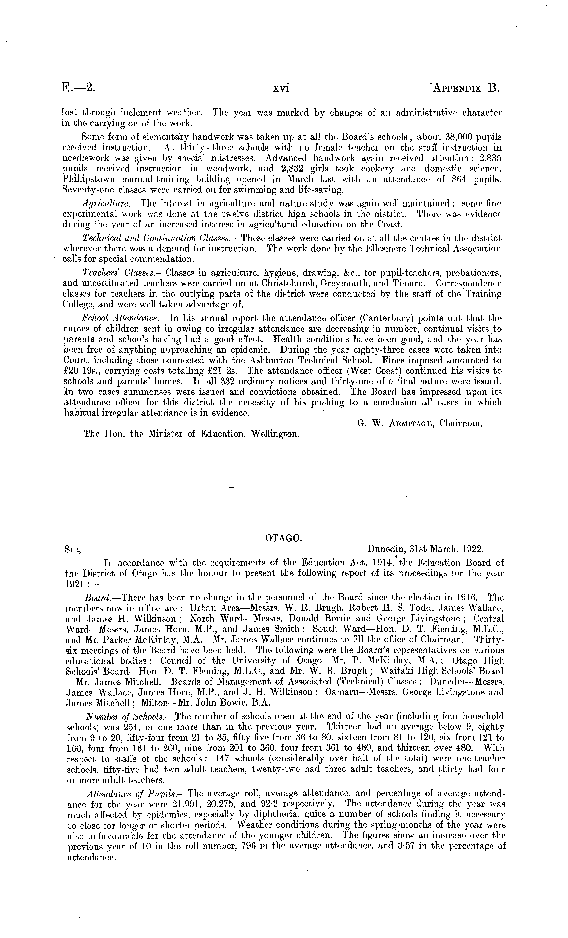 OTAGO. Sir,— Dunedin, 31st March, 1922. In accordance with the requirements of the Education Act, 1914, the Education Board of the District of Otago has the: honour to present the following report of its proceedings for the year 1921 :— Board. —There has been no change in tho personnel of the Board since the election in 1916. The members now in office: are:: Urban Area —Messrs. W. R. Brugh, Robe:rt H. S. Todd, James Wallace, and James H. Wilkinson ; North Ward- Messrs. Donald Borrie and George Livingstone ; Central Ward—Messrs. James Horn, M.P., and James Smith ; South Ward—Hon. D. T. Fleming, M.L.C., and Mr. Parker McKinlay, M.A. Mr. James Wallace continues to fill the office; of Chairman. Thirtysix meetings of the Beiarel have been he;ld. The following were the Boarei's representatives on various educational bodies : Council of the University of Otago—Mr. P. McKinlay, M.A. ; Otago High Schools' Board—Hon. D. T. Fleming, M.L.C., and Mr. W. R, Brugh ; Waitaki High Schools' Board —Mr. James Mitchell. Boards of Management of Associated (Technical) Classes : Dunedin— Messrs. James Wallace, James Horn, M.P., and J. H. Wilkinson ; Oamaru- Messrs. George Livingstone: and James Mitchell ; Milton—Mr. John Bowie, B.A. Number of Schools- The: number of schools open at the end of the year (including four household schools) was 254, or one: more than in the previous year. Thirteen had an average below 9, eighty from 9 to 20, fifty-four from 21 to 35, fifty-five from 36 to 80, sixteen from 81 to 120, six from 121 to 160, four from 161 to 200, nine from 201 to 360, four from 361 to 480, and thirteen over 480. With respect to staffs of the schools : 147 schools (considerably over half of the total) were one-teacher schools, fifty-five had two adult teachers, twenty-two had three adult teachers, and thirty had four eir more adult teachers. Attendance of Pupils. —The average roll, average attendance, and percentage of average attendance for the year were: 21,991, 20,275, and 922 respectively. The: attendance during the: year was much affected by epidemics, especially by diphtheria, quite a number of schools finding it necessary to close for longer or shorter periods. Weather conditions during the: spring -months of the year were also unfavourable for the attendance of the younge:r children. The: figures show an increase over the: previous year of 10 in the; roll number, 796 in the average attendance, and 3-57 in the percentage of attendance.