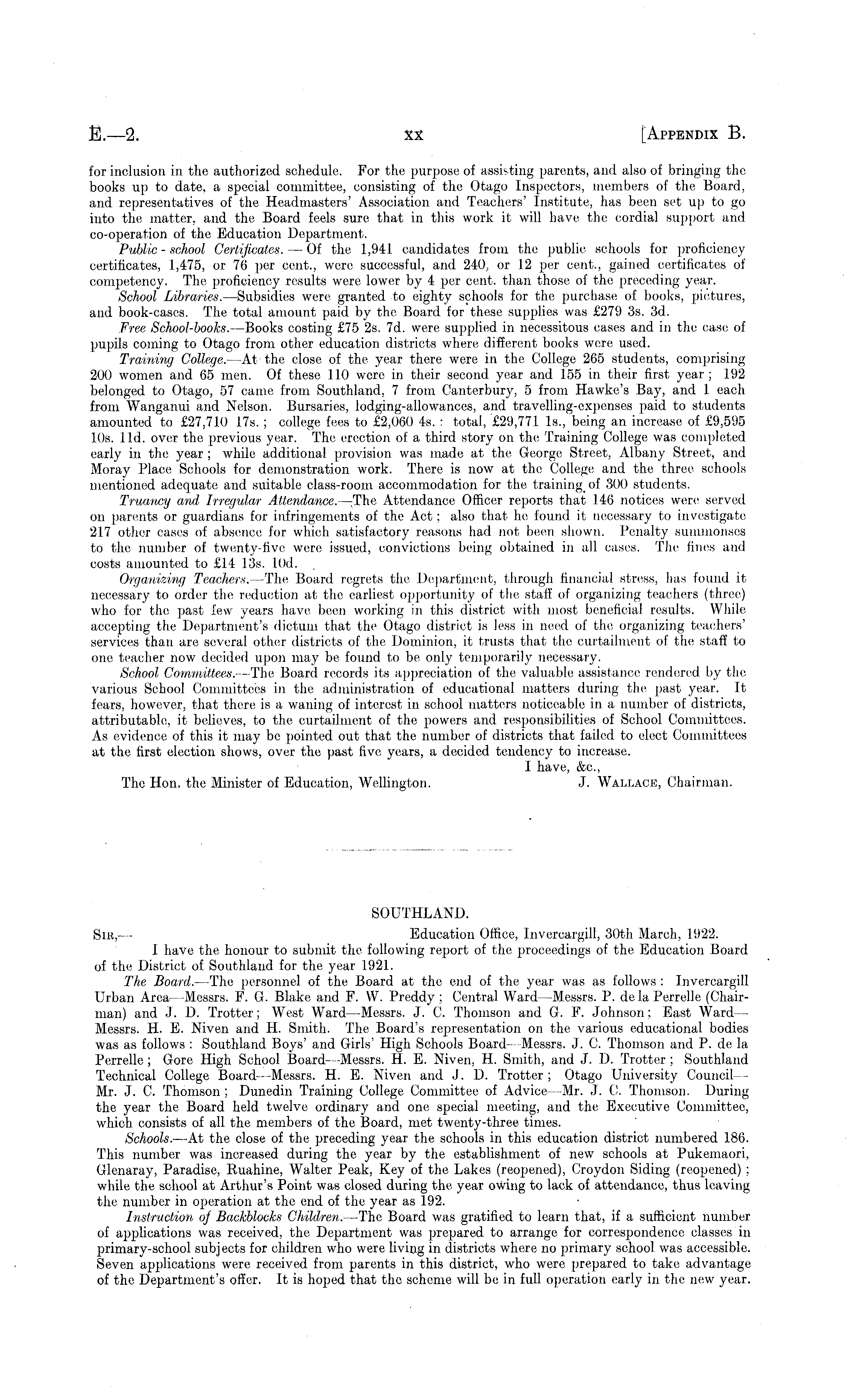 SOUTHLAND. Sir,-- Education Office, Invercargill, 30th March, 1922. I have the honour to submit the following report of the proceedings of the Education Board of the District of Southland for the year 1921. The Board. —The personnel of the Board at the end of the year was as follows : Invercargill Urban Area—Messrs. F. G. Blake and F. W. Preddy ; Central Ward—Messrs. P. delaPerrelle (Chairman) and J. D. Trotter; West Ward—Messrs. J. C. Thomson and G. F. Johnson; East WardMessrs. H. E. Niven and H. Smith. The; Board's representation on the various educational bodies was as follows : Southland Boys' and Girls' High Schools Board Messrs. J. C. Thomson and P. de la Pe:rrelle; Gore High School Board -Messrs. H. E. Niven, H. Smith, and J. D. Trotter ; Southland Technical College Board—Messrs. H. E. Niven and J. D. Trotter; Otago University Council— Mr. J. C. Thomson ; Dunedin Training College Committee of Advice- -Mr. J. C. Thomson. During the year the Board held twelve ordinary and one special meeting, and the Executive Committee, which consists of all. the members of the Board, met twenty-three times. Schools. —At the close of the preceding year the schools in this education district numbered 186. This number was increased during the year by the establishment of new schools at Pukemaori, Glenaray, Paradise, Ruahine, Walter Peak, Key of the Lakes (reopened), Croydon Siding (reopened) : while the school at Arthur's Point was closed during the year owing to lack of attendance, thus leaving the number in operation at the end of the year as 192. Instruction of Backblocks Children. —The Board was gratified to learn that, if a sufficient number of applications was received, the Department was prepared to arrange for correspondence classes in primary-school subjects for children who were living in districts where no primary school was accessible. Seven applications were received from parents in this district, who were prepared to take advantage of the Department's offer. It is hoped that the scheme will be in full operation early in the new year.