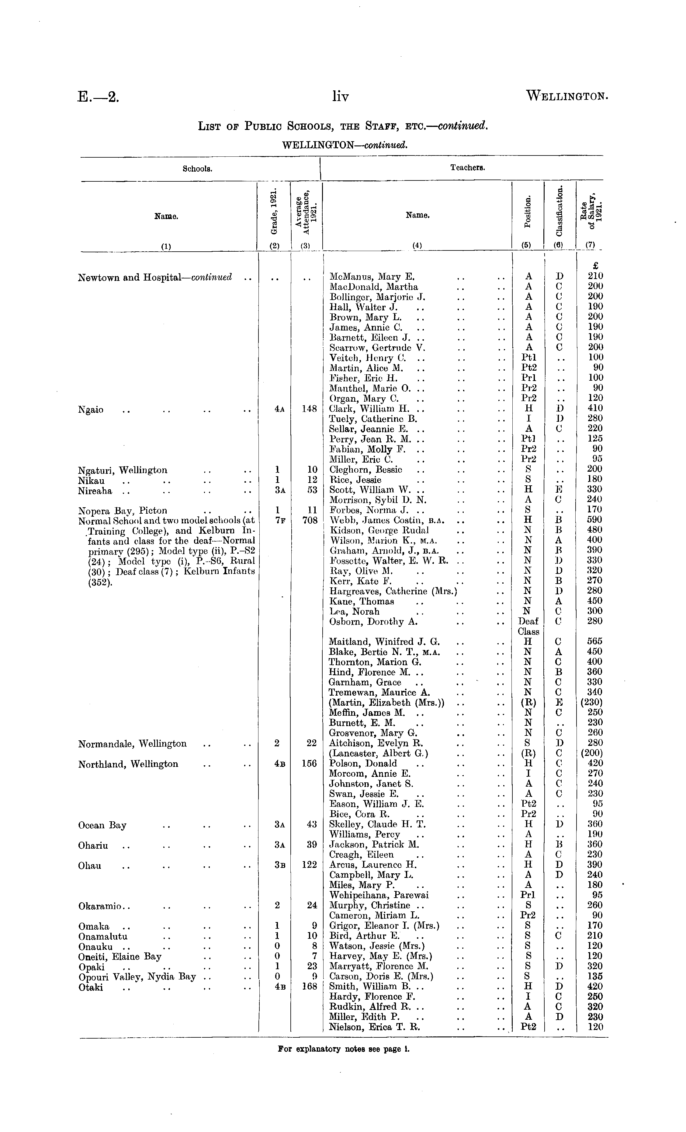 Schools. Teachers. Name. i-i I <21 rt ir-l fr-'O tM 3 <§>_ Name, o Ph (5) d 1 1 I o W "8 (1) (4) (7) Newtown and Hospital— continued Ngaio Ngaturi, Wellington Nikau Nireaha 4a 1.48 McManus, Mary E. MacDonald, Martha Bollinger, Marjorie J. Hall, Walter J. Brown, Mary L. .. James, Annie C. .. Barnett, Eileen J. .. Scarrow, Gertrude V. Veitch, Henry C. .. Martin, Alice M. .. Fisher, Erio H. Manthel, Marie 0. .. Organ, Mary C. Clark, William II. Tuely, Catherine B. Sellar, Jeannie E. .. Perry, Jean R. M. .. Fabian, Molly F. .. Miller, Eric C. Cleghorn, Bessie Rice, Jessie Scott, William W. .. Morrison, Sybil D. N. Forbes, Norma J. .. Webb, James Costin, b.a. Kidson, George Rudal Wilson, Marion K., M.A. Graham, Arnold, J., b.a. Fossotte, Walter-, E. W. R. . . Ray, Olive M. Kerr, Kate F. Hargroavcs, Catherine (Mrs.) Kane, Thomas Lea, Norah Osborn, Dorothy A. A A A A A A A A Ptl Pt2 Prl Pi-2 Pr2 H I A Ptl Pr2 Pr2 g S H A S H N N N N N N N N N Deaf Class H N N N N N (R) N N N S (R) H I A A Pt2 Pr2 H A H A H A A Prl S Pr2 S S s g g g H I A A Pt2 D C C C C C C C I) D C £ 210 200 200 190 200 190 190 200 100 90 100 90 120 410 280 220 125 90 95 200 180 330 240 170 590 480 400 390 330 320 270 280 450 300 280 1 1 3a 10 12 53 E C Nopera Bay, Picton Normal School and two model schools (at .Training College), and Kelburn Infants and class for the deaf—Normal primary (295); Model type (ii), P.-g2 (24); Model typo (i), P.-SO, Rural (30); Deaf class (7); Kelburn Infants (352). 1 7 k 11 708 B B A B D I) B D A C C Normandale, Wellington Northland, Wellington Ocean Bay 2 4b 3a 22 156 43 Maitland, Winifred J. G. Blake, Bertie N. T., m.a. Thornton, Marion G. Hind, Florence M. .. Garnham, Grace, Tremewan, Maurice A. (Martin, Elizabeth (Mrs.)) .. Meffin, James M. .. Burnett, E. M. Grosvenor, Mary G. Aitchison, Evelyn R. (Lancaster, Albert G,) Poison, Donald Morcom, Annie E. Johnston, Janet S. Swan, Jessie E. Eason, William J. E. Bice, Cora R. Skelley, Claude H. T. Williams, Percy Jackson, Patrick M. Creagh, Eileen Arcus, Laurence H. Campbell, Mary L. Miles, Mary P. Wehipeihana, Parewai Murphy, Christine Cameron, Miriam L. Grigor, Eleanor I. (Mrs.) Bird, Arthur E. Watson, Jessie (Mrs.) Harvey, May E. (Mrs.) Marryatt, Florence M. Carson, Doris E. (Mrs.) Smith, William B. .. Hardy, Florence F. Rudkin, Alfred R. .. Miller, Edith P. Nielson, Erica T. R. C A C B C C 15 c c I) c c c c c b B c I) I) 565 450 400 360 330 340 (230) 250 230 260 280 (200) 420 270 240 230 95 90 360 190 360 230 390 240 180 95 260 90 170 210 120 120 320 135 420 250 320 230 120 Ohariu 3a 39 Ohau 3 b 122 Okaramio.. 2 24 Omaka Onamalutu Onauku Oneiti, Elaine Bay Opaki Opouri Valley, Nydia Bay Otaki 1 1 0 0 1 0 4b 9 10 8 7 23 9 168 c b D c c I) I'm explani itory notes sec lage i.