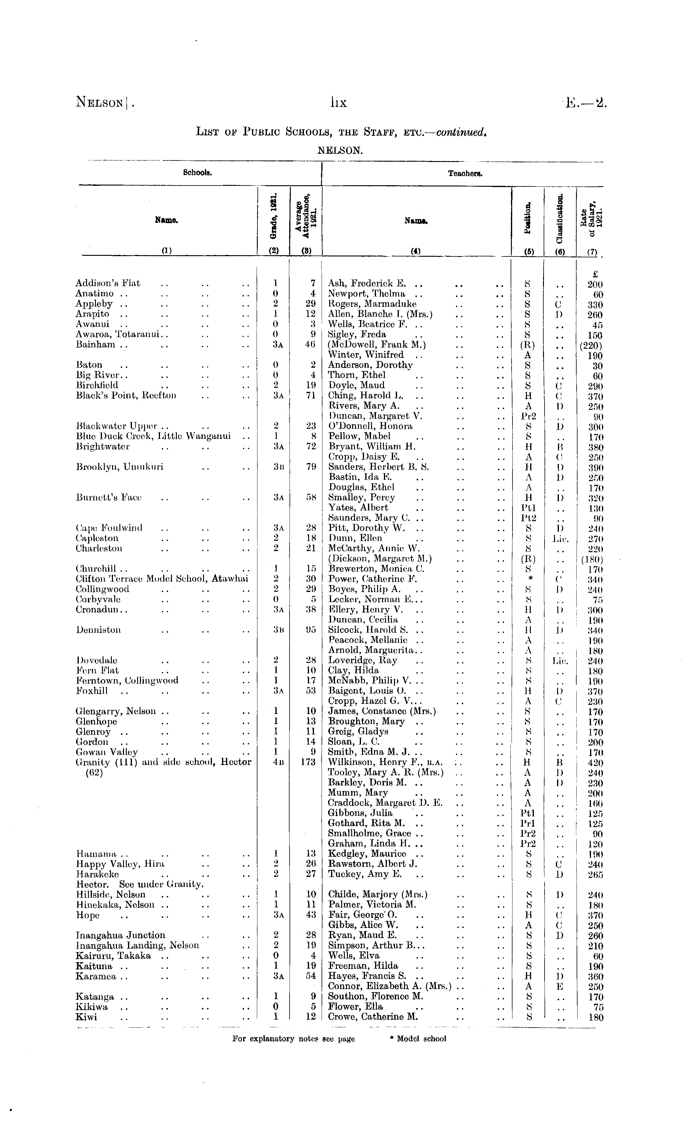 Schools. Teachers. Name. I rf 1 lid <i Nanu. 4 o i Ch § cd 1 v SSh eel 73 4» aa, pHtfin o (1) <?> (3) («) .(&) (7) («) Addison's Flat Anatimo Appleby Arapito Awanui Awaroa, Totaranui, . Bainham Baton Big River.. Birchlielil Black's Point, Reefton Blackwater Upper Blue Duck Creek, Little Wanganui Brightwater Brooklyn, Umukuri Burnett's Face Cape Foulwind Capleston Charleston Churchill Clifton Terrace Model School, Atawhai Collingwood Corbyvale Cronadun 1 0 2 1 0 0 3a 0 0 2 3a 2 1 3a 3n 3a 3a 2 2 1 2 2 0 3a 7 4 29 12 3 9 46 2 4 19 71 23 8 72 79 58 28 18 21 15 30 29 5 38 Ash, Frederiok 15. Newport, Thelma Rogers, Marmaduke Allen, Blanche I. (Mrs.) Wells, Beatrice F. Sigley, Freda (McDowell, Frank M.) Winter, Winifred Anderson, Dorothv Thorn, Ethel Doyle, Maud Ching, Harold L. Rivers, Mary A. Duncan, Margaret V. O'Donnell, Honora Pellow, Mabel Bryant, William H. Cropp, Daisy 15. Sanders, Herbert B. S. Bastin, Ida 15. Douglas, Ethel Smalley, Percy Yates, Albert Saunders, Mary C. .. Pitt, Dorothy W. .. Dunn, 1511cn McCarthy, Annie W. (Dickson', Margaret M.) Brewer-ton, Monica C. Power, Catherine F. ... Boyes, Philip A. Locker, Norman E... Ellery, Henry V. .. Duncan, Cecilia Silcock, Harold g. . . Peacock, Mellanie Arnold, Marguerita.. Loveridge, Ray Clay, Hilda McNabb, Philip V. .. Baigent, Louis O. . . Cropp, Hazel G. V.. . James, Constance (Mrs.) Broughton, Mary Greig, Gladys gloan, L. C. gmith, !5dnaM. J. . . Wilkinson, Henry F., n.A. ; . Tooloy, Mary A.'it. (Mrs.) .. Barkley, Doris M. .. Mumm, Mary Craddock, Margaret I). E. Gibbons, Julia Gothard, Rita 11. gmallholme, Grace Graham, Linda 11. .. Kedglcy, Maurice Rawstorn, Albert J. Tuckcy, Amy 15. S S S S S S (R) A S S g H A Pr2 g g II A H A A H Ptl Pt2 g S g (tt) S C I) C C I) I) B (! I) 1) D i> Lie. c I) i) b Lie. I) (J B I) D C D £ 200 60 330 260 45 150 (220) 190 30 60 290 370 250 110 300 170 380 250 390 250 170 320 130 90 240 270 220 (180) 170 340 240 75 300 190 340 190 180 240 180 190 370 230 170 170 170 200 170 420 240 230 200 160 125 125 90 120 190 240 265 Donniston 3b 95 s g II A II A A S Dovedale Pern Flat Kerntowrr, Collingwood Foxhill .. 2 1 1 3a 28 10 17 53 S Glengarry, Nelson Glenhope Gienroy Gordon Gowan Valley Granity (111) and side school, Hector (62)' 1 1 1 1 1 Ii: 10 13 11 14 9 173 S IT A S S S g Hamama Happy Valloy, Hira Harakeke Hector. See under Granity. Hillside, Nolson Hinekaka, Nelson g H A A A A Ptl Prl Pr2 Pr2 g S S I o 2 13 26 27 Hope I nangahua J unction Inangahua Landing, Nelson Kairuru, Takaka Kaituna Karamea I 1 3a 2 2 0 1 3a 10 11 43 28 19 4 19 54 Clulde, Marjory (Mrs.) Palmer, Victoria M. Fair, George' O. Gibbs, Alice W. Ryan, Maud E. gimpson, Arthur B... Wells, Elva Freeman, Hilda Hayes, Francis g. .. Connor, Elizabeth A. (Mrs.) .. gouthon, Florence M. Flowor, Ella Crowe, Cathorine M. s s IT A S s g g H A g g g 1) C c I) I) 15 240 180 370 250 260 210 60 190 360 250 170 75 180 Katanga Kikiwa Kiwi 1 0 1 9 5 12 For e: Lplanatoi notes sec page * Model school