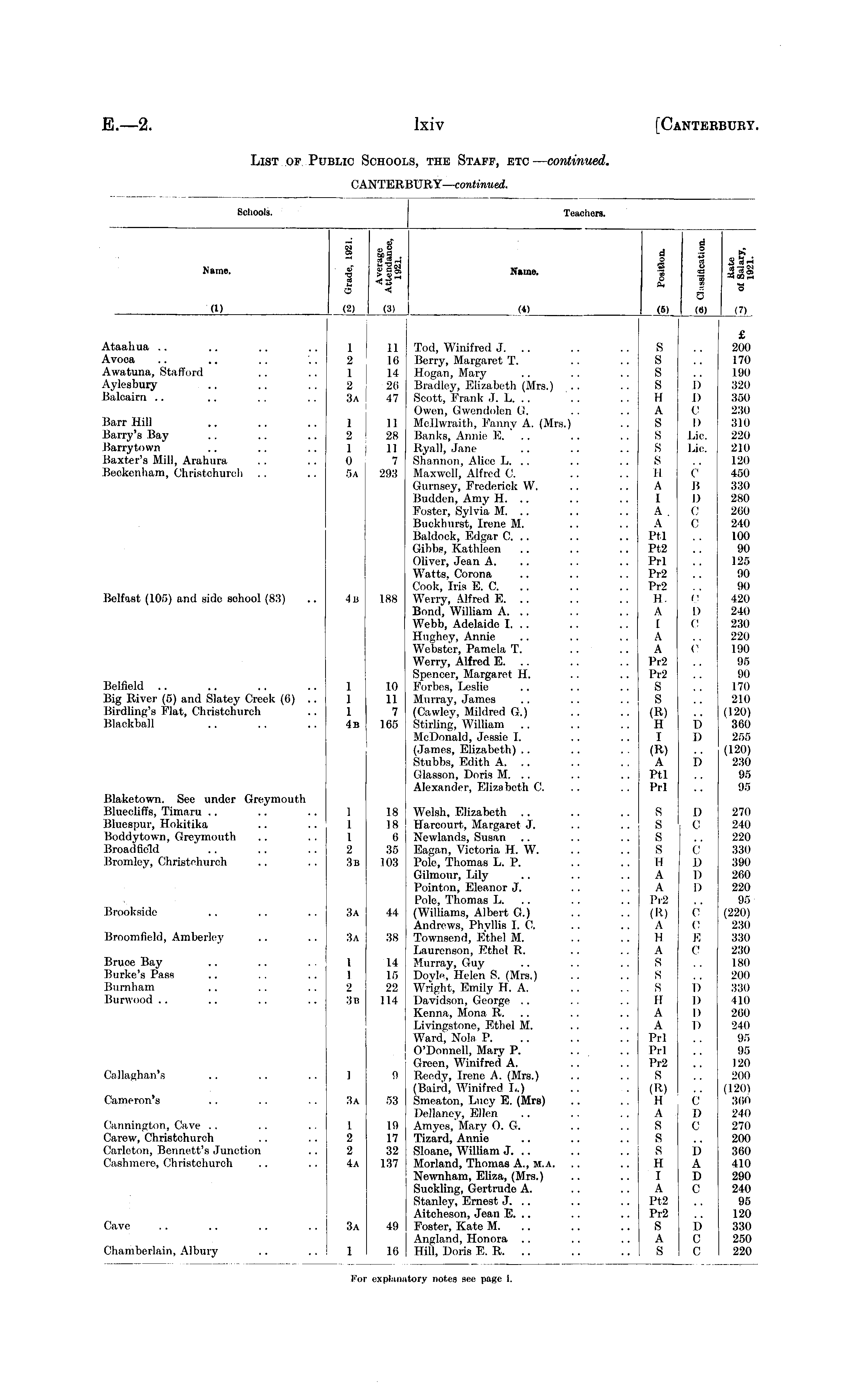 Schools. Teachers. Name. IN o> of 3 o (2) to to ° m>9 . (4*4 iii ■4 Name. A A I I | o "53 a, « O (5) («) sa--a —i 2) *<22 •3 (7) (O (l) (3) Ataahua Avoca Awatuna, Stafford Aylesbury Balcairn Barr Hill Barry's Bay Barrytown Baxter's Mill, Arahura Beckcnham, Christchurch Belfast (105) and side school (83) 1 2 1 2 3a 1 2 1 0 5a 11 16 14 26 47 11 28 11 7 293 Tod, Winifred J. .. Berry, Margaret T. Hogan, Mary Bradley, Elizabeth (Mrs.) .. gcott, Frank J. L. .. Owen, Gwendolen G. Mellwraith, Fanny A. (Mrs.) Banks, Annie 15. Ryall, Jane Shannon, Alice L. .. Maxwell, Alfred C. Gurnsey, FYederick W. Budden, Amy H. .. Foster, gylvia M. .. Buckhurst, Irene M. Baldock, Edgar C. .. Gibbs, Kathleen Oliver, Jean A. Watts, Corona Cook, Iris E. C. Werry, Alfred E. Bond, William A. .. Webb, Adelaide I. .. Hughey, Annie Webster, Pamela T. Werry, Alfred E. .. gpencer, Margaret H. Forbes, Leslie Murray, James (Cawley, Mildred G.) gtirling, William McDonald, Jessie I. (James, Elizabeth) gtubbs, Edith A. .. Glasson, Doris M. .. Alexander, Elizabeth C. S S s s II A s s s s If A 1 A A Ptl Pt2 Prl Pr2 Pr2 H. A I A A Pr2 Pr-2 S s (It) H I (R) A Ptl Prl 1) I) c D Lie. Lie. 0 B I) 0 c £ 200 170 190 320 350 230 310 220 210 120 450 330 280 260 240 100 90 125 90 90 420 240 230 220 190 95 90 170 210 (120) 360 255 (120) 230 95 95 c 4'B 188 I) c Belfield .. Big River- (5) and Slatey Creek (6) .. Birdling's F'lat, Christchurch Blackball c 1 1 1 4b 10 11 7 165 ii D b Blaketown. See under Greymouth Blueeliffs, Timaru Bluespur, Hokitika Boddy town, Greymouth Broadfield Bromley, Christchurch 1 1 1 2 3 b 18 18 6 35 103 Welsh, Elizabeth Harcourt, Margaret J. Newlands, gusan Eagan, Victoria H. W. Pole, Thomas L. P. Gilmour, Lily Pointon, Eleanor J. Pole, Thomas L. (Williams, Albert G.) Andrews, Phyllis I. C. Townsend, Ethel M. Laurenson, Ethel R. Murray, Guy Dovlo, Helen S. (Mrs.) Wright, Emily H. A. Davidson, George Kenna, Mona tt. Livingstone, Ethel M. Ward, Nola P. O'Donnell, Mary P. Green, Winifred A. Reedy, Irene A. (Mrs.) (Baird, Winifred L.) Smeaton, Lucy E. (Mrs) Dcllaney, Ellen Amyes, Mary 0. G. Tizard, Annie Sloano, William J. .. Morland, Thomas A., m.a. Newnham, Eliza, (Mrs.) Suckling, Gertrude A. Stanley, Ernest J. .. Aitcheson, Jean E. .. Foster, Kate M. Angland, Honora Hill, Doris E. R. S s s s H A A Pi-2 (It) A H A S s g II A A Prl Prl Pr2 g (It) H A S S g H I A Pt2 Pr-2 S A S D c 270 240 220 330 390 260 220 95 (220) 230 330 230 180 200 330 410 260 240 95 95 120 200 (120) 360 240 270 200 360 410 290 240 95 120 330 250 220 c 1) I) 1) Brookside Broomfield, Amberley 3a 3a 44 38 c c 15 C Bruce Bay Burke's Pass Burnham Burwood 1 1 2 3b 14 15 22 114 I) I) D I) Callaghan's 1 9 Cameron's 3a 53 c D C Cannington, Cave Carew, Christchurch Carleton, Bennett's Junction Cashmere, Christchurch 1 2 2 4a 19 17 32 137 D A D C Cave D C C 3a 19 Chamberlain, Albury 1 16 Koi explami .tory notes see page 1.