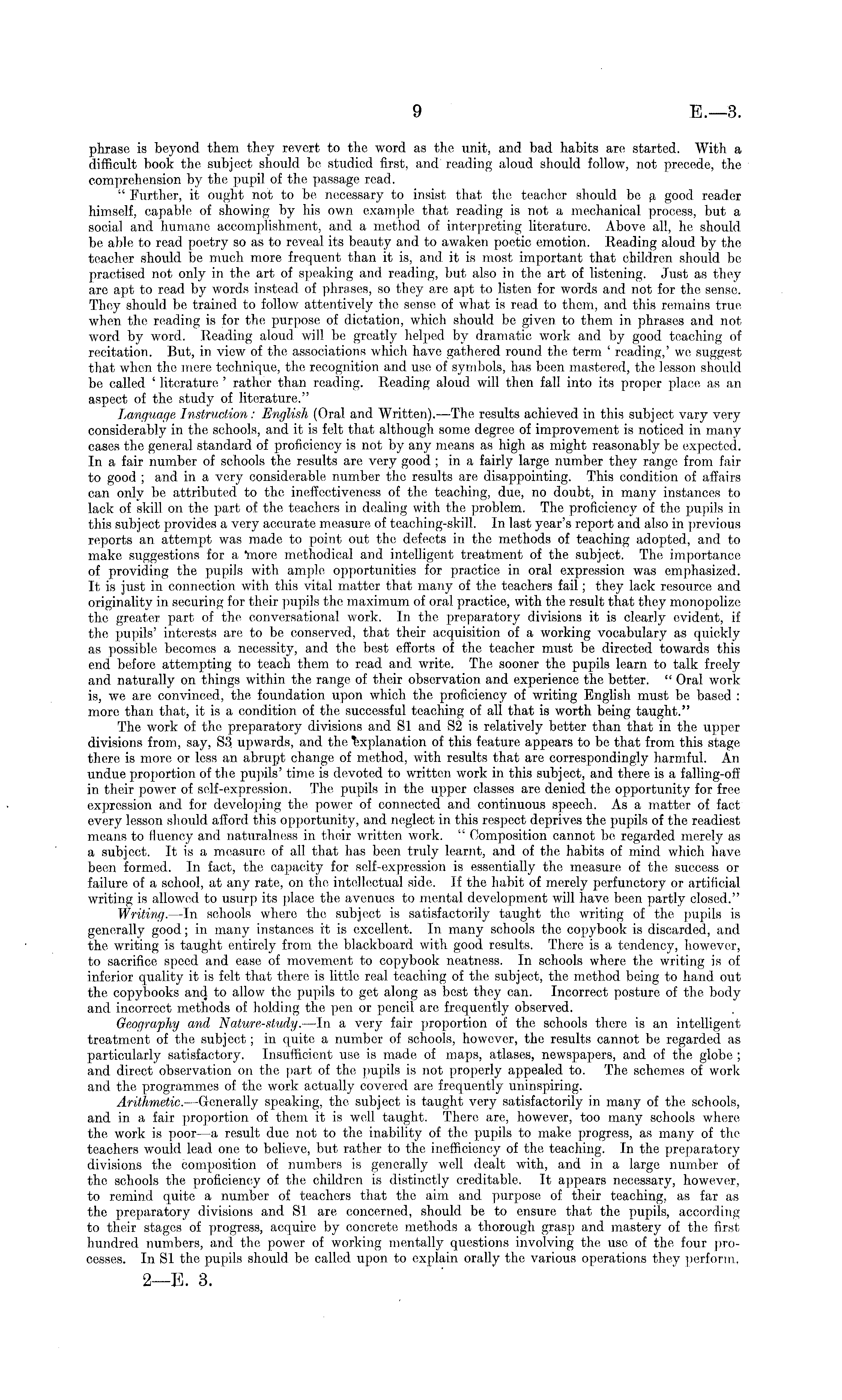 phrase is beyond them they revert to the word as the unit, and bad habits are started. With a difficult book the, subject should be studied first, and reading aloud should follow, not precede, the comprehension by the pupil of the passage read. " Further, it ought not to be necessary to insist that the teacher should be a good reader himself, capable of showing by his own example that reading is not a mechanical process, but a social and humane accomplishment, and a method of interpreting literature. Above all, he should be able to read poetry so as to reveal its beauty and to awaken poetic emotion. Reading aloud by the teacher should be much more frequent than it is, and it is most important that children should be practised not only in the art of speaking and reading, but also in the art of listening. Just as they are apt to read by words instead of phrases, so they are apt to listen for words and not for the sense. They should be trained to follow attentively the sense of what is read to them, and this remains true when the reading is for the purpose of dictation, which should be given to them in phrases and not word by word. Reading aloud will be greatly helped by dramatic work and by good teaching of recitation. But, in view of the associations which have gathered round the term ' reading,' we suggest that when the mere technique, the recognition and use of symbols, has been mastered, the lesson should be called ' literature ' rather than reading. Reading aloud will then fall into its proper place as an aspect of the study of literature." Language Instruction: English (Oral and Written). —The results achieved in this subject vary very considerably in the schools, and it is felt that although some degree of improvement is noticed in many cases the general standard of proficiency is not by any means as high as might reasonably be expected. In a fair number of schools the results are very good ; in a fairly large number they range from fair to good ; and in a very considerable number the results are disappointing. This condition of affairs can only be attributed to the ineffectiveness of the teaching, due, no doubt, in many instances to lack of skill on the part of the teachers in dealing with the problem. The proficiency of the pupils in this subject provides a very accurate measure of teaching-skill. In last year's report and also in previous reports an attempt was made to point out the defects in the methods of teaching adopted, and to make suggestions for a "more methodical and intelligent treatment of the subject. The importance of providing the pupils with ample opportunities for practice in oral expression was emphasized. It is just in connection, with this vital matter that many of the teachers fail; they lack resource and originality in securing for their pupils the maximum of oral practice, with the result that they monopolize the greater part of the conversational work. In the preparatory divisions it is clearly evident, if the pupils' interests are to be conserved, that their acquisition of a working vocabulary as quickly as possible becomes a necessity, and the best efforts of the teacher must be directed towards this end before attempting to teach them, to read and write. The sooner the pupils learn to talk freely and naturally on things within the range of their observation and experience the better. " Oral work is, we are convinced, the foundation upon which the proficiency of writing English must bo based : more than that, it is a condition of the successful teaching of all that is worth being taught." The work of the preparatory divisions and SI and S2 is relatively better than, that in the upper divisions from, say, S3 upwards, and the Explanation of this feature appears to be that from this stage there is more or less an abrupt change of method, with results that are correspondingly harmful. An undue proportion of the pupils' time is devoted to written work in this subject, and there is a falling-off in their power of self-expression. The pupils in the upper classes are denied the opportunity for free expression and for developing the power of connected and continuous speech. As a matter of fact every lesson should afford this opportunity, and neglect in this respect deprives the pupils of the readiest means to fluency and naturalness in their written work. " Composition cannot be regarded merely as a subject. It is a measure of all that has been truly learnt, and of the habits of mind which have been formed. In fact, the capacity for self-expression is essentially the measure of the success or failure of a school, at any rate, on the intellectual side. If the habit of merely perfunctory or artificial writing is allowed to usurp its place the avenues to mental development will have been partly closed." Writing. —ln schools where the subject is satisfactorily taught the writing of the pupils is generally good; in many instances it is excellent. In many schools the copybook is discarded, and the writing is taught entirely from the blackboard with good results. There is a tendency, however, to sacrifice speed and ease of movement to copybook neatness. In schools where the writing is of inferior quality it is felt that there is little real teaching of the subject, the method being to hand out the copybooks and to allow the pupils to get along as best they can. Incorrect posture of the body and incorrect methods of holding the pen or pencil are frequently observed. Geography and Nature-study. —In a very fair proportion of the schools there is an intelligent treatment of the subject; in quite a number of schools, however, the results cannot be regarded as particularly satisfactory. Insufficient use is made of maps, atlases, newspapers, and of the globe ; and direct observation on the part of the pupils is not properly appealed to. The schemes of work and the programmes of the work actually covered are frequently uninspiring. Arithmetic. —Generally speaking, the su