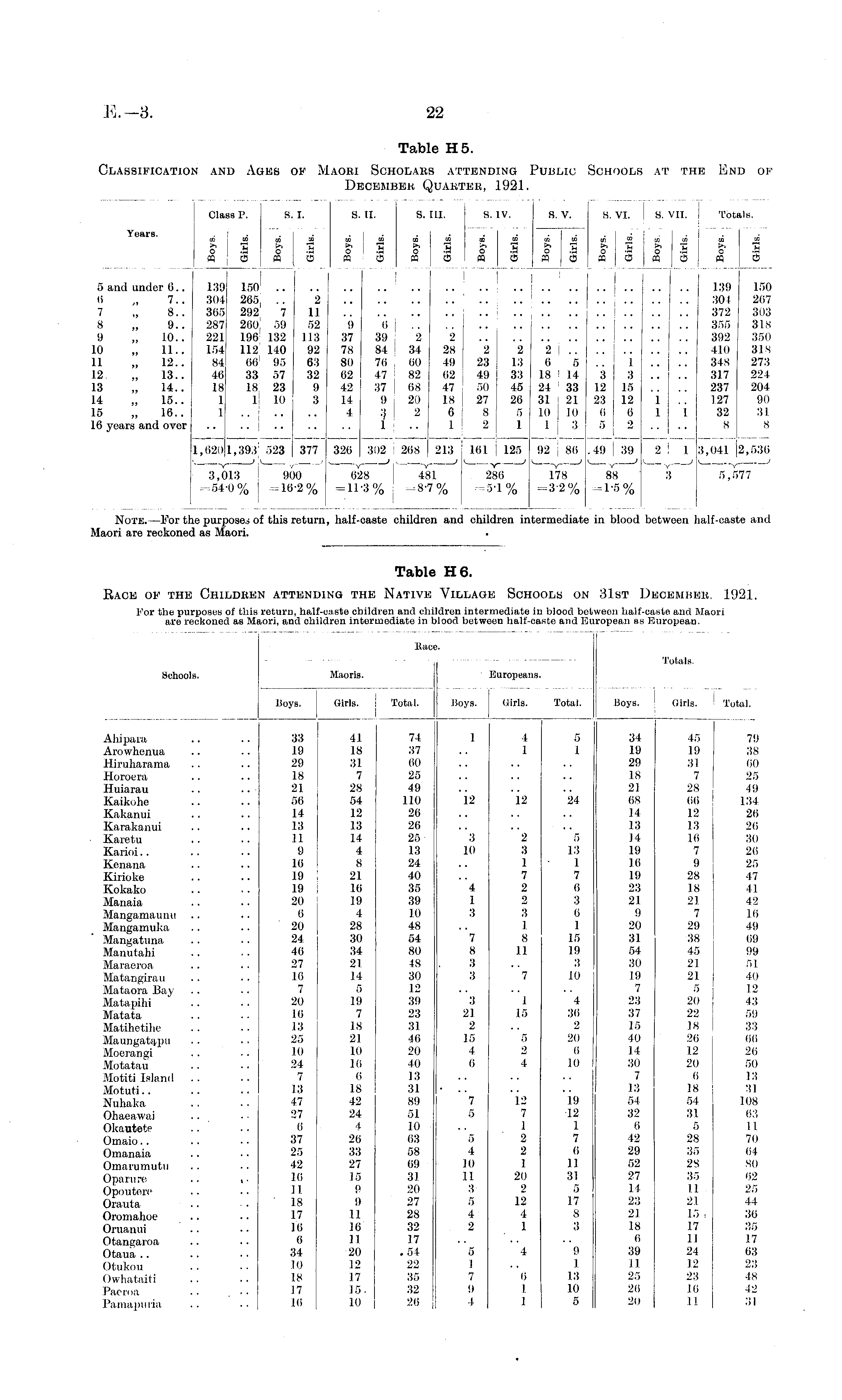 Table H5. Classification and Ages of Maori Scholars attending Public Schools at the End of December Quarter, 1921.