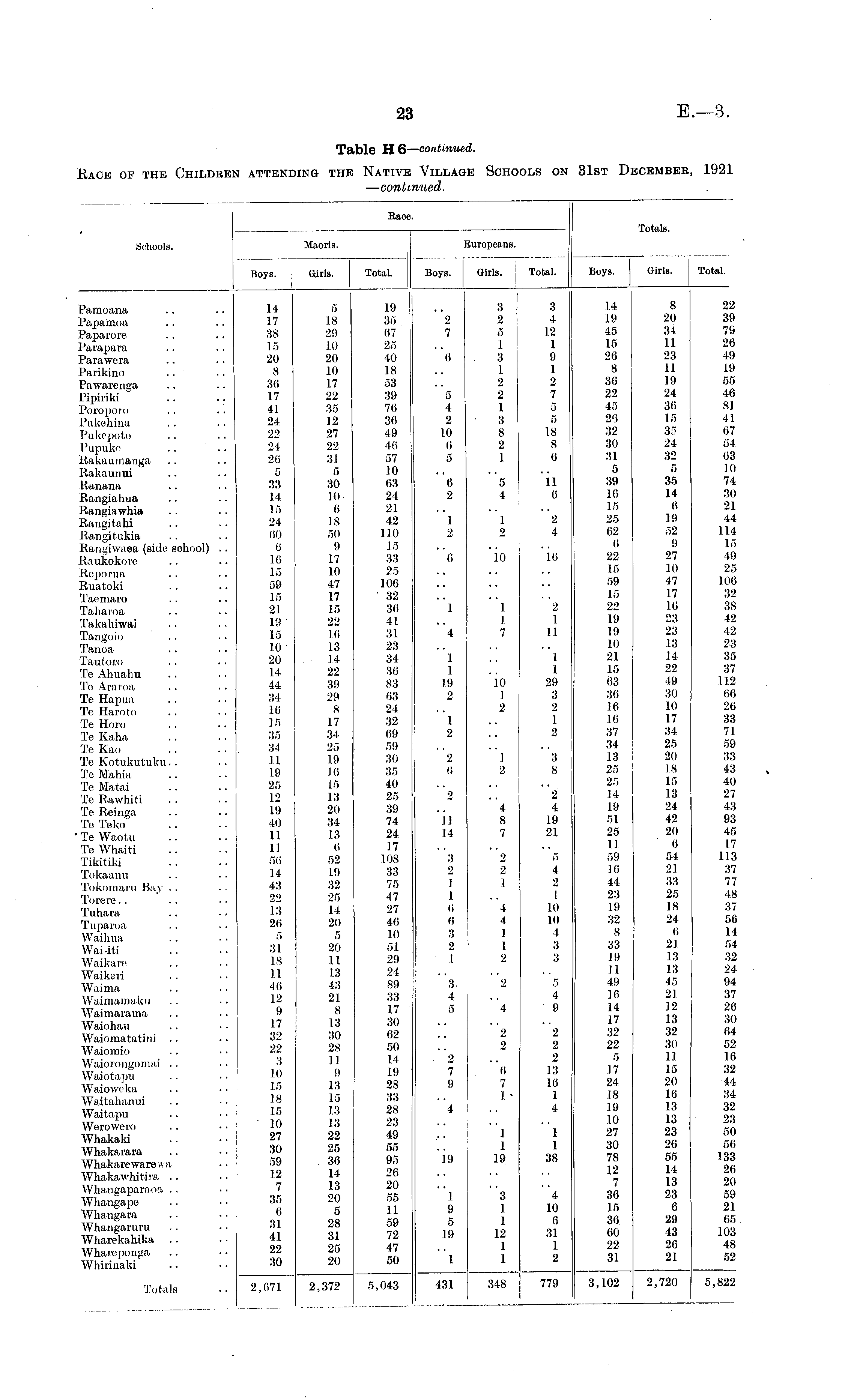 Race. Totals. Schools. Maoris. Europeans. hoys. Girls. Total. Boys. Girls. Total. Boys. Girls. Total. Pamoana Papamoa Paparore Parapara Para wo ra Parikino Pawarenga Pipiriki Poroporo Pukohina Pukepoto Pupuke . . Rakaumanga Rakaunui Ranana Rangiahua Rangiawhia Rangitahi Rangitukia Rangrwaea (side school) .. Raukokore Reporua Ruatoki Taemaro Tah'aroa Takahiwai Tangolo Tanoa Tautoro Te Ahuahu Te Araroa Te Hapua Te Haroto Te Horo Te Kaha Te Kao Te Kotukutuku. . Te Mahia Te Matai Te Rawhiti Te Reinga Te Teko 1 Te Waotu Te YVhaiti Tikitiki Tokaanu Tokiiiiiaru Bay Torere.. Tuhara Tuparoa Waihiin Wai-iti Waikare Waikeri VVaima Waimamaku Waimaramu Waiohau Waiomatatini Waiomio Waiorongontal .. Waiotapu Waioweka Waitahanui Waitapu Wcrowero Whakaki Whakarara Whakarewarevva Whakawhitira Whangaparaoa Whangape Whangara Whangariirn Wharekahika Whareponga Whirinaki 14 17 38 15 20 8 30 17 41 24 22 24 26 5 33 14 15 24 00 0 10 15 59 15 21 19 15 10 20 14 44 34 10 15 35 34 II 19 25 12 19 40 11 11 50 14 43 22 13 20 5 31 IS II 46 12 9 17 32 22 3 10 15 18 15 10 27 30 59 .12 7 35 (i 31 41 22 30 5 18 29 10 20 10 17 22 35 12 27 22 31 5 30 10 0 18 50 9 17 10 47 17 15 22 16 13 14 22 39 29 8 17 34 25 19 10 15 13 20 34 13 0 52 19 32 25 14 20 5 20 11 13 43 21 8 13 30 28 II 9 13 15 13 13 22 25 36 14 13 20 5 28 31 25 20 19 35 67 25 40 18 53 39 70 30 49 40 57 10 63 24 21 42 110 15 33 25 100 32 36 41 31 23 34 30 83 63 24 32 09 59 30 35 40 25 39 74 24 17 108 33 75 17 27 46 10 51 29 24 89 33 17 30 62 50 14 19 28 33 28 23 49 55 95 20 20 55 11 59 72 47 50 2 7 0 5 4 2 10 0 5 3 2 5 1 3 1 2 2 I 3 8 2 1 3 12 1 9 1 2 7 5 5 18 8 6 14 19 45 15 26 8 36 22 45 26 32 30 31 5 39 16 15 25 62 6 22 15 59 15 22 19 19 Id 21 15 63 36 16 16 37 34 13 25 25 14 19 51 25 II 59 16 44 23 19 32 8 33 19 11 49 16 14 17 32 22 5 17 24 IN III 10 27 30 78 12 36 15 30 60 22 31 8 20 31 II 23 11 19 24 36 15 35 24 32 5 35 14 6 19 52 9 27 in 47 17 16 23 23 13 II 22 49 30 10 17 34 25 20 18 15 13 24 42 20 6 54 21 33 25 18 24 6 21 13 13 45 21 12 13 32 30 11 15 20 10 13 13 23 26 55 14 13 23 6 29 43 26 21 22 39 79 26 49 19 55 46 81 41 07 54 03 10 74 30 21 44 114 15 49 25 106 32 38 42 42 23 35 37 112 00 20 33 71 59 33 43 40 27 43 93 45 17 113 37 77 48 37 56 14 54 32 24 94 37 26 30 04 52 Hi 32 44 34 32 23 50 56 133 26 20 59 21 65 103 48 52 0 2 5 4 11 6 1 2 1 2 2 4 0 10 10 1 I I 7 2 1 11 4 I 1 19 2 .10 I 2 1 I 29 3 2 1 2 1 2 2 0 I 2 3 8 2 II 14 4 8 7 2 4 19 21 3 9 i i o 6 3 2 I 2 2 I 4 4 1 1 2 5 4 2 I 10 10 4 3 3 3 4 5 2 4 9 4 9 7 9 2 2 6 7 I • 2 2 2 13 16 1 4 4 1 I 19 1 I 38 19 1 9 5 19 3 1 I 12 1 1 4 10 0 31 1 2 1 Totals 2,671 2,372 5,043 431 348 779 3,102 2,720 5,822