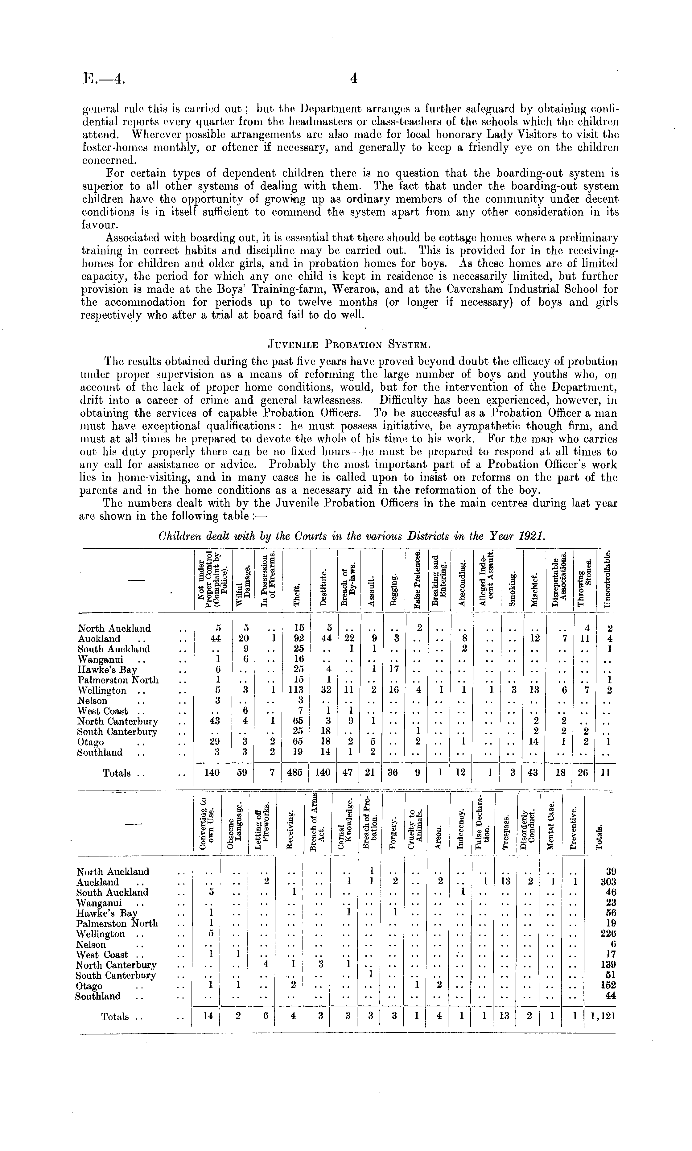 general rule this is carried out; but the Department arranges a further safeguard by obtaining confidential reports every quarter from the: headmasters or class-tcache:rs of the schools which the children attend. Whe:re:ver possible arrangements are also made for local honorary Lady Visitors to visit the foster-homes monthly, or oftencr if necessary, and generally to keep a friendly eye on the children concerned. For certain types of dependent children there is no question that the boarding-out system is superior to all other systems of dealing with them. The fact that under the boarding-out system children have the opportunity of growkig up as ordinary members of the community under decent conditions is in itself sufficient to commend the system apart from any other consideration in its favour. Associated with boarding out, it is essential that there should be cottage homes where a preliminary training in correct habits and discipline may be carried out. This is provide:d for in the receivinghomes for children and older girls, and in probation homes for boys. As these homes are of limited capacity, the period for which any one child is kept in residence is necessarily limited, but further provision is made at the Boys' Training-farm, Weraroa, and at the Cavershani Industrial School for the accommodation for periods up to twelve months (or longer if necessary) of boys and girls respectively who after a trial at board fail to do well. Juvenile Probation System. The results obtaincel during the past live years have: proved be:yond doubt the e:fficacy of probation under propesr supervision as a means of reforming tho largo number of boys and youths who, on account of the lack of proper home conditions, woulel, but for the intervention of the Department, drift into a career of crime and general lawlessness. Difficulty has been experienced, however, in obtaining the services of capable Probation Officers. To be successful as a Probation Officer a man must have exceptional qualifications : lie: must possess initiative, be sympathetic though firm, and must at all times be: prepared to de:votc the whole of his time to his work. For the man who carriess out his eluty properly there can be no fixed hours he must be pre:parcd to respond at all times to any call for assistance or advice. Probably the most important part of a Probation Officer's work lies in home-visiting, and in many cases he is called upon to insist on reforms on the part of the pare:nts and in the home conditions as a necessary aid in the reformation of the boy. The numbers dealt with by the Juvenile Probation Officers in the main centres during last year are shown in the following table : —