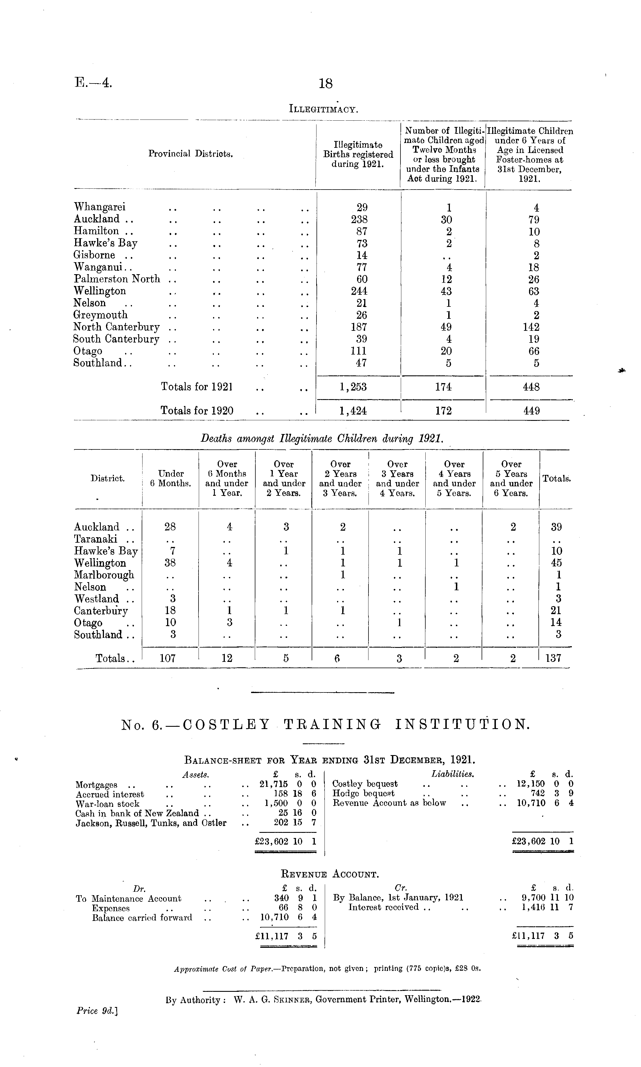 Provincial Districts. Number of Illogiti- Illegitimate Children Tlleuitimite mato Children aged under G Years of Births registered Twelve Months Age in Licensed durinn 1921 or loss brought I oster-homes at ° ' undor tho Infants 31st December, Act during 1921. 1921. Whangarei fVuckland Hamilton Hawke's Bay Gisborne 29 238 87 73 14 77 60 244 21 26 187 39 111 47 1 30 2 2 4 79 10 8 2 18 26 63 4 2 142 19 66 5 Wanganui Palmerston North Wellington Selson Lrreymouth North Canterbury ■South Canterbury .. Dtago Southland 4 12 43 1 1 ■1!) 4 20 5 Totals for 1921 1,253 174 448 Totals for 1920 449 1,424 172
