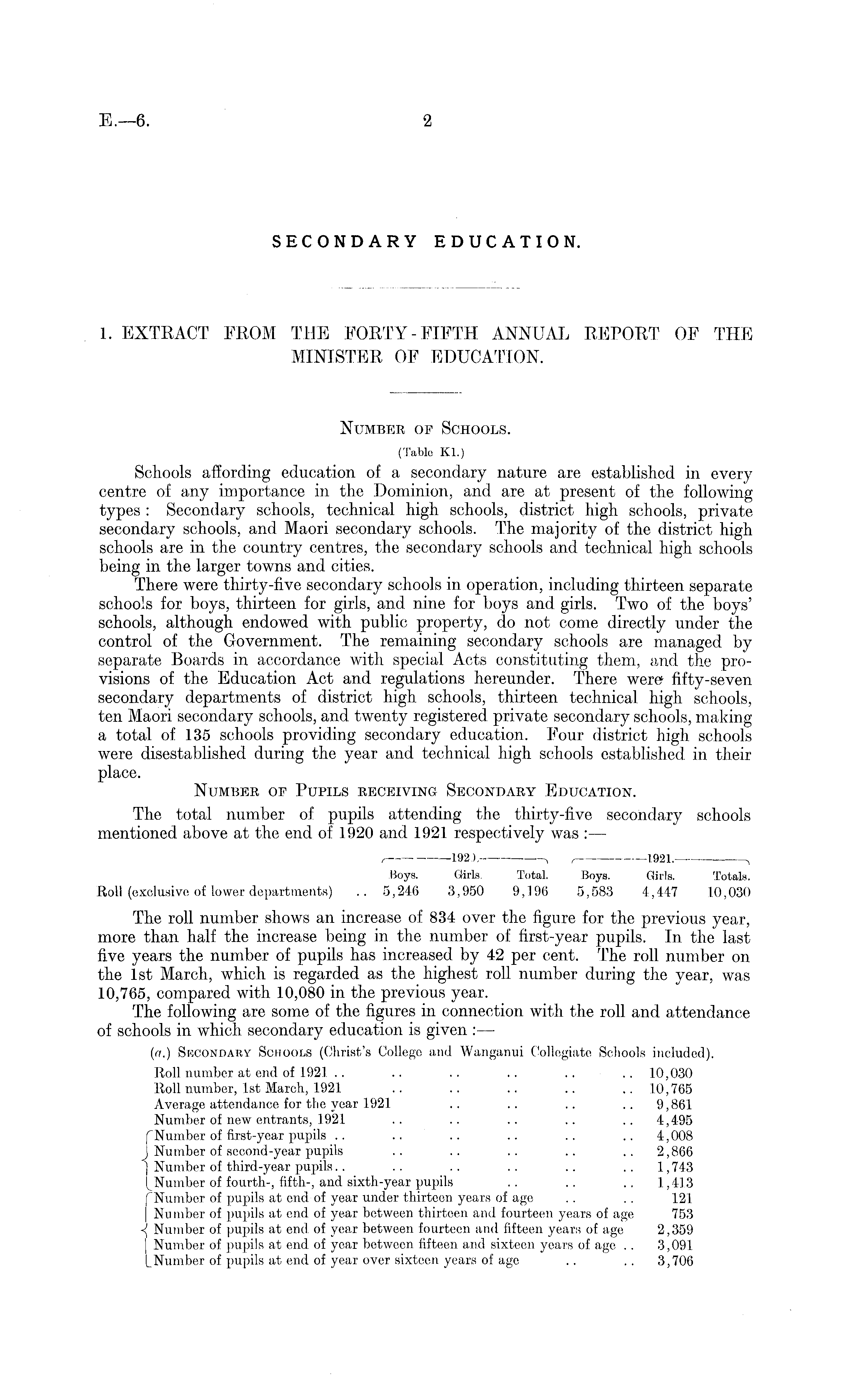 SECONDARY EDUCATION. 1. EXTRACT FROM THE FORTY-FIFTH ANNUAL REPORT OF THE MINISTER OF EDUCATION. Number of Schools. (Table Kl.) Schools affording education of a secondary nature are established in every centre of any importance in the Dominion, and are at present of the following types : Secondary schools, technical high schools, district high schools, private secondary schools, and Maori secondary schools. The majority of the district high schools are in the country centres, the secondary schools and technical high schools being in the larger towns and cities. There were thirty-five secondary schools in operation, including thirteen separate schools for boys, thirteen for girls, and nine for boys and girls. Two of the boys' schools, although endowed with public property, do not come directly under the control of the Government. The remaining secondary schools are managed by separate Boards in accordance with special Acts constituting them, and the provisions of the Education Act and regulations hereunder. There were fifty-seven secondary departments of district high schools, thirteen technical high schools, ten Maori secondary schools, and twenty registered private secondary schools, making a total of 135 schools providing secondary education. Four district high schools were disestablished during the year and technical high schools established in their place. Number of Pupils receiving Secondary Education. The total number of pupils attending the thirty-five secondary schools mentioned above at the end of 1920 and 1921 respectively was : — , 192), —, , 1921. , Boys. Girls. Total. Boys. Girls. Totals. Roll (exclusive of lower departments) .. 5,246 3,950 9,196 5,583 4,447 10,030 The roll number shows an increase of 834 over the figure for the previous year, more than half the increase being in the number of first-year pupils. In the last five years the number of pupils has increased by 42 per cent. The roll number on the Ist March, which is regarded as the highest roll number during the year, was 10,765, compared with 10,080 in the previous year. The following are some of the figures in connection with the roll and attendance of schools in which secondary education is given :— (a.) Srcondary Schools (Christ's College and Wanganui Collegiate Schools included). Roll number at end of 1921 .. .. .. .. .. .. 10,030 Roll number, Ist Marcli, 1921 .. .. .. .. ..10,765 Average attendance for the year 1921 .. .. .. .. 9,861 Number of new entrants, 1921 .. .. .. .. .. 4,495 f Number of first-year pupils .. .. .. .. .. .. 4,008 j Number of second-year pupils .. .. .. .. .. 2,866 j Number of third-year pupils.. . . . . . . .. . . 1,743 [_ Number of fourth-, fifth-, and sixth-year pupils .. .. .. 1,413 f Number of pupils at end of year under thirteen years of ago . . . . 121 | Number of pupils at end of year between thirteen and fourteen years of age 753 -<[ Number of pupils at end. of year between fourteen and fifteen years of age 2,359 | Number of pupils at end of year between fifteen and sixteen years of age . . 3,091 LNumber of pupils at end of year over sixteen years of age .. .. 3,706
