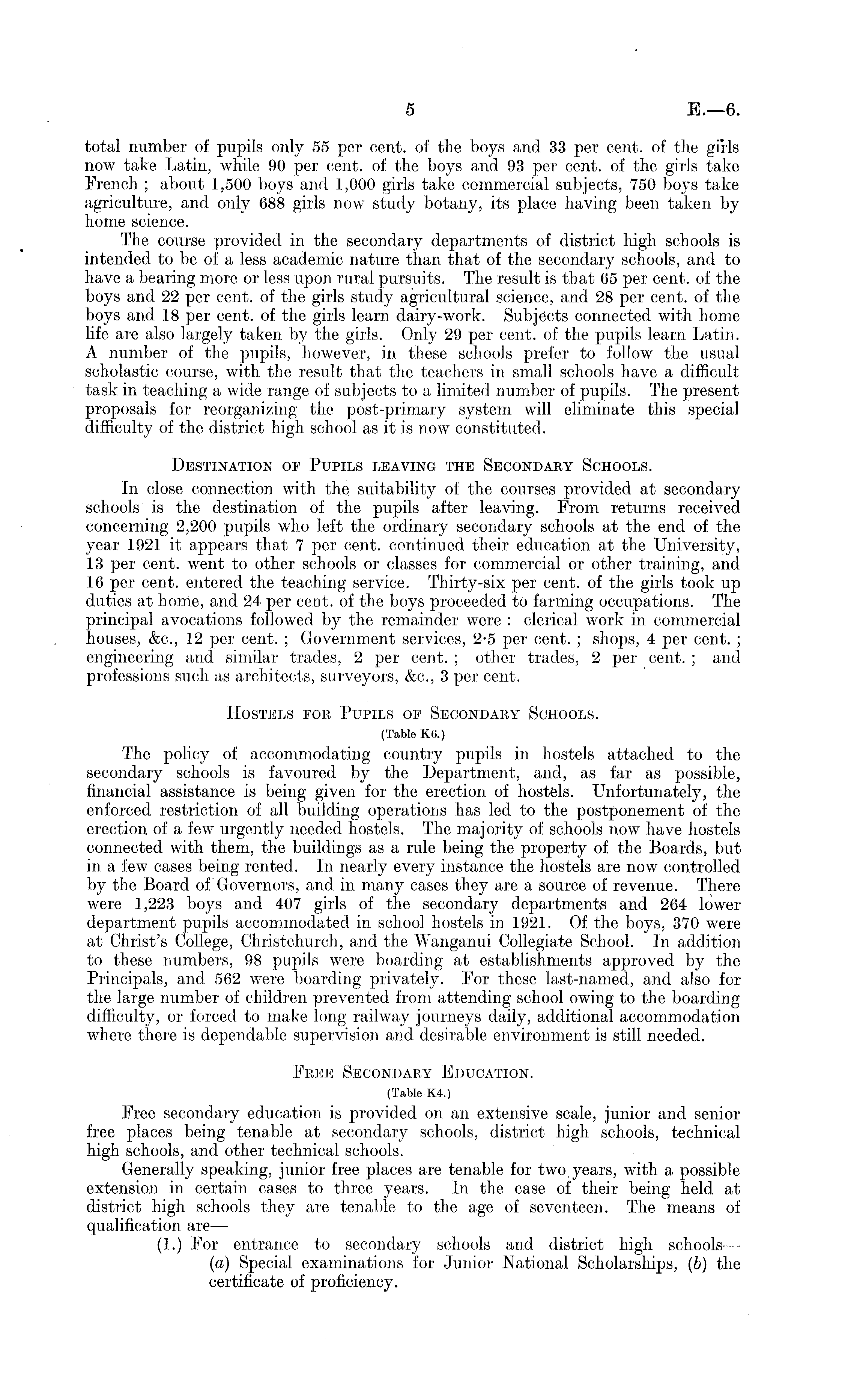 total number of pupils only 55 per cent, of the boys and 33 per cent, of the girls now take Latin, while 90 per cent, of the boys and 93 per cent, of the girls take French ; about 1,500 boys and 1,000 girls take commercial subjects, 750 boys take agriculture, and only 688 girls now study botany, its place having been taken by home science. The course provided in the secondary departments of district high schools is intended to be of a less academic nature than that of the secondary schools, and to have a bearing more or less upon rural pursuits. The result is that 65 per cent, of the boys and 22 per cent, of the girls study agricultural science, and 28 per cent, of the boys and 18 per cent, of the girls learn dairy-work. Subjects connected with home life are also largely taken by the girls. Only 29 per cent, of the pupils learn Latin. A number of the pupils, however, in these schools prefer to follow the usual scholastic course, with the result that the teachers in small schools have a difficult task in teaching a wide range of subjects to a limited number of pupils. The present proposals for reorganizing the post-primary system will eliminate this special difficulty of the district high school as it is now constituted. Destination of Pupils leaving the Secondary Schools. In close connection with the suitability of the courses provided at secondary schools is the destination of the pupils after leaving. From returns received concerning 2,200 pupils who left the ordinary secondary schools at the end of the year 1921 it appears that 7 per cent, continued their education at the University, 13 per cent, went to other schools or classes for commercial or other training, and 16 per cent, entered the teaching service. Thirty-six per cent, of the girls took up duties at home, and 24 per cent, of the boys proceeded to fanning occupations. The principal avocations followed by the remainder were : clerical work in commercial houses, &c, 12 per cent. ; Government services, 2-5 per cent. ; shops, 4 per cent. ; engineering and similar trades, 2 per cent. ; other trades, 2 per cent. ; and professions such as architects, surveyors, &c, 3 per cent. Hostels for Pupils of Secondary Schools. (Table K(i.) The policy of accommodating country pupils in hostels attached to the secondary schools is favoured by the Department, and, as far as possible, financial assistance is being given for the erection of hostels. Unfortunately, the enforced restriction of all building operations has led to the postponement of the erection of a few urgently needed hostels. The majority of schools now have hostels connected with them, the buildings as a rule being the property of the Boards, but in. a few cases being rented. In nearly every instance the hostels are now controlled by the Board of Governors, and in many cases they are a source of revenue. There were 1,223 boys and 407 girls of the secondary departments and 264 lower department pupils accommodated in school hostels in. 1921. Of the boys, 370 were at Christ's College, Christchurch, and the Wanganui Collegiate School. In addition to these numbers, 98 pupils were boarding at establishments approved by the Principals, and 562 were boarding privately. For these last-named, and also for the large number of children prevented from attending school owing to the boarding difficulty, or forced to make long railway journeys daily, additional accommodation where there is dependable supervision and desirable environment is still needed. Free Secondary LiDUcation. (Table K4.) Free secondary education is provided on an extensive scale, junior and senior free places being tenable at secondary schools, district high schools, technical high schools, and other technical schools. Generally speaking, junior free places are tenable for two. years, with a possible extension in certain cases to three years. In the case of their being held, at district high schools they are tenable to the age of seventeen. The means of qualification are— (1.) For entrance to secondary schools and district high schools — (a) Special examinations for Junior National Scholarships, (b) the certificate of proficiency.