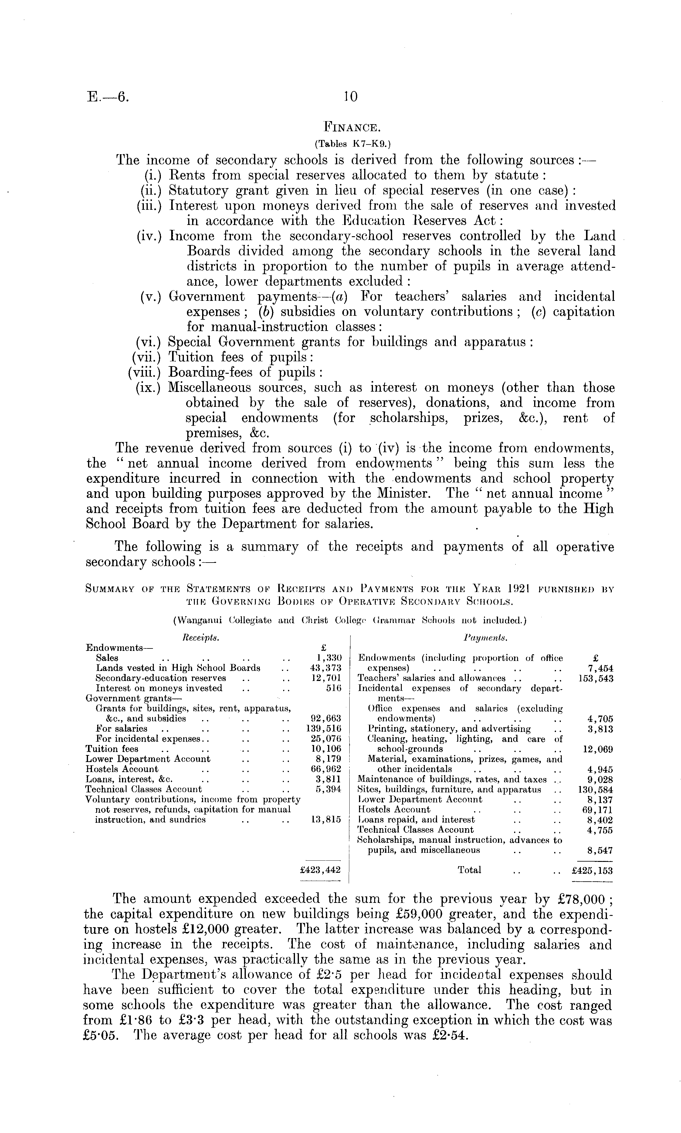 Finance. (Tables K7-K9.) The income of secondary schools is derived from the following sources : — (i.) Rents from special reserves allocated to them by statute : (ii.) Statutory grant given in lieu of special reserves (in one case) : (iii.) Interest upon moneys derived from the sale of reserves and invested in accordance with the Education Reserves Act: (iv.) Income from the secondary-school reserves controlled by the Land Boards divided among the secondary schools in the several land districts in proportion to the number of pupils in average attendance, lower departments excluded : (v.) Government payments—(a) For teachers' salaries and incidental expenses ; (b) subsidies on voluntary contributions ; (c) capitation for manual-instruction classes: (vi.) Special Government grants for buildings and apparatus : (vii.) Tuition fees of pupils: (viii.) Boarding-fees of pupils : (ix.) Miscellaneous sources, such as interest on moneys (other than those obtained by the sale of reserves), donations, and income from special endowments (for scholarships, prizes, &c), rent of premises, &c. The revenue derived from sources (i) to (iv) is the income from endowments, the " net annual income derived from endowments" being this sum less the expenditure incurred in connection with the endowments and school property and upon building purposes approved by the Minister. The " net annual income " and receipts from tuition fees are deducted from the amount payable to the High School Board by the Department for salaries. The following is a summary of the receipts and payments of all operative secondary schools: — Summary op the Statements o\? Receipts and Payments for the Year 1921 furnished by the Governing! Bodies of Operative Secondary Schools. (Wanganui Collegiate and Christ College Grammar Schools not included.) Receipts. Payments. Endowments— £ Sales .. .. .. .. 1,330 Endowments (including proportion of office £ Lands vested in High School Boards .. 43,373 expenses) .. .. .. .. 7,454 Secondary-education reserves .. .. 12,701 Teachers' salaries and allowances .. .. 153,543 Interest on moneys invested .. .. 516 Incidental expenses of secondary departGovernment grants— ments — Grants for buildings, sites, rent, apparatus, Office expenses and salaries (excluding &c, and subsidies .. .. .. 92,663 endowments) .. .. .. 4,705 For salaries .. .. .. .. 139,516 Printing, stationery, and advertising .. 3,813 For incidental expenses.. .. .. 25,076 Cleaning, heating, lighting, and care of Tuition fees .. .. .. .. 10,106 school-grounds .. .. .. 12,069 Lower Department Account .. .. 8,179 Material, examinations, prizes, games, and Hostels Account .. .. .. 66,962 j other incidentals .. .. .. 4,945 Loans, interest, &c. .. .. .. 3,811 Maintenance of buildings, rates, and taxes ... 9,028 Technical Classes Account .. .. 5,394 Sites, buildings, furniture, and apparatus .. 130,584 Voluntary contributions, income from property Lower Department Account .. .. 8,137 not reserves, refunds, capitation for manual Hostels Account .. .. .. 69,171 instruction, and sundries .. .. 13,815 Loans repaid, and interest .. .. 8,402 Technical Classes Account .. .. 4,755 Scholarships, manual instruction, advances to pupils, and miscellaneous .. . . 8,547 £423,442 Total .. .. £425,153 The amount expended exceeded the sum for the previous year by £78,000 ; the capital expenditure on new buildings being £59,000 greater, and the expenditure on hostels £12,000 greater. The latter increase was balanced by a corresponding increase in the receipts. The cost of maintenance, including salaries and incidental expenses, was practically the same as in the previous year. The Department's allowance of £2-5 per head for incidental expenses should have been sufficient to cover the total expenditure under this heading, but in some schools the expenditure was greater than the allowance. The cost ranged from £l'B6 to £3*3 per head, with the outstanding exception in which the cost was £5 - 05. The average cost per head for all schools was £2-54.
