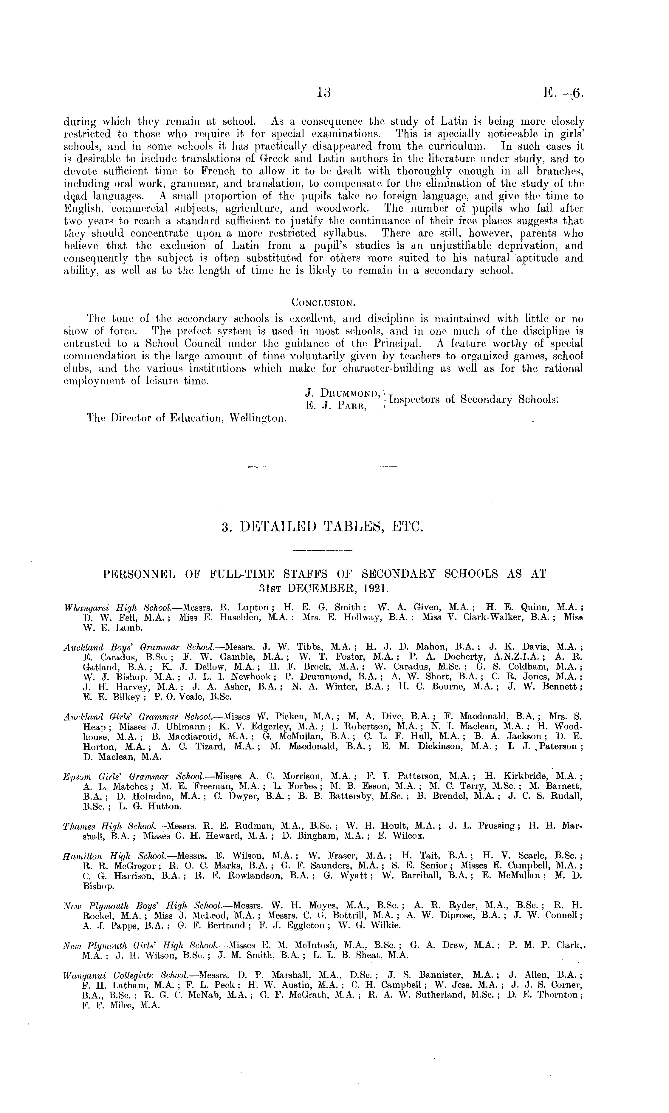3. DETAILED TABLES, ETC. PERSONNEL OT FULL-TIME STAFFS OF SECONDARY SCHOOLS AS AT 31st DECEMBER, 1921. Whangarei High School— Messrs. R. Lupton; H. E. G. Smith; W. A. Given, M.A. ;H. B. Quinn, M.A. ; D. W. Fell, M.A. ; Misa E. Haselden, M.A. ; Mrs. E. Hollway, B.A. ; Miss V. Clark-Walker, B.A. ; Miss W. B. Lamb. Auckland Boys' Grammar School. —Messrs. J. W. Tibbs, M.A. ; H. J. D. Mahon, B.A. ; J. K. Davis, M.A. ; B. Caradus, B.Sc. ; F. W. Gamble, M.A. ; W. T. Foster, M.A. ; P. A. Dooherty, A.N.Z.I.A. ; A. R. Gatland. B.A. ; K. J. Dellow, M.A. ; H. F. Brock, M.A. ; W. Caradus, M.So. ; G. S. Coldham, M.A. ; W. J. Bishop, M.A. ;J. L. I. Nowbook; P, Drummoud, B.A. ;A. W. Sbort, B.A. ; C. R. Jones, M.A. ; J. H. Harvey, M.A. ; J. A. Asher, B.A. : N. A. Winter, B.A. ; H. C. Bourne, M.A. ; J. W. Bennett; B. E. Bilkey ; P. 0. Veale, B.Sc. Auckland Girls' Grammar School— Mines W. Pieken, M.A. ; M. A. Dive, B.A. ; F. Maedonald, B.A. ; Mrs. S. Heap ; Misses J. Uhlmann ; K. V. Edgerley, M.A. ; I. Robertson, M.A. ; N. I. Maclean, M.A. ; H. Woodhouse, M.A. ; B. Macdiarmid, M.A. ; G. McMullan, B.A. ;C. L. F. Hull, M.A. ;B. A. Jackson; D. E. Horton, M.A. ; A. C. Tizard, M.A. ; M. Maedonald, B.A. ; E. M. Dickinson, M.A. ; I. J. .Paterson; D. Maclean, M.A. Epsom Girls' Grammar School. —Misses A. C. Morrison, M.A. ; F. I. Patterson, M.A. ; H. Kirkbride, M.A. ; A. L. Matches ; M. B. Freeman, M.A. ; L. Forbes ; M. B. Esson, M.A. ; M. C. Terry, M.Sc. ; M. Barnett, B.A. ; D. Holmden, M.A. ; C. Dwyer, B.A. ; B. B. Battersby, M.Sc. ; B. Brendcl, M.A. ; J. C. S. Rudall, B.Sc. ; L. G. Hutton. Thames High School. —Messrs. R. E. Rudman, M.A., B.Sc. ; W. H. Hoult, M.A. ; J. L. Pressing ; H. H. Marshall, B.A. ; Misses G. H. Heward, M.A. ; D. Bingham, M.A. ; E. Wilcox. Hamilton, High School— Messrs. E. Wilson, M.A. ; VV. Eraser, M.A. ; H. Tait, B.A. ; H. V. Searle, B.Sc. ; R. R. McGregor ; R. 0. C. Marks, B.A. ; G. F. Saunders, M.A. ; S. E. Senior ; Misses E. Campbell, M.A. ; C. G. Harrison, B.A. ; R. E. Rowlandson, B.A. ;G. Wyatt; W. Barriball, B.A. ;E. McMullan ;M. D. Bishop. New Plymouth Boys' High School— Messrs. W. H. Moyes, M.A., B.Sc. ; A. R. Ryder, M.A., B.Sc. ; R. H. Rockel, M.A. ; Miss J. McLeod, M.A. ; Messrs. C. G. Bottrill, M.A. ; A. VV. Diprose, B.A. ; J. W. Connell; A. J. Papps, B.A. ; G. F. Bertrand ; F. J. Eggleton ; W. G. Wilkie. New Plymouth Girh' High School.— Misses E. M. Mcintosh, M.A.. B.Sc. ; G. A. Drew, M.A. ; P. M. P. Clark,. M.A. ; J. H. Wilson, B.Sc. ; J. M. Smith, B.A. ; L. L. B. Sheat, M.A. Wanganui Collegiate School. —Messrs. I). P. Marshall, M.A., D.Sc. ; J. S. Bannister, M.A. ; J. Allen, B.A. ; F. H. Latham, M.A. ; F. L. Peck ; H. W. Austin, M.A. ; C. H. Campbell ; W. Jess, M.A. ; J. J. S. Corner, 8.A., B.Sc. ; R. G. (.'. McNab, M.A. ; G. F. McGrath, M.A. ; R. A. W. Sutherland, M.Sc. ; D. E. Thornton ; F. F. Miles, M.A.
