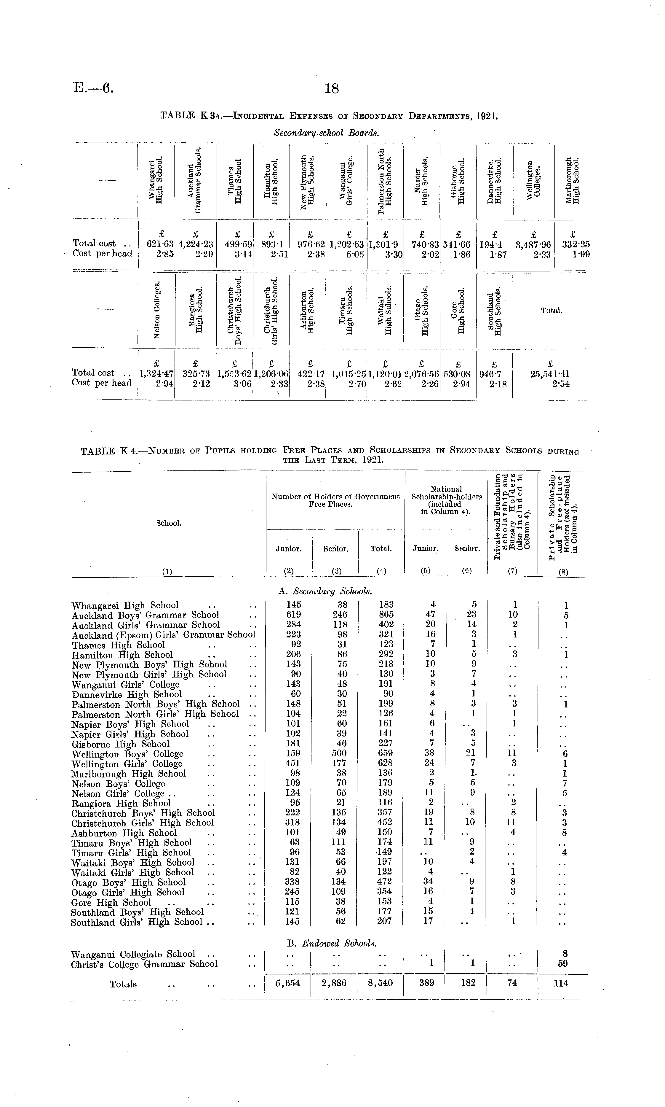 TABLE K4. —Number of Pupils holding Free Places and Scholarships in Secondary Schools during the Last Term, 1921.