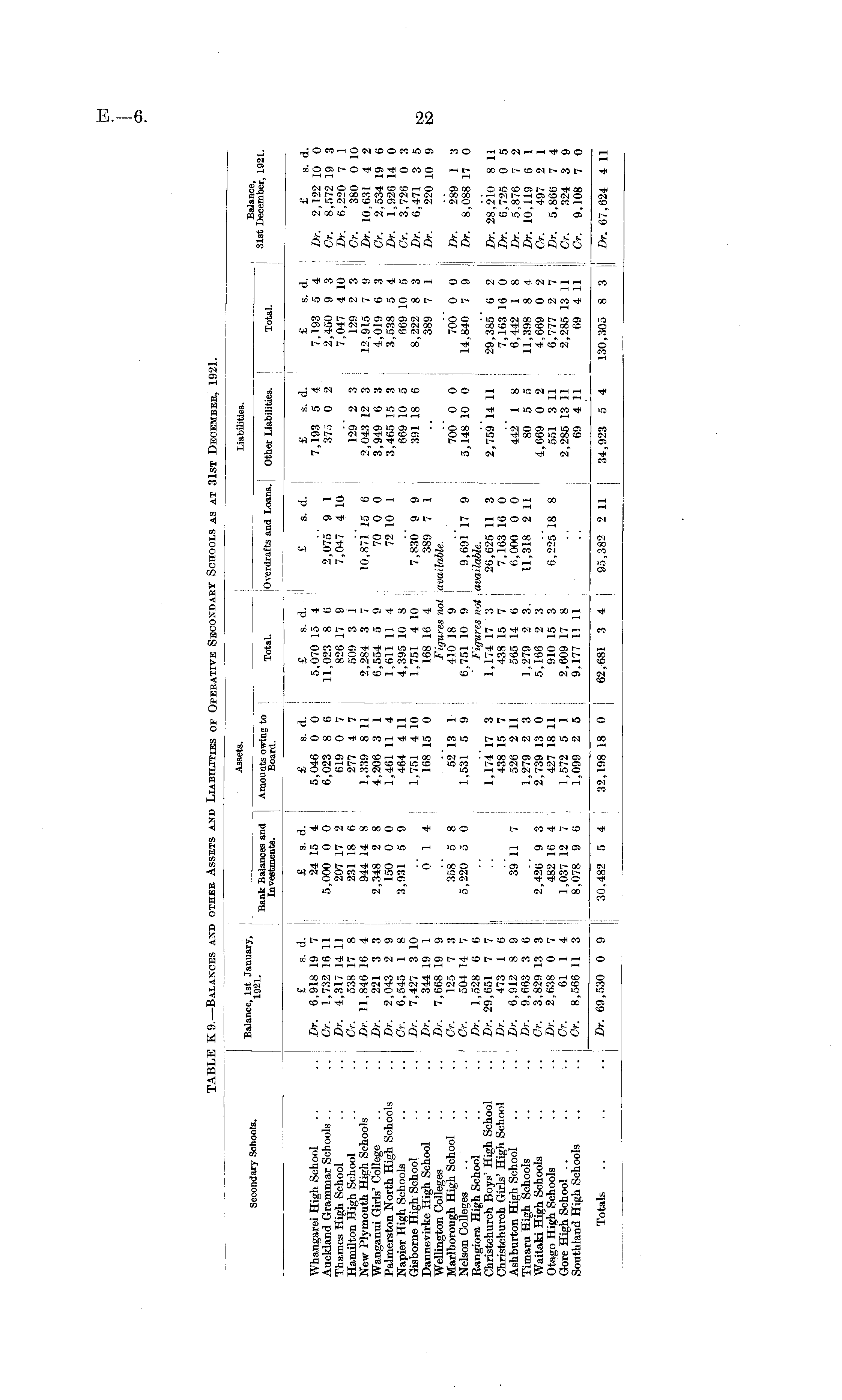 TABLE K9.—Balances and other Assets and Liabilities of Operative Secondary Schools as at 31st December, 1921.