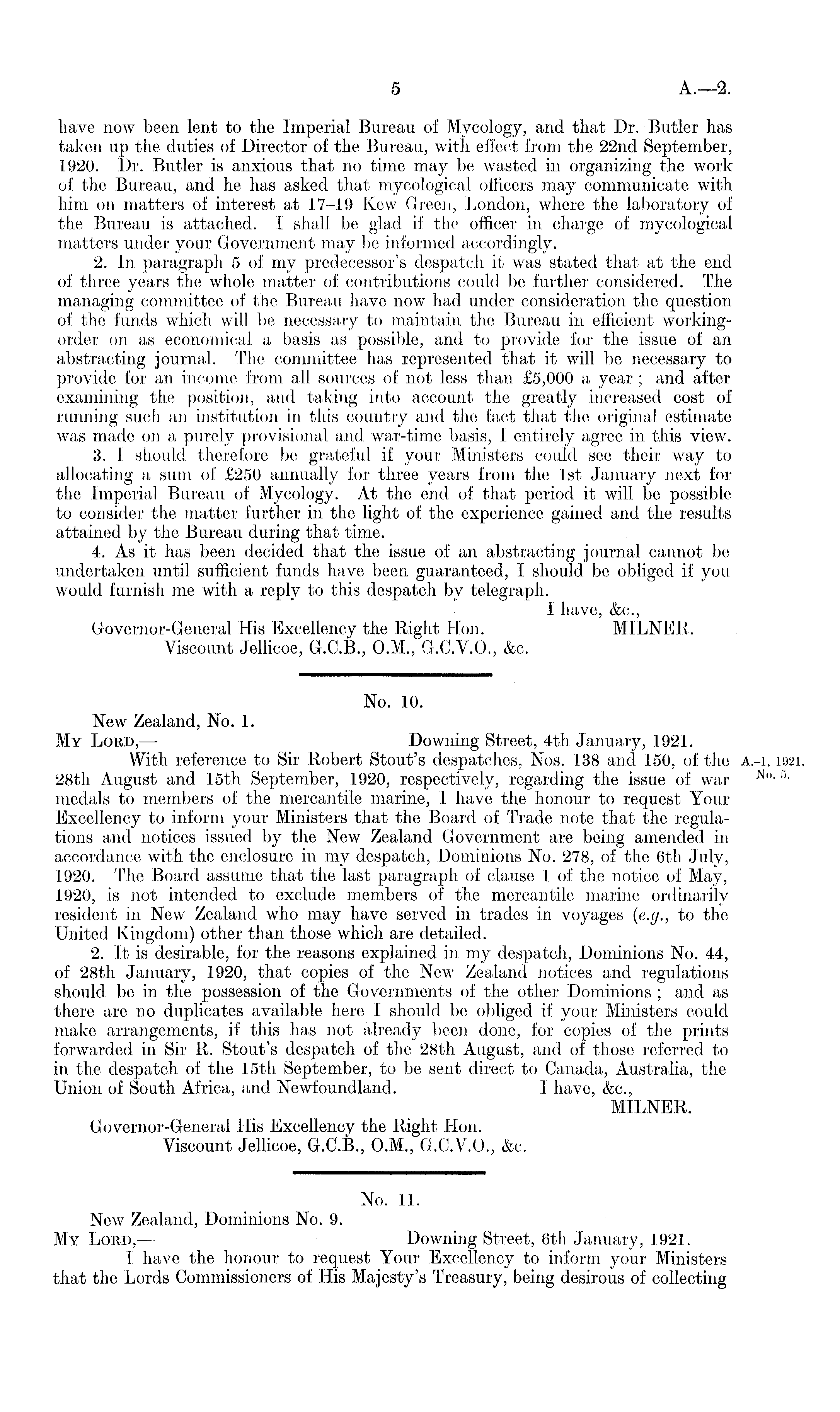 No. 10. New Zealand, No. 1. My Lord, — Downing Street, 4th January, 1921. With reference to Sir Robert Stout's despatches, Nos. 138 and 150, of the 28th August and 15th September, 1920, respectively, regarding the issue of war medals to members of the mercantile marine, I have the honour to request Your Excellency to inform your Ministers that the Board of Trade note that the regulations and notices issued by the New Zealand Government are being amended in accordance with the enclosure in my despatch, Dominions No. 278, of the 6th July, 1920. The Board assume that the last paragraph, of clause lof the notice of May, 1920, is not intended to exclude members of the mercantile marine ordinarily resident in New Zealand who may have served in trades in voyages (e.g., to the United Kingdom) other than those which are detailed. 2. It is desirable, for the reasons explained in my despatch, Dominions No. 44, of 28th January, 1920, that copies of the New Zealand notices and regulations should be in the possession of the Governments of the other Dominions ; and as there are no duplicates available here I should be obliged if your Ministers could make arrangements, if this has not already been done, for copies of the prints forwarded in Sir R. Stout's despatch of the 28th August, and of those referred to in the despatch of the 15th September, to be sent direct to Canada, Australia, the Union of South Africa, and Newfoundland. 1 have, &c, MILNER. Governor-General His Excellency the Right Hon. Viscount Jellicoe, G.C.8., 0.M., G.C.V.0., &c.