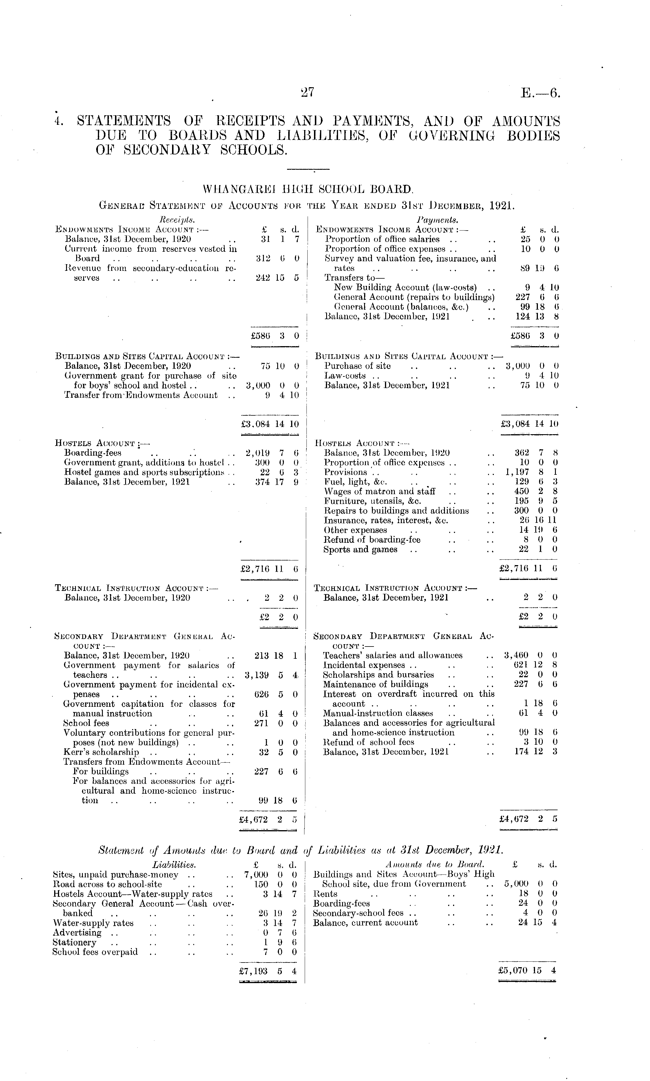 4, STATEMENTS OF RECEIPTS AND PAYMENTS, AND OF AMOUNTS DUE TO BOARDS AND LIABILITIES, OF GOVERNING BODIES OF SECONDARY SCHOOLS. WIIANGAKKI HIGH SCHOOL HOARD. General- Statement of Accounts tor the Yeah ended 31st Deoembek, 1921. Receipt*. Payments. Endowments Income Account :— £ s. d. Endowments Income Account :— £ s. d. Balance, 31st December, 1920 .. 31 1 7 • Proportion of office salaries .. .. 25 0 0 Current income from reserves vested in Proportion of office expenses .. .. 10 0 0 Board .. .. .. .. 312 6 0 j Survey and valuation fee, insurance, and Revenue from secondary-education re- rates .. .. . . .. 89 19 6 serves .. .. .. .. 242 15 5 Transfers to— New Building Account (law-costs) .. 9 4 10 General Account (repairs to buildings) 227 6 6 General Account (balances, &o.) .. 99 18 6 Balance, 31st December, 1921 . .. 124 13 8 £586 3 0 £586 3 0 Buildings and Sites Capital Account :— Buildings and Sites Capital Account :— Balance, 31st December, 1920 .. 75 10 0 Purchase of site .. .. ~ 3,000 0 0 Government grant for purchase of site Law-costs . . . . . . . . !) 4 10 for boys'school and hostel .. .. 3,000 0 0 Balance, 31st December, 1921 .. 75 10 0 Transfer from Endowments Account .. 9 4 10 £3,084 14 10 £3,084 14 10 Hostels Account : — j Hostels Account : — Boarding-fees .. .'. .. 2,019 7 6 Balance, 31st December, 1920 .. 362 7 8 Government grant, additions to hostel .. 300 0 0 Proportion of office expenses .. .. 10 0 0 Hostel games and sports subscriptions , . 22 6 3 Provisions .. .. .. 1,197 8 1 Balance, 31st December, 1921 ' . . 374 17 9 Fuel, light, &o. ... . . .. 129 6 3 Wages of matron and staff . . .. 450 2 8 Furniture, utensils, &c. .. . . 195 9 5 Repairs to buildings and additions .. 300 0 0 Insurance, rates, interest, &c. .. 26 16 11 Other expenses . . . . . . 14 19 6 Refund of boarding-fee .. .. 8 0 0 Sports and games .. .. .. 22 1 0 £2,716 11 6 £2,716 11 6 Technical Instruction Account :— Technical Instruction Account :—■ Balance, 31st December, 1920 ... 220 Balance, 31st December, 1921 .. 220 £2 2 0 £2 2 0 Secondary Department General Ac- Secondary Department General Account :— count : — Balance, 31st December, 1920 .. 213 18 1 Teachers'salaries and allowances .. 3,460 0 0 Government payment for salaries of Incidental expenses .. .. .. 621 12 8 teachers .. .. .. .. 3,139 5 4 Scholarships and bursaries .. .. 22 0 0 Government payment for incidental ex- Maintenance of buildings . . .. 227 6 6 penses .. .. .. . . 626 50 j Interest on overdraft incurred on this Government capitation for classes for account . . . . .. . . 1 18 6 manual instruction ... .. 61 4 0 ! Manual-instruction classes .. .. 61 4 0 School fees . . . . .. 271 0 0 i Balances and accessories for agricultural Voluntary contributions for general pur- and home-science instruction .. 99 18 6 poses (not new buildings) . . .. 10 0 Refund of school fees . . . . 3 10 0 Kerr's scholarship .. .. .. 32 5 0 Balance, 31st December, 1921 .. 174 12 3 Transfers from Endowments Account— For buildings .. . . . . 227 6 6 For balances and accessories for agricultural and home-science instruction . . . . .. . . 99 18 6 £4,672 2 5 J £4,672 2 5 Statement of A moulds due, to Board and of Liabilities as at 31st December, 1921. Liabilities. £ s. d. | Amounts due to Board. £ s. d. Sites, unpaid purchase-money .. . . 7,000 0 0 Buildings and Sites Account —Boys' High Road across to school-site .. .. 150 00 j School site, due from Government .. 5,000 0 o Hostels Account—Water-supply rates .. 314 7 I Rents . . . . .. .. 18 0 0 Secondary General Account — Cash over- J Boarding-foes . . . . . . 24 0 0 banked . . .. . . .. 26 19 2 Secondary-school fees .. .. . . 4 0 0 Water-supply rates . . . . 311 7 I Balance, current account .. .. 24 15 4 Advertising ........ 0 7 0 Stationery .. . . . . . . 19 6 School fees overpaid .. . . .. 7 0 0 £7,193 5 4 £5,070 15 4