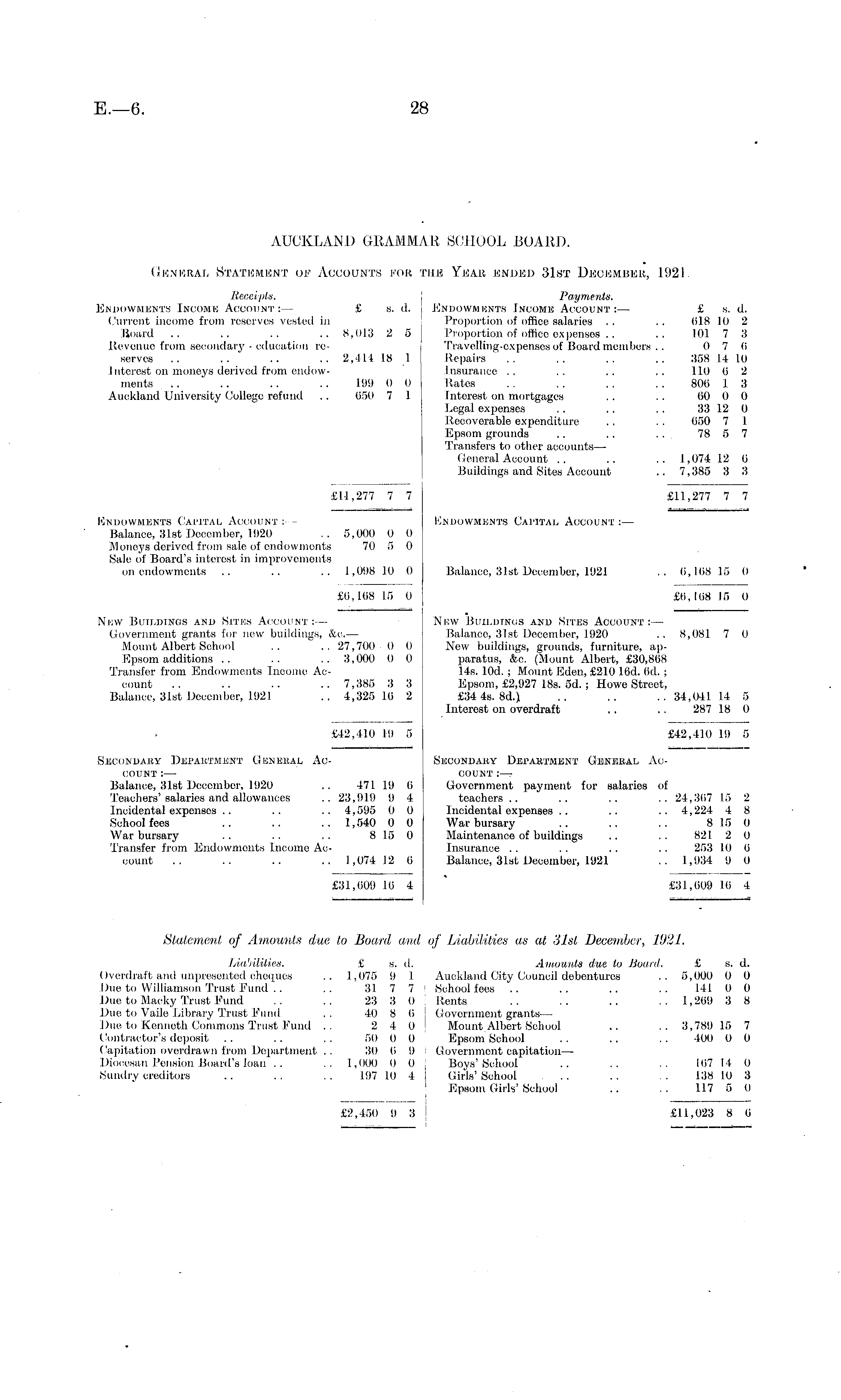 AUCKLAND GRAMMAR SCHOOL BOARD. General Statement of Accounts fob the Year ended 31st December, 1921. Receipts. Payments. Endowments Income Account:— £ s. d. Endowments Income Account:— £ s. d. Current income from reserves vested in Proportion of office salaries .. .. 618 10 2 Hoard .. .. .. .. 8,013 2 5 I Proportion of office expenses .. .. 101 7 3 Revenue from secondary - education re- Travelling-expenses of Board members ~ 0 7 6 serves .. .. .. .. 2,414 18 1 Repairs .. .. .. .. 358 14 10 Interest on moneys derived from endow- Insurance .. .. .. .. 110 6 2 merits .. .. .. .. 199 0 0 Rales .. .. .. .. 806 I 3 Auckland University College refund . . 650 7 1 Interest on mortgages .. . . 60 0 0 Legal expenses . . .. . . 33 12 0 Recoverable expenditure .. .. 650 7 I. Epsom grounds .. .. .. 78 5 7 Transfers to other accounts— General Account .. .. .. 1,074 12 (i Buildings and Sites Account .. 7,385 3 3 £11,277 7 7 £11,277 7 7 Endowments Capital Account: Endowments Capital Account:— Balance, 31st December, 1920 .. 5,000 0 0 Moneys derived from sale of endowments 70 5 0 Sale of Board's interest in improvements on endowments .. .. .. 1,098 10 0 Balance, 31st December, 1921 .. 6,168 15 0 £6,108 15 0 £6,168 15 0 New Buildings and Situs Account:— New Buildings and Sites Account: — Government grants for new buildings, &c. - Balance, 31st December, 1920 .. 8,081 7 0 Mount Albert Sohool .. .. 27,700 0 0 New buildings, grounds, furniture, apEpsom additions .. .. .. 3,000 0 0 paratus, &o. (Mount Albert, £30,868 Transfer from Endowments Income Ac- 14s. lOd. ; Mount Eden, £210 1 (id. (id. ; count .. .. .. .. 7,385 3 3 Epsom, £2,927 18s. sd. ; Howe Street, Balance, 31st December, 1921 .. 4,325 16 2 £34 4s. Bd.) .. .. ..34,04114 5 Interest on overdraft . . . . 287 18 0 £42,410 19 5 £42,410 19 5 Seoondaby Department General Ac- Secondary Department General Account : — COUNT :— Balance, 31st December, 1920 . . 471 19 6 Government payment for salaries of Ten hers'salaries and allowances .. 23,919 9 4 teachers .. .. .. .. 24,367 15 2 Incidental expenses .. . . .. 4,595 0 0 Incidental expenses .. .. . . 4,224 4 8 School fees .. .. .. 1,540 0 0 War bursary .. .. .. 8 15 0 War bursary .. . . .. 815 0 Maintenance of buildings .. . . 821 2 0 Transfer from Endowments Income Ac- Insurance .. .. .. .. 253 10 6 count .. .. .. .. 1,074 12 6 Balance, 31st December, 1921 .. 1,934 9 0 £31,(i09 16 4 £31,609 16 4 I ■ r i k^—i ' — - Statement of Amounts due to Board and of Liabilities as at 31st December, 1921. Liabilities. £ a. d. Amounts due to Board. £ s. d. Overdraft and unpresented oheques .. 1,075 9 1 Auckland City Council debentures .. 5,000 (I 0 Due to Williamson Trust Fund .. .. 31 7 7 School fees .. .. .. .. 11l 0 0 Due to Macky Trust Fund .. .. 23 3 0 Rents .. .. .. .. 1,269 3 8 Due to Vaile Library Trust Fund .. 40 8 6 Government grants — Due fo Kenneth Commons Trust Fund .. 2 4 0 Mount Albert School .. .. 3,789 15 7 Contractor's deposit .. .. .. 50 0 0 Epsom School .. .. .. 400 0 0 Capitation overdrawn from Department .. 30 6 9 Government capitation— Diocesan Pension Board's loan .. .. 1,000 0 0 , Boys' School .. .. .. 167 14 0 Sundry creditors .. .. .. 197 10 4 I Girls' School ... .. .. 138 10 3 Epsom Girls'Sohool .. .. 117 5 0 £2,450 9 3 £11,023 8 6