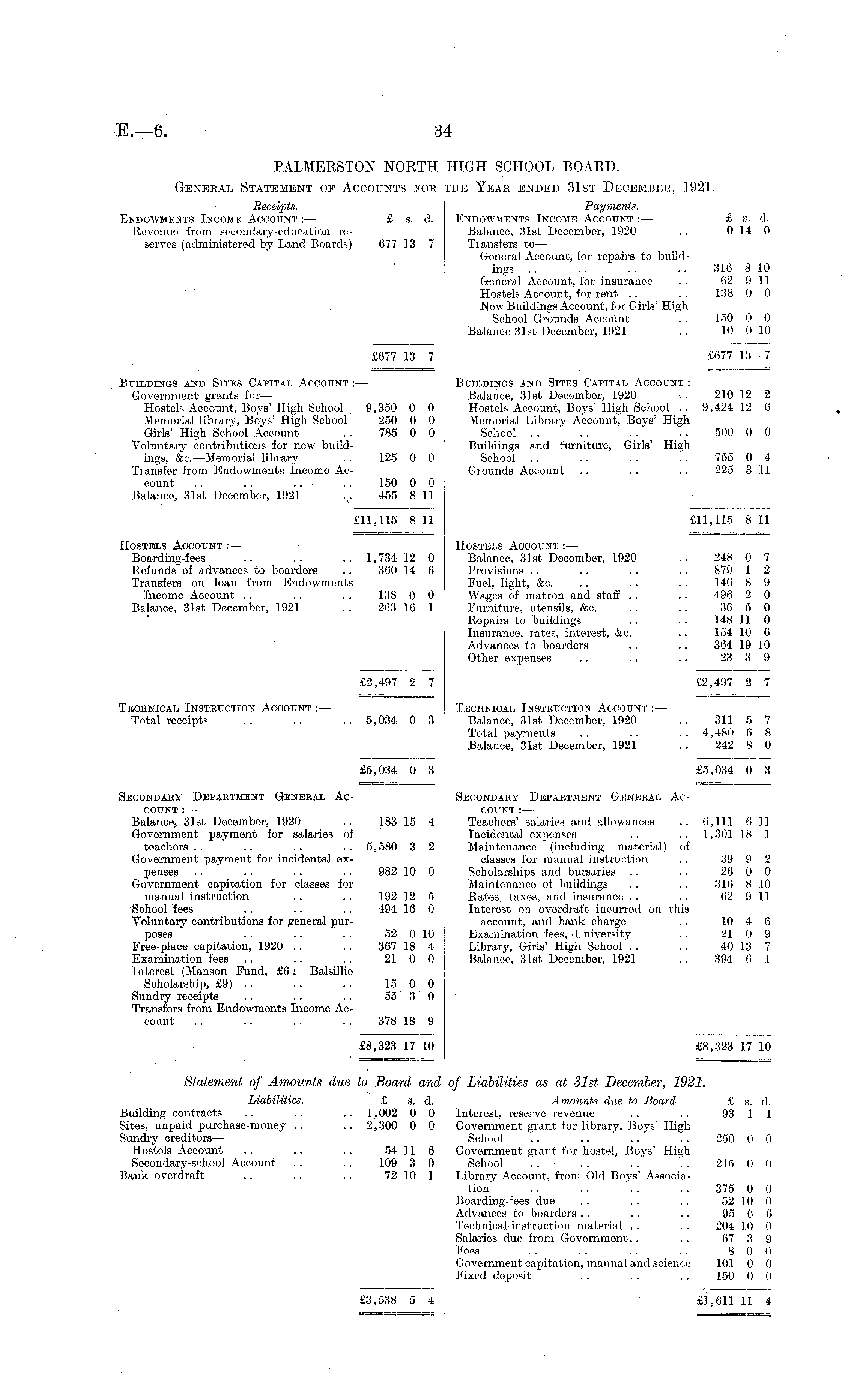 PALMERSTON NORTH HIGH SCHOOL BOARD. General Statement of Accounts for the Year ended 31st December, 1921. Receipts. Payments. Endowments Income Account :— £ s. d. Endowments Income Account :— £ s. d. Revenue from secondary-education re- Balance, 31st December, 1920 .. 014 0 serves (administered by Land Boards) 677 13 7 Transfers to — General Account, for repairs to buildings . . .. .. .. 316 8 10 General Account, for insurance . . 62 9 11 Hostels Account, for rent, .. . . 138 0 0 New Buildings Account, for Girls' High School Grounds Account . . 150 0 0 Balance 31st December, 1921 .. 10 0 10 £677 13 7 £677 13 7 Buildings and Sites Capital Account :— Buildings and Sites Capital Account :— Government grants for — Balance, 31st December, 1920 . . 210 12 2 Hostels Account, Boys' High School 9,350 0 0 Hostels Account, Boys' High School .. 9,424 12 6 Memorial library, Boys' High School 250 0 0 Memorial Library Account, Boys' High Girls' High School Account . . 785 0 0 School .. . . . .' .. 500 0 0 Voluntary contributions for new build- Buildings and furniture, Girls' High ings, &c—Memorial library .. 125 0 0 School . . . . .. .. 755 0 4 Transfer from Endowments Income Ac- Grounds Account .. . . .. 225 3 11 count .. .. ... .. 150 0 0 Balance, 31st December, 1921 v 455 8 11 £11,115 8 11 £11,115 8 11 Hostels Account .-— Hostels Account :— Boarding-fees .. .. .. 1,734 12 0 Balance, 31st December, 1920 .. 248 0 7 Refunds of advances to boarders .. 360 14 6 Provisions . . .. .. .. 879 1 2 Transfers on loan from Endowments Fuel, light, &o. . . . . . • 146 8 9 Income Account .. .. . . 138 0 0 Wages of matron and staff .. .. 496 2 0 Balance, 31st December, 1921 . . 263 16 1 Furniture, utensils, &o, .. .. 36 5 0 Repairs to buildings .. . . 148 11 0 Insurance, rates, interest, &o. . . 154 10 6 Advances to boarders .. .. 364 19 10 Other expenses .. .. .. 23 3 9 £2,497 2 7 £2,497 2 7 Technical Instruction Account :— Technical Instruction Account :— Total receipts .. .. .. 5,034 0 3 Balance, 31st December, 1920 .. 311 5 7 Total payments .. .. .. 4,480 6 8 Balance, 31st December, 1921 .. 242 8 0 £5,034 0 3 £5,034 0 3 Secondary Department General Ac- Secondary Department General Account : —■ count : — Balance, 31st December, 1920 .. 183 15 4 Teachers' salaries and allowances .. 6,111 6 11 Government payment for salaries of Incidental expenses .. .. 1,301 18 1 teachers .. .. .. .. 5,580 3 2 Maintenance (including material) of Government payment for incidental ex- classes for manual instruction .. 39 9 2 penses .. . . .. .. 982 10 0 Scholarships and bursaries .. .. 26 0 0 Government capitation for classes for Maintenance of buildings . . .. 316 8 10 manual instruction . . . . 192 12 5 Rates, taxes, and insurance . . . . 62 9 11 School foes .. .. .. 494 16 0 Interest on overdraft incurred on this Voluntary contributions for general pur- account, and bank charge .. 10 4 6 poses . . . . . . 52 010 Examination fees, • I nivorsity . . 210 9 Free-placo capitation, 1920 .. . . 367 18 4 I Library, Girls' High School .. .. 40 13 7 Examination fees .. .. .. 21 0 0 Balance, 31st December, 1921 .. 394 6 1 Interest (Manson Fund, £6; Balsillie Scholarship, £9) .. . . . . 15 0 0 Sundry receipts .. .. . . 55 3 0 Transfers from Endowments Income Account .. .. .. . . 378 18 9 £8,323 17 10 £8,323 17 10 Statement of Amounts due to Board and of Liabilities as at 31st December, 1921. Liabilities. £ s. d. , Amounts due to Board £ s. d. Building contracts .. .. 1,002 0 0 Interest, reserve revenue . . .. 93 1 1 Sites, unpaid purchase-money .. .. 2,300 0 0 Government grant for library, Boys' High Sundry creditors — Sohool .. .. .. . . 250 0 0 Hostels Account .. .. . . 54 11 6 Government grant for hostel, Boys' High Secondary-school Account .. .. 109 3 9 School .. .. .. .. 215 0 0 Bank overdraft .. .. .. 72 10 I Library Account, from Old Boys' Association . . . . '. . . . 375 0 0 Boarding-fees due . . . . .. 52 10 0 Advances to boarders . . . . .. 95 6 6 Technical-instruction material . . . . 204 10 0 Salaries due from Government.. . . 67 3 9 Fees . . . . . . . . 8 0 0 Government capitation, manual and science 101 0 0 Fixed deposit .. . . . . 150 0 0 £3,538 5 4 £1,611 11 4