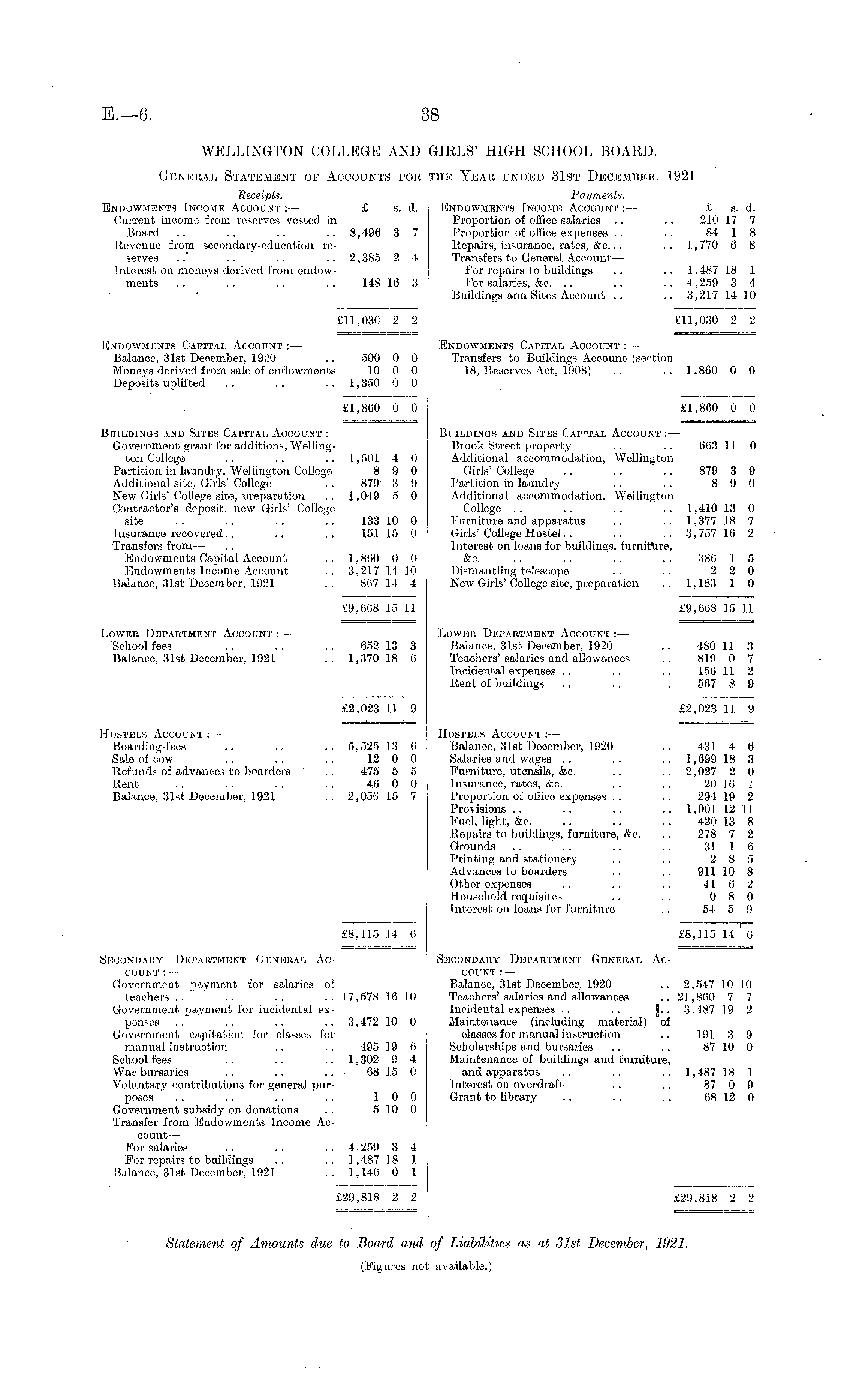 WELLINGTON COLLEGE AND GIRLS' HIGH SCHOOL BOARD. General Statement of Accounts for the Year ended 31st December, 1921 Receipts. Payments. Endowments Income Account :— £ s. d. Endowments Income Account :— £ s. d. Current income from reserves vested in Proportion of office salaries .. .. 210 17 7 Board .. . . .. . . 8,496 3 7 Proportion of office expenses .. .. 84 1 8 Revenue from secondary-education re- Repairs, insurance, rates, &c.. . .. 1,770 6 8 serves ..' .. .. .. 2,385 2 4 Transfers to General Account — Interest on moneys derived from endow- For repairs to buildings .. .. 1.487 18 1 mcnts .. .. ~ .. 148 16 3 For salaries, &o. .. .. .. 4,259 3 4 Buildings and Sites Account .. .. 3,217 14 10 £11,030 2 2 £11,030 2 2 Endowments Capital Account:— Endowments Capital Account : - Balance, 31st December,, 1920 .. 500 0 0 Transfers to Buildings Account (section Moneys derived from sale of endowments 10 0 0 18, Reserves Act, 1908) . . .. 1,860 0 0 Deposits uplifted .. .. .. 1,350 0 0 £1,860 0 0 £1,860 0 0 Buildings and Sites Capital Account :•— Buildings and Sites Capital Account :— Government grant for additions, Welling- Brook Streot property .. .. 663 11 0 ton College .. .. .. 1,501. 4 0 Additional accommodation, Wellington Partition in laundry, Wellington. College 8 9 0 Girls' College .. .. .. 879 3 9 Additional site, Girls' College . . 879' 3 9 Partition in laundry .. . . 8 9 0 New Girls' College site, preparation .. 1,049 5 0 Additional accommodation. Wellington Contractor's deposit, new Girls' College College .. .. .. .. 1,410 13 0 site .. .. .. .. 133 10 0 Furniture and apparatus .. .. 1,377 18 7 Insurance recovered.. .. .. 151. 15 0 Girls' College Hostel.. .. .. 3,757 16 2 Transfers from— .. Interest on loans for buildings, furnittrre, Endowments Capital Account .. 1,860 0 0 dc, .. .. .. .. 386 I 5 Endowments Income Account .. 3,217 14 10 Dismantling telescope .. .. 2 2 0 Balance, 31st December, 1921 .. 867 14 4 New Girls' College site, preparation .. 1,183 1 0 £9,668 15 11 £9,668 15 11 Lower Department Account : — Lower Department Account :— School fees .. .'. .. 652 13 3 Balance, 31st December, 1920 .. 480 11 3 Balance, 31st December, 1921 .. 1,370 18 6 Teachers' salaries and allowances .. 819 0 7 Incidental expenses . . . . .. 156 11 2 Rent of buildings .. .. .. 567 8 9 £2,023 11 9 £2,023 II 9 Hostels Account :— Hostels Account -.— Boarding-fees .. .. .. 5,525 13 0 Balance, 31st December, 1920 .. 431 4 6 Sale of cow .. .. .. 12 0 0 Salaries and wages .. .. . . 1,699 18 3 Refunds of advances to boarders .. 475 5 5 Furniture, utensils, &c. .. .. 2,027 2 0 Rent .. .. .. .. 46 0 0 Insurance, rates, &c. .. .. 20 16 4 Balance, 31st December, 1921 .. 2,056 15 7 Proportion of office expenses .. .. 294 19 2 Provisions .. .. .. .. 1,901 12 11 Fuel, light, &o. .. .. . . 420 13 8 Repairs to buildings, furniture, Ac. .. 278 7 2 Grounds .. .. .. .. 31 1 6 Printing and stationery . . .. 2 8 5 Advances to boarders .. .. 911 10 8 Other expenses .. . . . . 416 2 Household requisites . . . . 0 8 0 Interest on loans for furniture . . 54 5 9 £8,115 14 6 £8,115 14 6 Secondary Dupartment General Ac- Secondary Department General Account : - count : — Government payment for salaries of Balance, 31st December, 1920 .. 2,547 10 10 teachers .. .. .. .. 17,578 10 10 Teachers'salaries and allowances .. 21,860 7 7 Government payment for incidental ex- Incidental expenses ~ .. \.. 3,487 19 2 penses .. .. .. .. 3,472 10 0 Maintenance (including material) of Government capitation for classes for classes for manual instruction . . 191 3 9 manual instruction .. .. 495 19 6 Scholarships and bursaries .. .. 87 10 0 School fees . . . . . . 1,302 9 4 Maintenance of buildings and furniture, War bursaries .. .. .. 68 15 0 and apparatus .. .. .. 1,487 18 1 Voluntary contributions for general pur- Interest on overdraft .. .. 87 0 9 poses '.. .. . . .. 10 0 Grant to library .. .. .. 68 12 0 Government subsidy on donations . . 5 10 0 Transfer from Endowments Income Account— For salaries .. .. .. 4,259 3 4 For repairs to buildings .. .. 1,487 18 1 Balance, 31st December; 1921 .. 1,146 0 I £29,818 2 2 £29,818 2 2 Statement of Amounts due to Board and of Liabilities as at 31st December, 1921. (Figures not available.)