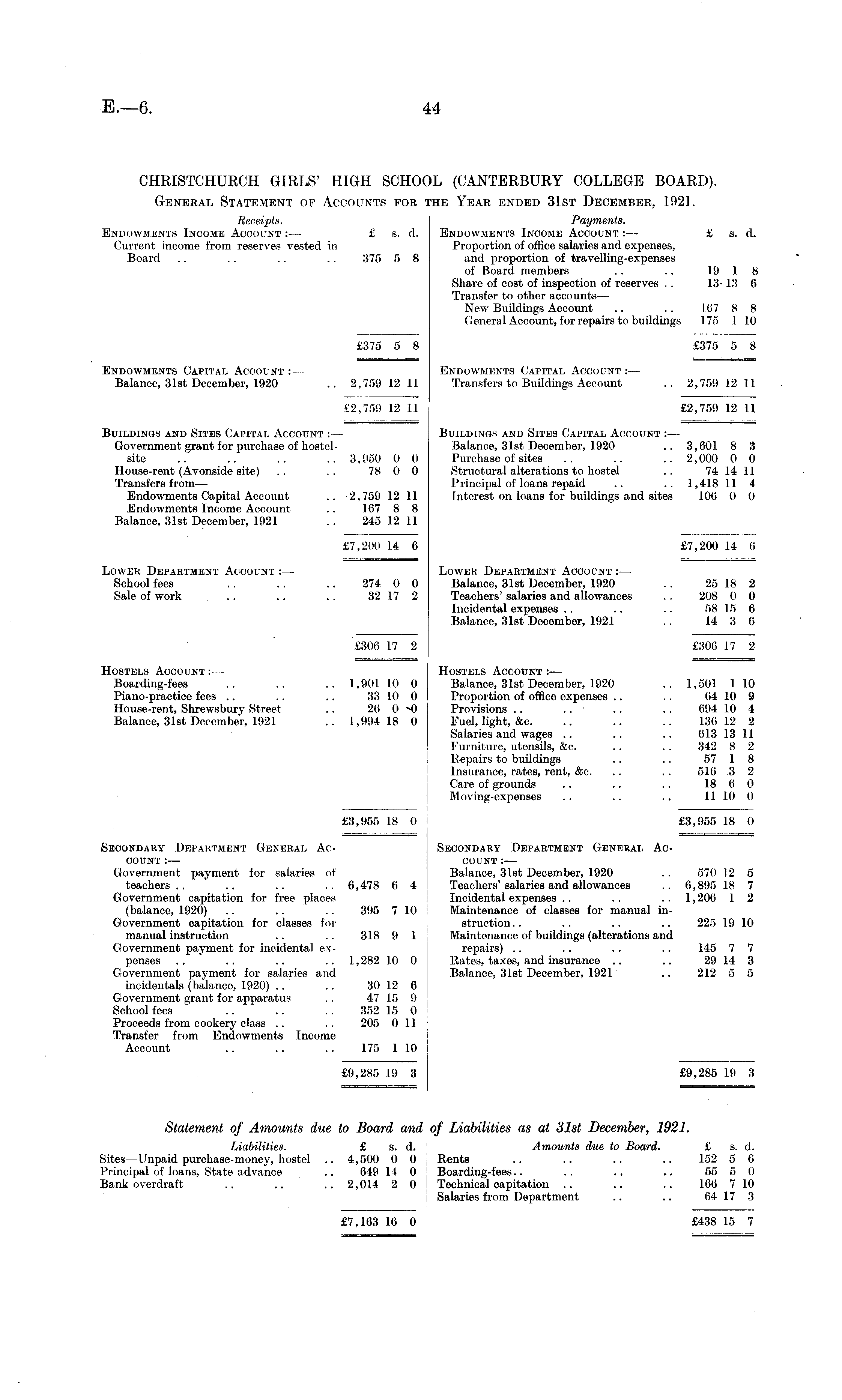 CHRISTCHURCH GIRLS' HIGH SCHOOL (CANTERBURY COLLEGE BOARD). General Statement of Accounts for the Year ended 31st December, 1921. Receipts. Payments. Endowments Income Account :— £ s. d. Endowments Income Account :— £ s. d. Current income from reserves vested in Proportion of office salaries and expenses, Board .. .. .. .. 375 5 8 and proportion of travelling-expenses of Board members .. .. 19 1 8 Share of cost of inspection of reserves . . 13-13 6 Transfer to other accounts— New Buildings Account .. .. 167 8 8 General Account, for repairs to buildings 175 110 £375 5 8 £375 5 8 Endowments Capital Account:— Knuowmknts Capital Account: Balance, 31st December, 1920 .. 2,759 12 11 Transfers to Buildings Account .. 2,759 12 11 £2,759 12 11 £2,759 12 11 Buildings and Sites Capital Account :— Buildings and Sites Capital Account :— Government grant for purchase of hostel- Balance, 31st December, 1920 .. 3,601 8 3 site .. .. .. .. 3,950 0 0 Purchase of sites .. .. .. 2,000 0 0 House-rent (Avonside site) .. .. 78 0 0 Structural alterations to hostel .. 74 14 11 Transfers from— Principal of loans repaid .. .. 1,418 11 4 Endowments Capital Account 2,759 12 11 Interest on loans for buildings and sites 106 0 0 Endowments Income Account .. 167 8 8 Balance, 31st December, 1921 . . 245 12 11 £7,200 14 6 £7,200 14 6 Lower Department Account :— Lower Department Account :— School fees .. .. .. 274 0 0 Balance, 31st December, 1920 . . 25 18 2 Sale of work .. .. .. 32 17 2 Teachers' salaries and allowances .. 208 0 0 Incidental expenses .. .. .. 58 15 6 Balance, 31st December, 1921 . . 14 3 6 £306 17 2 £306 17 2 Hostels Account :— Hostels Account :— Boarding-fees .. .. .. 1,901 10 0 Balance, 31st December, 1920 .. 1,501 110 Piano-practice fees .. .. .. 33 10 0 Proportion of office expenses .. .. 64 10 9 House-rent, Shrewsbury Street .. 20 0S) Provisions .. .. ■ .. .. 694 10 4 Balance, 31st December, 1921 .. 1,994 18 0 Fuel, light, &c. .. .. .. 136 12 2 Salaries and wages .. .. .. 613 13 11 Furniture, utensils, &c. .. . . 342 8 2 Repairs to buildings .. .. 57 1 8 Insurance, rates, rent, &c. .. . . 516 .3 2 Care of grounds .. .. .. 18 6 0 Moving-expenses .. .. .. 11 10 0 £3,955 18 0 £3,955 18 0 Secondary Department General Ac- Secondary Department General Account :— count: — Government payment for salaries of Balance, 31st December, 1920 . . 570 12 5 teachers .. .. .. .. 6,478 6 4 Teachers'salaries and allowances .. 6,895 18 7 Government capitation for free places Incidental expenses .. .. .. 1,206 1 2 (balance, 1920) .. .. . . 395 7 10 Maintenance of classes for manual inGovernment capitation for classes for struction.. .. .. .. 225 19 10 manual instruction .. .. 318 9 1 , Maintenance of buildings (alterations and Government payment for incidental ex- repairs) .. .. .. .. 145 7 7 penses .. .. .. .. 1,282 10 0 Rates, taxes, and insurance .. .. 29 14 3 Government payment for salaries and Balance, 31st December, 1921 .. 212 5 5 incidentals (balance, 1920) .. .. 30 12 6 Government grant for apparatus . . 47 15 9 School fees .. .. . . 352 15 0 Proceeds from cookery class .. .. 205 0 11 Transfer from Endowments Income Account .. .. .. 175 1 10 £9,285 19 3 £9,285 19 3 Statement of Amounts due to Board and of Liabilities as at 31st December, 1921. Liabilities. £ s. d. ' Amounts due to Board. £ s. d. Sites —Unpaid purchase-money, hostel .. 4,500 0 0 Rents .. .. .. .. 152 5 6 Principal of loans, State advance .. 649 14 0 | Boarding-fees.. .. .. .. 55 5 0 Bank overdraft .. .. .. 2,014 2 0 . Technical capitation .. .. .. 166 7 10 Salaries from Department .. .. 64 17 3 £7,163 16 0 £438 15 7