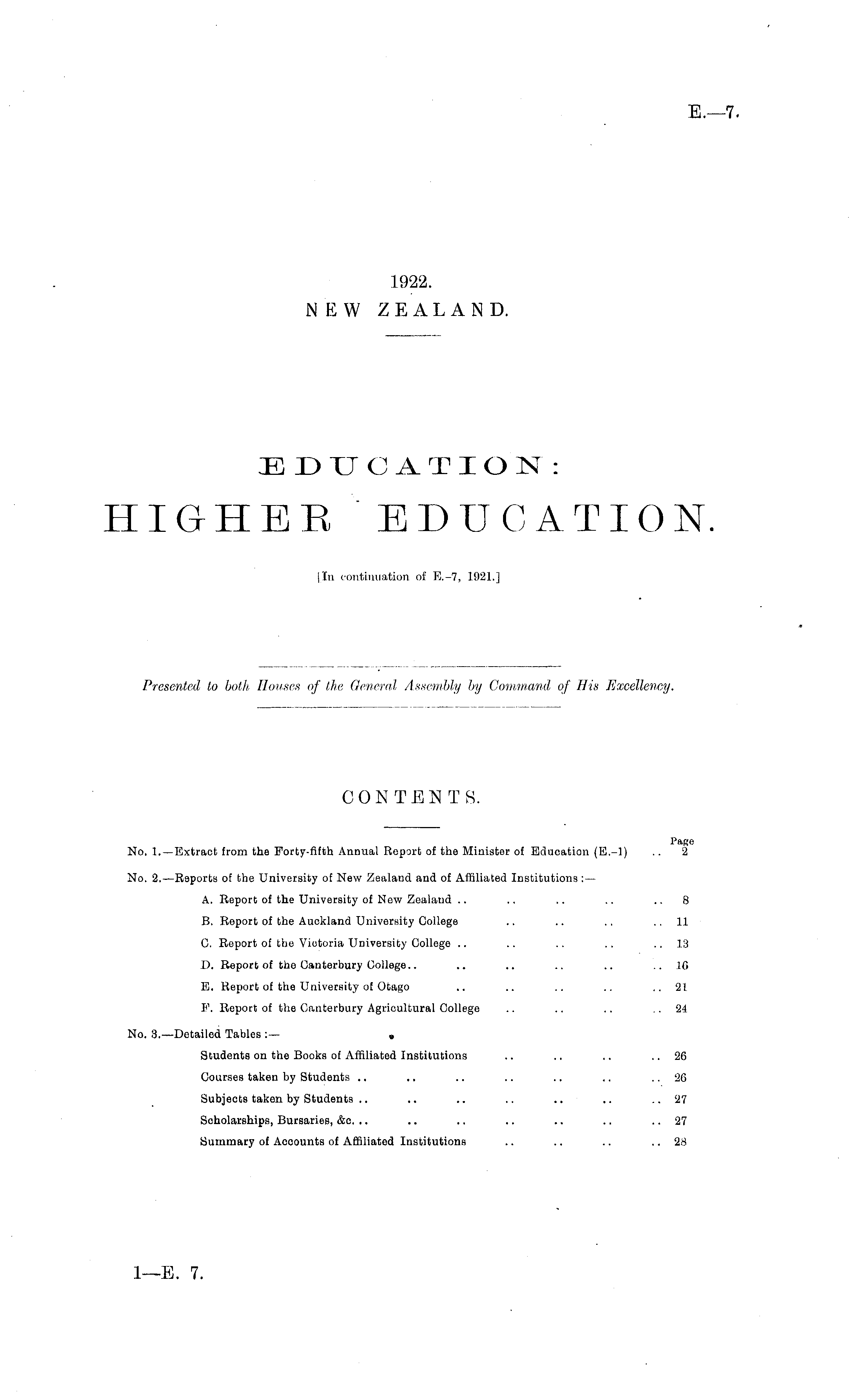 EDUCATION: HIGHER EDUCATION. [In continuation of E.-7, 1921.]