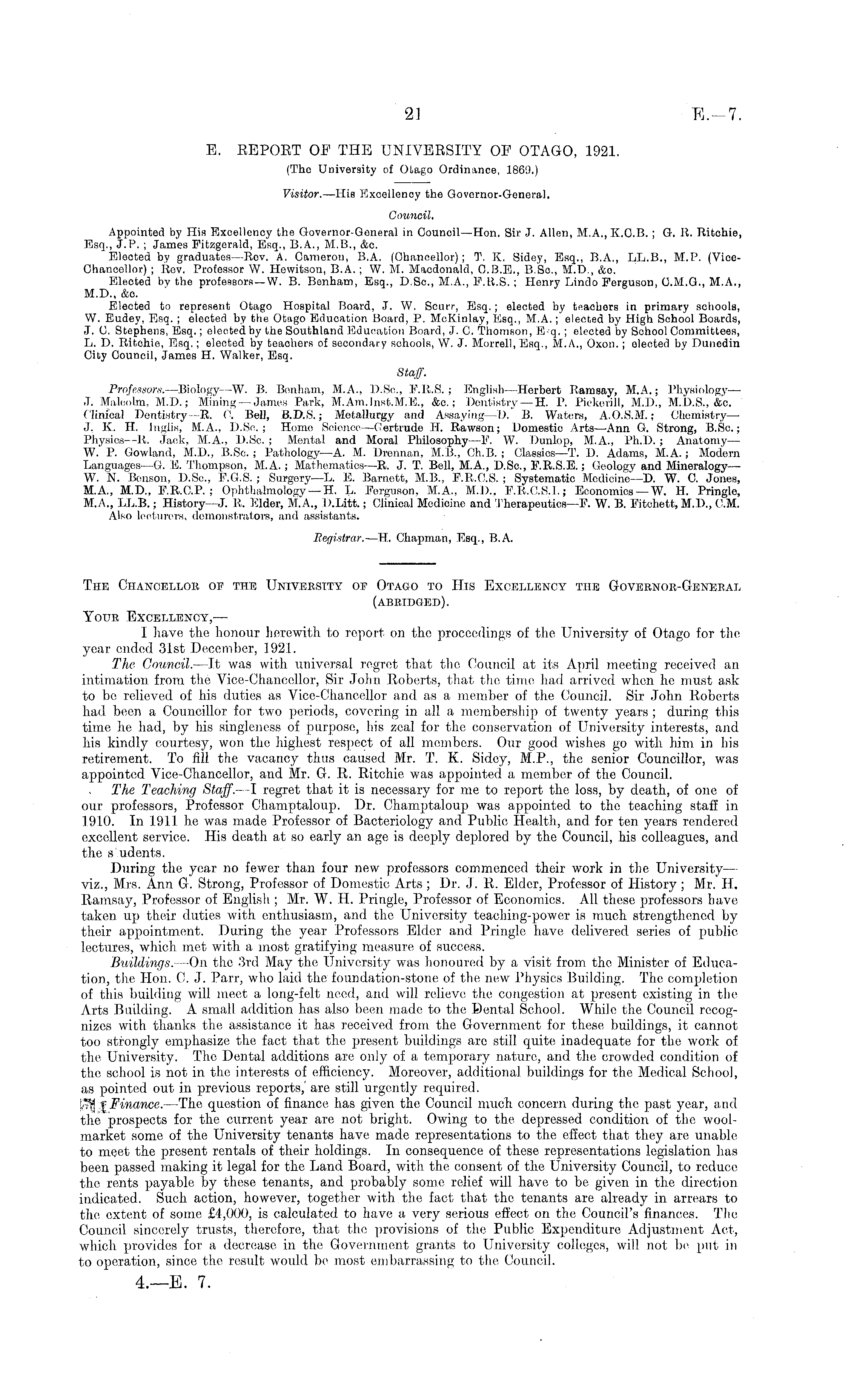 E. REPORT OF THE UNIVERSITY OF OTAGO, 1921. (The University of Otago Ordinance, 1869.) Visitor. —His Excellency the Govornor-General. Council. Appointed by His Excellency the Governor-General in Council—Hon. Sir J. Allen, M.A., X.0.8. ; G. R. Ritchie, Esq., J.P. ; James Fitsjgorald, Esq., 8.A., M.8., &c. Eleoted by graduates—Roy. A. Cameron, B.A. (Chancellor); T. K. Sidey, Esq., 8.A., LL.B., M.P. (ViceChancellor) ; Roy. Professor W. Hewitson, B.A. ; W. M. Macdonald, 0.8. E., B.Sc, M.D., &o. Elected by the professors —W. B. Benham, Esq., D.Sc, M.A., E.R.S. ; Henry Lindo Ferguson, CM.G., M.A., M.D., &o. Elected to represent Otago Hospital Board, J. W. Scurr, Esq.; elected by teaohers in primary schools, W. Eudey, Esq. ; elected by the Ot>igo Education Board, P. McKinlay, Esq., M.A.; elected by High School Boards, J. C. Stephens, Esq.; elected by the Southland Education Board, J. C. Thomson, E-q. ; elected by School Committees, L. D. Ritchie, Esq.; elected by teachers of secondary schools, W. J. Morrell, Esq., M.A., Oxon. ; elected by Dunedin City Council, James H. Walker, Esq. Staff. Professors. —Biology—W. B. Benham, M.A., D.Sc, F.R.S. ; English—Herbert Ramsay, M.A.; Physiology— J. Malcolm, M.D.; Mining —James Park, M.Ain.lnst.M.H., &c.; Dentistry —H. P. Pickcrill, M.D., M.D.S., &'c. Clinical Dentistry-—R. C. Bell, 8.D.5.; Metallurgy and Assaying—l).' B. Waters, A.0.5.M.; Chemistry— J. K. H. iuglis, M.A., D.Sc; Home Science —Gertrude IT. Rawson; Domestic Arts —-Ann G. Strong, B.Sc; Physics—R. Jaok, M.A., D.Sc ; Mental and Moral Philosophy —F. W. Dunlop, M:.A., Ph.D. ; Anatomy— W. P. Gowland, M.D., B.Sc. ; Pathology—A. M. Drennan, M.8., Ch.B. ; Classics—T. D. Adams, M.A.; Modern Languages—G. E. Thompson, M.A. ; Mathematics—R. J. T, 8011, M.A., D.Sc, F.R.S.E.; Geology and Mineralogy— W. N. Benson, D.Sc, F.G.S. ; Surgery—L. E. Barnett, M.8., F.R.C.S. ; Systematic Medicine—D. W. C. Jones, M.A., M.D., F.R.C.P. ; Ophthalmology —H. L, Ferguson. M.A., M.D.. F.R.C.S. 1.; Economics —W. H. Pringle, M.A., LL.B.; History -J. R. Elder, M.A., D.Litt.; Clinical Medicine and Therapeutics—F. W. B. Fitehett, M.D., C.M. Also lecturers, demonstrators, and assistants. Registrar. —H. Chapman, Esq., B.A. The Chancellor of the University of Otago to His Excellency the Governor-General (abridged). Your Excellency,— I have the honour herewith to report on the proceedings of the University of Otago for the ye<ir ended 31st December, 1921. The Council. —It was with universal regret that the Council at its April meeting received an intimation from the Vice-Chancellor, Sir John Roberts, that the time had arrived when he must ask to be relieved of his duties as Vice-Chancellor and as a member of the Council. Sir John Roberts had been a Councillor for two periods, covering in all a membership of twenty years ; during this time he had, by his singleness of purpose, his zeal for the conservation of University interests, and his kindly courtesy, won the highest respect of all members. Our good wishes go with him in his retirement. To fill the vacancy thus caused Mr. T. K. Sidey, M.P., the senior Councillor, was appointed. Vice-Chancellor, and Mr. G. R. Ritchie was appointed a member of the Council. The Teaching Staff.- I regret that it is necessary for me to report tho loss, by death, of one of our professors, Professor Champtaloup. Dr. Ohamptaloup was appointed to the teaching staff in 191.0. In 1911 he was made Professor of Bacteriology and Public Health, and for ton years rendered excellent service. His death at so early an age is deeply deplored by the Council, his colleagues, and the s udents. During the year no fewer than four new professors commenced their work in the University— viz., Mrs. Ann G. Strong, Professor of Domestic Arts ; Dr. J. R. Elder, Professor of History ; Mr. H. Ramsay, Professor of English ; Mr. W. H. Pringle, Professor of Economics. All these professors have taken up their duties with enthusiasm, and the University teaching-power is much strengthened by their appointment. During the year Professors Elder and Pringle have delivered series of public lectures, which met with a most gratifying measure of success. Buildings. —On the 3rd May the University was honoured by a visit from the Minister of Education, the Hon. C. J. Parr, who laid the foundation-stone of the new Physics Building. The completion of this building will meet a long-felt need, and will relieve the congestion at present existing in the Arts Building. A small addition has also been made to the Dental School. While the Council recognizes with thanks the assistance it has received from, the Government for these buildings, it cannot too strongly emphasize the fact that the present buildings are still quite inadequate for the work of the University. The Dental additions are only of a temporary nature, and the crowded condition of the school is not in the interests of efficiency. Moreover, additional buildings for the Medical School, as pointed out in previous reports,' are still urgently required. '™fi | Finance. —The question of finance has given the Council much concern during the past year, and the prospects for the current year are, not bright. Owing to the depressed condition of the woolmarket some of the University tenants have made representations to the effect that they are unable to meet the present rentals of their holdings. In consequence of these, representations legislation has been passed making it legal for the Land Board, with the consent of the University Council, to reduce the rents payable by these tenants, and probably some relief will have to be given in the direction indicated. Such action, however, together with the fact that the tenants are already in arrears to the extent of some £1,000, is calculated to have a very serious effect on the Council's finances. The Council sincerely trusts, therefore, that the provisions of the Public Expenditure 