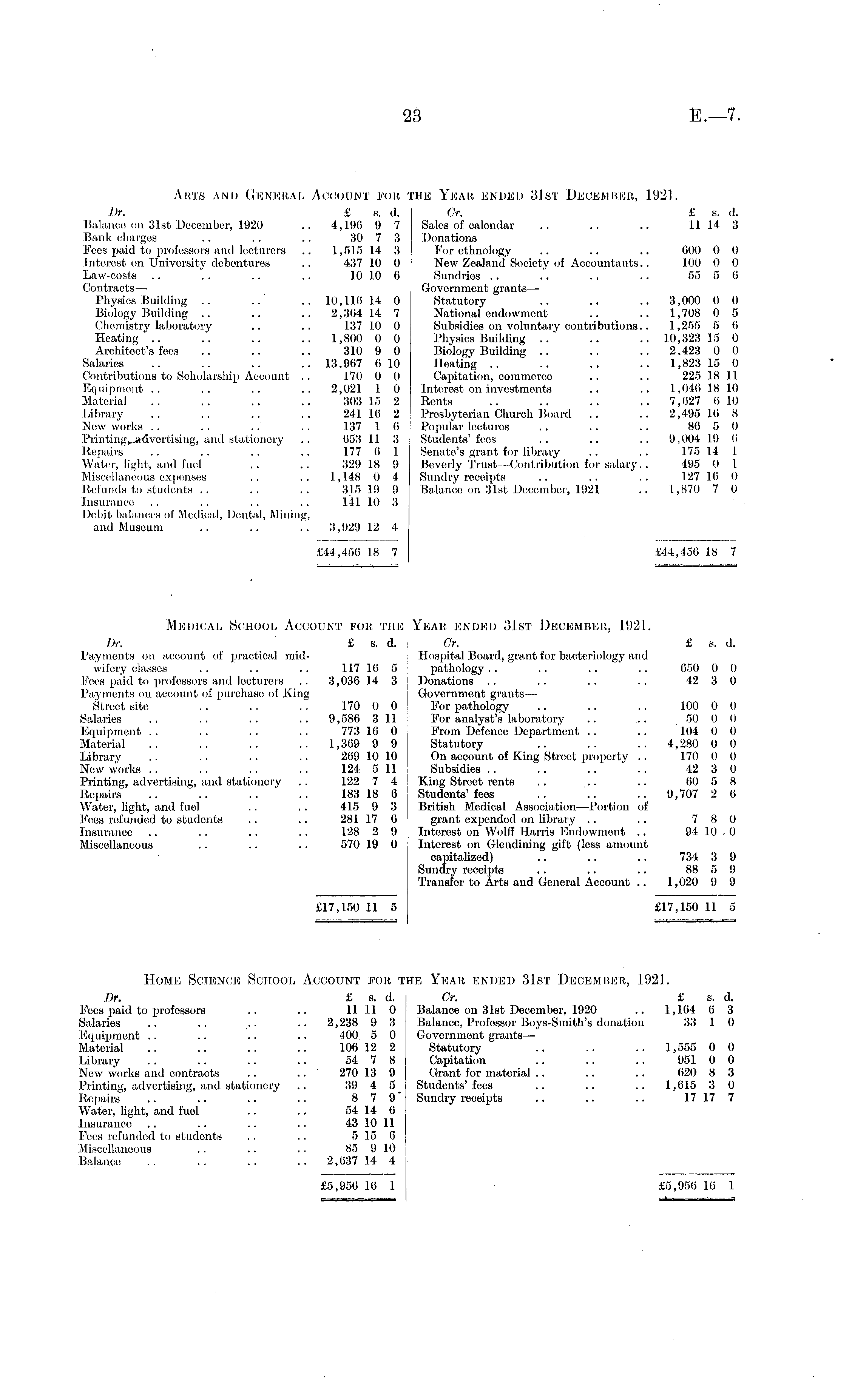 Arts and General Account for the Year ended 31st December, 1921. Dr. £ s. d. Or, £ s. d. Balance on 31st December, 1920 .. 4,190 9 7 Sales of calendar .. .. .. 11 14 3 Bank charges .. .. .. 30 7 3 Donations Fees paid to professors and lecturers .. 1,515 14 3 For ethnology .. .. .. 000 0 0 Interest on University debentures .. 437 10 0 Now Zealand Society of Accountants.. 100 0 0 Law-costs .. . . .. .. 10 10 0 Sundries .. .. .. .. 55 5 0 Contracts— Government grants — Physics Building .. ..' .. 10,116 14 0 Statutory .. .. .. 3,000 0 0 Biology Building .. .. .. 2,304 14 7 National endowment .. .. 1,708 0 5 Chemistry laboratory .. .. 137 10 0 Subsidies on voluntary contributions.. 1,255 5 6 Heating .. .. .. .. 1,800 0 0 Physics Building ..' .. .. 10,323 15 0 Architect's fees .. .. .. 310 9 0 Biology Building .. .. .. 2,423 0 0 Salaries .. .. .. .. 13.967 610 Heating .. .. .. .. 1,823 15 0 Contributions to Scholarship Account .. 170 0 0 Capitation, oommeroe .. .. 225 18 11 Equipment .. .. .. .. 2,021 1 0 Interest on investments .. .. 1,046 18 10 Material .. .. .. .. 303 15 2 Rents .. .. .. .. 7,627 6 10 Library .. .. .. .. 241 16 2 Presbyterian Church Board .. .. 2,495 10 8 New works .. .. .. .. 137 1 0 Popular lectures .. .. .. 86 5 0 and stationery .. 653 11 3 Students'fees .. .. .. 9,004 19 6 Repairs .. .. .. .. 177 6 1 Senate's grant for library .. .. 175 14 1 Water, light, and fuel .. .. 329 18 9 Beverly Trust -Contribution for salary.. 495 0 I Miscellaneous expenses .. .. 1,148 0 4 Sundry receipts .. .. .. 127 16 0 Refunds to students .. .. .. 3.15 19 9 Balance on 31st December, 1921 .. 1,870 7 0 Insurance .. .. .. .. 141 10 3 Debit balances of Medical, Dental, Milling, and Museum .. .. .. 3,929 12 4 £44,450 18 7 £44,456 18 7 Medical School Account for the Year ended 31st December, 1921. Dr. £ s. d. Or. £ 8. d. Payments on account of praotioal mid- Hospital Board, grant for bacteriology and wif cry classes .. 117 16 5 pathology.. .. .. .. 650 0 0 Fees paid to professors and lecturers .. 3,036 14 3 Donations .. .. .. .. 42 3 0 Payments on account of purchase of King Government grants— Street site .. .. . . 170 0 0 I'or pathology .. .. . . 100 0 0 Salaries .. .. .. .. 9,586 311 For analyst's laboratory .. ... 50 0 0 Equipment . . .. . . .. 773 16 0 From Defence Department .. .. 104 0 0 Material .. .. .. .. 1,369 9 9 Statutory .. .. .. 4,280 0 0 Library .. .. .. .. 269 10 10 On account of King Street property . . 170 0 0 New works .. .. .. .. 124 5 11 Subsidies . . .. .. . . 42 3 0 Printing, advertising, and stationery . . 122 7 4 King Streot rents .. .. .. 60 5 8 Repairs .. .. .. .. 183 18 6 Students'fees .. .. .. 9,707 2 6 Water, light, and fuel .. .. 415 9 3 British Medical Association—Portion of Fees refunded to students .. .. 281 17 6 grant expended on library .. .. 7 8 0 Insurance .. . . .. .. 128 2 9 Interest on Wolff Harris Endowment .. 94 10 • 0 Miscellaneous .. .. .. 570 19 0 Interest on Glendimng gift (less amount capitalized) .. .. .. 734 3 9 Sundry receipts .. .. .. 88 5 9 Transfer to Arts and General Account .. 1,020 9 9 £17,150 11 5 £17,150 11 5 Home Science School Account for the Yioah ended 31st Decemhur, 1921. Dr. £ s. d. Cr. £ s. d. Fees paid to professors .. .. 11 11 0 Balance on 31st December, 1920 .. 1,164 6 3 Salaries .. .. .. .. 2,238 9 3 Balance, Professor Boys-Smith's donation 33 1 0 Equipment .. .. .. .. 400 5 0 Government grants— Material .. .. .. .. 106 12 2 Statutory .. .. .. 1,555 0 0 Library . . .. .. .. 54 7 8 Capitation .. .. .. 951 0 0 New works and contracts .. .. 270 13 9 Grant for material .. .. .. 620 8 3 Printing, advertising, and stationery .. 39 4 5 Students'fees .. .. .. 1,615 3 0 Repairs .. .. .. .. 8 7 9' Sundry receipts .. .. .. 17 17 7 Water, light, and fuel .. .. 54 14 6 Insurance .. .. .. .. 43 10 11 Fees refunded to students . . . . 5 15 (i Miscellaneous .. .. . . 85 910 Balance .. . . . . .. 2,637 14 4 £5,956 16 1 £5,956 16 1
