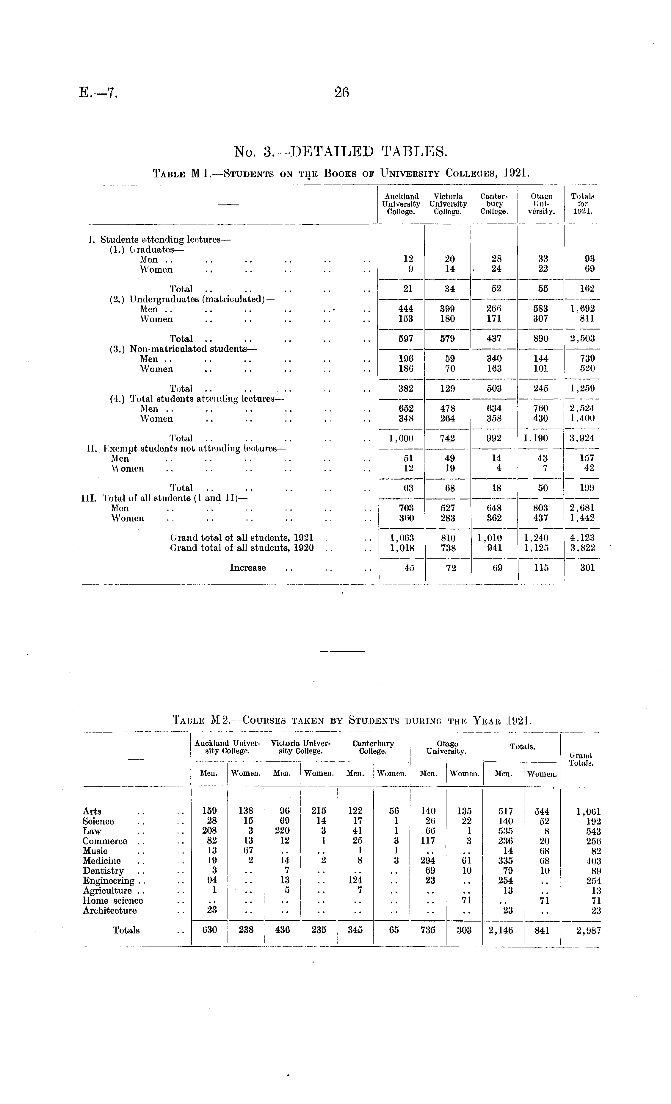 No. 3.—DETAILED TABLES. Table M 1.—Students on the Books of University Colleges, 1921.
