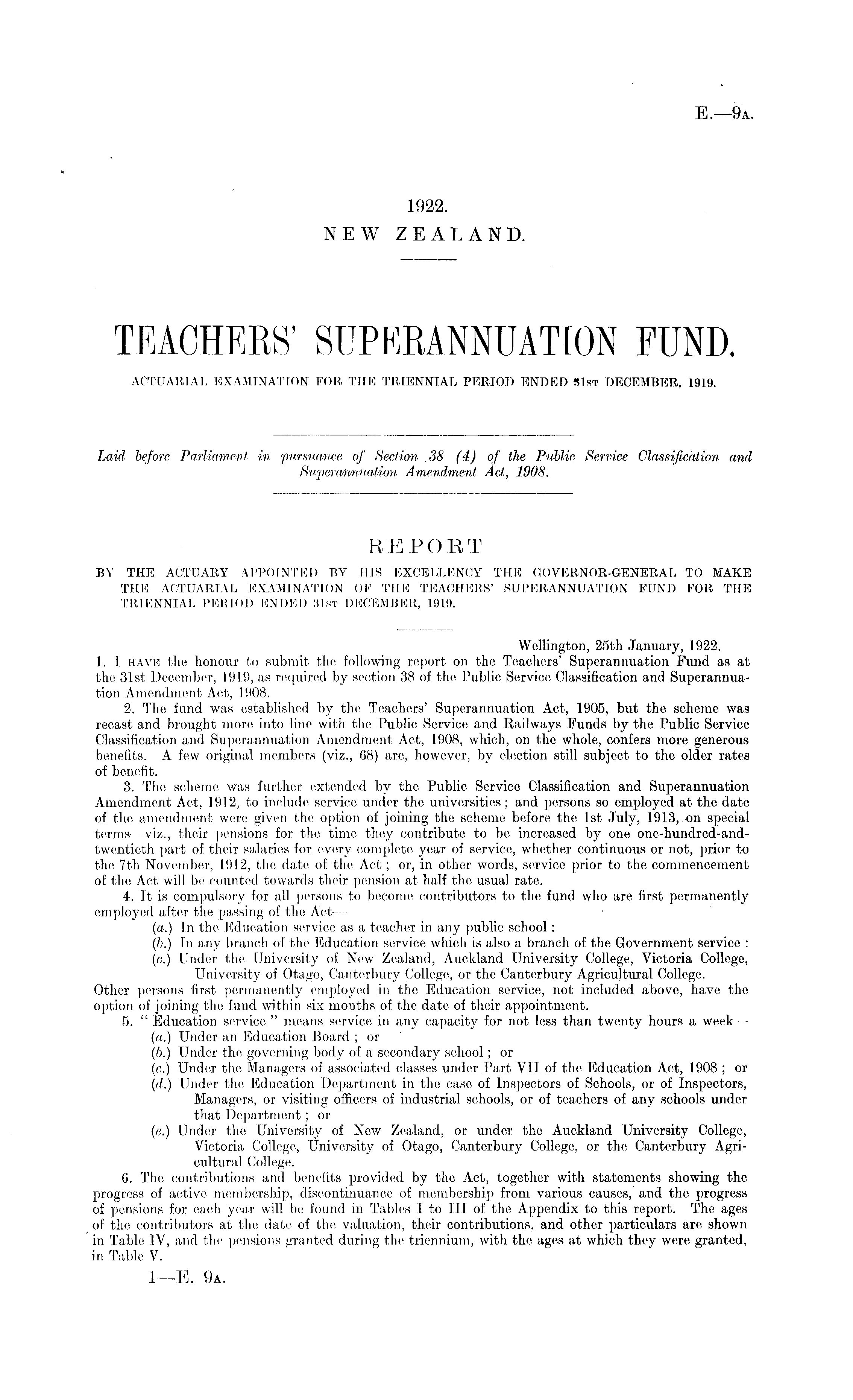 REPORT BY THE ACTUARY APPOINTED BY HIS EXCELLENCY THE GOVERNOR-GENERAL TO MAKE THE ACTUARIAL EXAMINATION OF THE TEACHERS' SUPERANNUATION FUND FOR THE TRIENNIAL PERIOD ENDED 31st DECEMBER, 191.9. Wellington, 25th January, 1922. 1. T have the honour to submit the following report on the Teachers' Superannuation Fund as at the 31st December, 1.919, as required by section 38 of the Public Service Classification and Superannuation Amendment Act, 1908. 2. The fund was established, by the Teachers' Superannuation Act, 1905, but the scheme was recast and brought more into line with the Public Service and Railways Funds by the Public Service Classification and Superannuation Amendment Act, 1908, which, on the whole, confers more generous benefits. A few original members (viz., 68) are, however, by election still subject to the older rates of benefit. 3. The scheme was further extended by the Public Service Classification and Superannuation Amendment Act, 1912, to include service under the universities ; and persons so employed at the date of the amendment were given the option of joining the scheme before the Ist July, 1913, on special terms —viz., their pensions for the time they contribute to be increased by one one-hundred-and-twentieth part of their salaries for every complete year of service, whether continuous or not, prior to the 7th November, 1912, the date of the Act; or, in other words, service prior to the commencement of the. Act will be counted towards their pension at half the usual rate. 4. It is compulsory for all persons to become contributors to the fund who are first permanently employed after the passing of the Act — (a.) In the Education service as a teacher in any public school : (/;.) In any branch of the Education service which is also a branch of the Government service : (c.) Under the University of New Zealand, Auckland University College, Victoria College, University of Otago, Canterbury College, or the Canterbury Agricultural College. Other persons first permanently employed in the Education service, not included above, have the option of joining the fund within six months of the date of their appointment. 5. " Education service " means service in any capacity for not less than twenty hours a week— (a.) Under an Education Board ; or (b.) Under the governing body of a secondary school; or (o.) Under the Managers of associated classes under Part VII of the Education Act, 1908 ; or (d.) Under the Education Department in the case of Inspectors of Schools, or of Inspectors, Managers, or visiting officers of industrial schools, or of teachers of any schools under that Department; or (c.) Under the University of New Zealand, or under the Auckland University College, Victoria College, University of Otago, Canterbury College, or the Canterbury Agricultural College. 6. The contributions and benefits provided by the Act, together with statements showing the. progress of active membership, discontinuance of membership from various causes, and the progress of pensions for each year will be found in Tables Ito 111 of the Appendix to this report. Tho ages of the contributors at the date of the valuation, their contributions, and other particulars are shown in Table IV, and the pensions granted during the triennium, with the ages at which they were granted, in Table V.