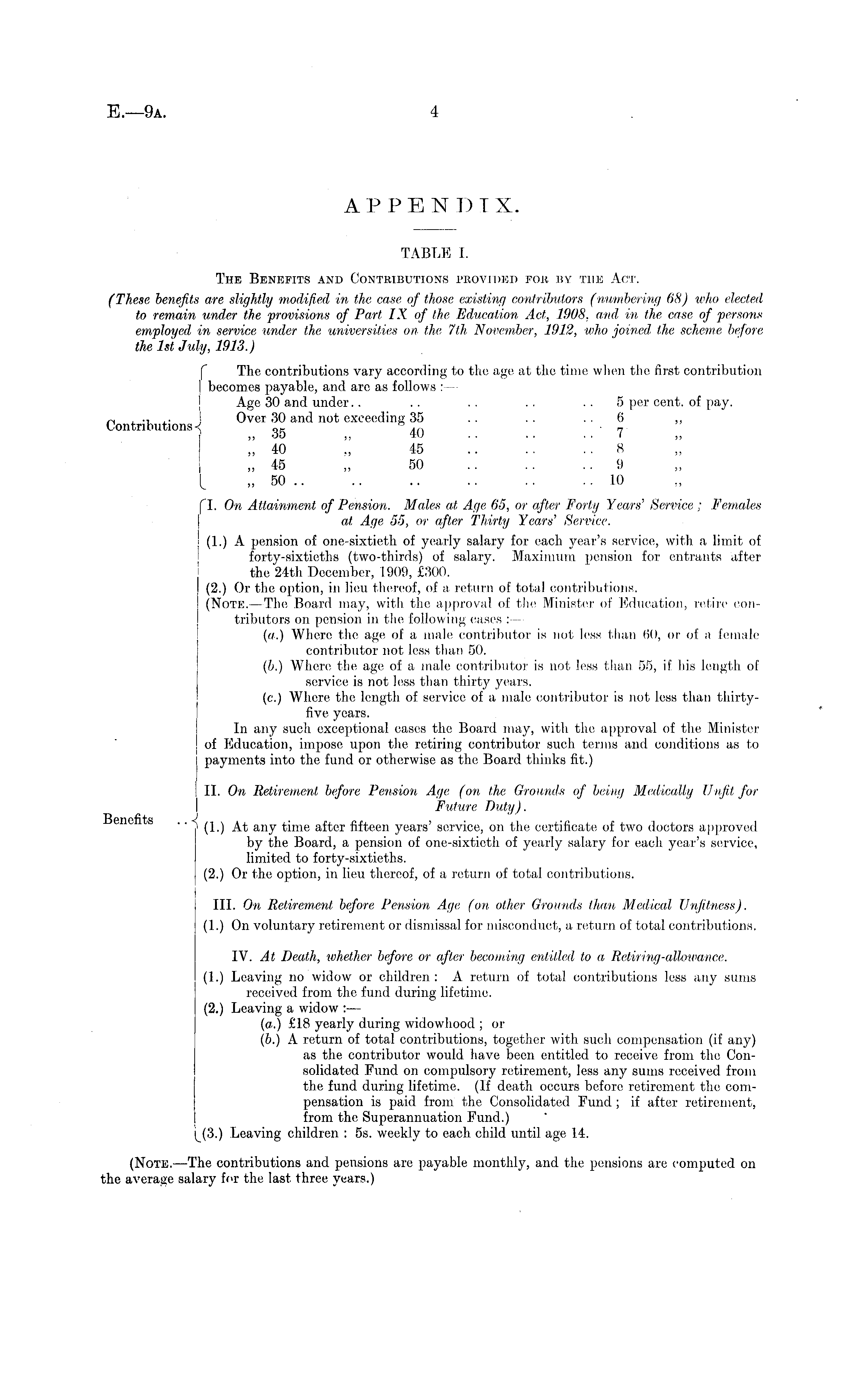 APPEN D T X. TABLE I. The Benefits and Contributions provided for by the Act. (These benefits are slightly 'modified in the case of those existing contributors (numbering 68) who elected to remain under the provisions of Part IX of the Education Act, 1908, and in the case of 'persons employed in service under the universities on the 7th November, 1912, who joined, the scheme before the Ist July, 1913.) f The contributions vary according to the age at the time when the first contribution I becomes payable, and are as follows : — Age 30 and under.. . . . . . . . . 5 per cent, of pay. „ . -, .. ! Over 30 and not exceeding 35 . . . . .. 6 ~ „- c . „ ■„ | "40 "„ 45 .. .. . . 8 i ~ 45 ~ oO . . . . . . p ~ [_ „ 50 .. .. .. .. .. ..10 fl. On Attainment of Pension. Males at Age 65, or after Forty Years' Service : Females at. Age 55, or after Thirty Years' Service. ( (1.) A pension of one-sixtieth of yearly salary for each year's service, with a limit of forty-sixtieths (two-thirds) of salary. Maximum pension for entrants after the 24th December, 1909, £300. (2.) Or the option, in lieu thereof, of a return of total contributions. (Note. — The Board may, with the approval of the Minister of Education, retire contributors on pension in the following cases : — (a.) Where the age of a male contributor is not less than 60, or of a female contributor not less than 50. (&.) Where the age of a male contributor is not less than 55, if his length of service is not less than thirty years, (c.) Where the length of service of a male contributor is not less than thirtyfive years. In any such exceptional cases the Board may, with the approval of the Minister of Education, impose upon the retiring contributor such terms and conditions as to payments into the fund or otherwise as the Board thinks fit.) 11. On Retirement before Pension Age (on the Grounds of being Medically Unfit for Future Duty). Ti r\A- . J ' ' (1.) At any time after fifteen years' service, on the certificate of two doctors approved by the Board, a pension of one-sixtieth of yearly salary for each year's service, limited to forty-sixtieths. (2.) Or the option, in lieu thereof, of a return of total contributions. 111. On Retirement before Pension Age (on other Grounds than Medical Unfitness). (1.) On voluntary retirement or dismissal for misconduct, a return of total contributions. IV. At Death, whether before or after becoming entitled to a Retiring-allowance. (1.) Leaving no widow or children : A return of total contributions less any sums received from the fund during lifetime. (2.) Leaving a widow : — (a.) £18 yearly during widowhood ; or (6.) A return of total contributions, together with such compensation (if any) as the contributor would have been entitled to receive from the Consolidated Fund on compulsory retirement, less any sums received from the fund during lifetime. (If death occurs before retirement the compensation is paid from the Consolidated Fund ; if after retirement, from the Superannuation Fund.) I (3.) Leaving children : ss. weekly to each child until age 14. (Note. —The contributions and pensions are payable monthly, and the pensions are computed on the average salary for the last three years.)