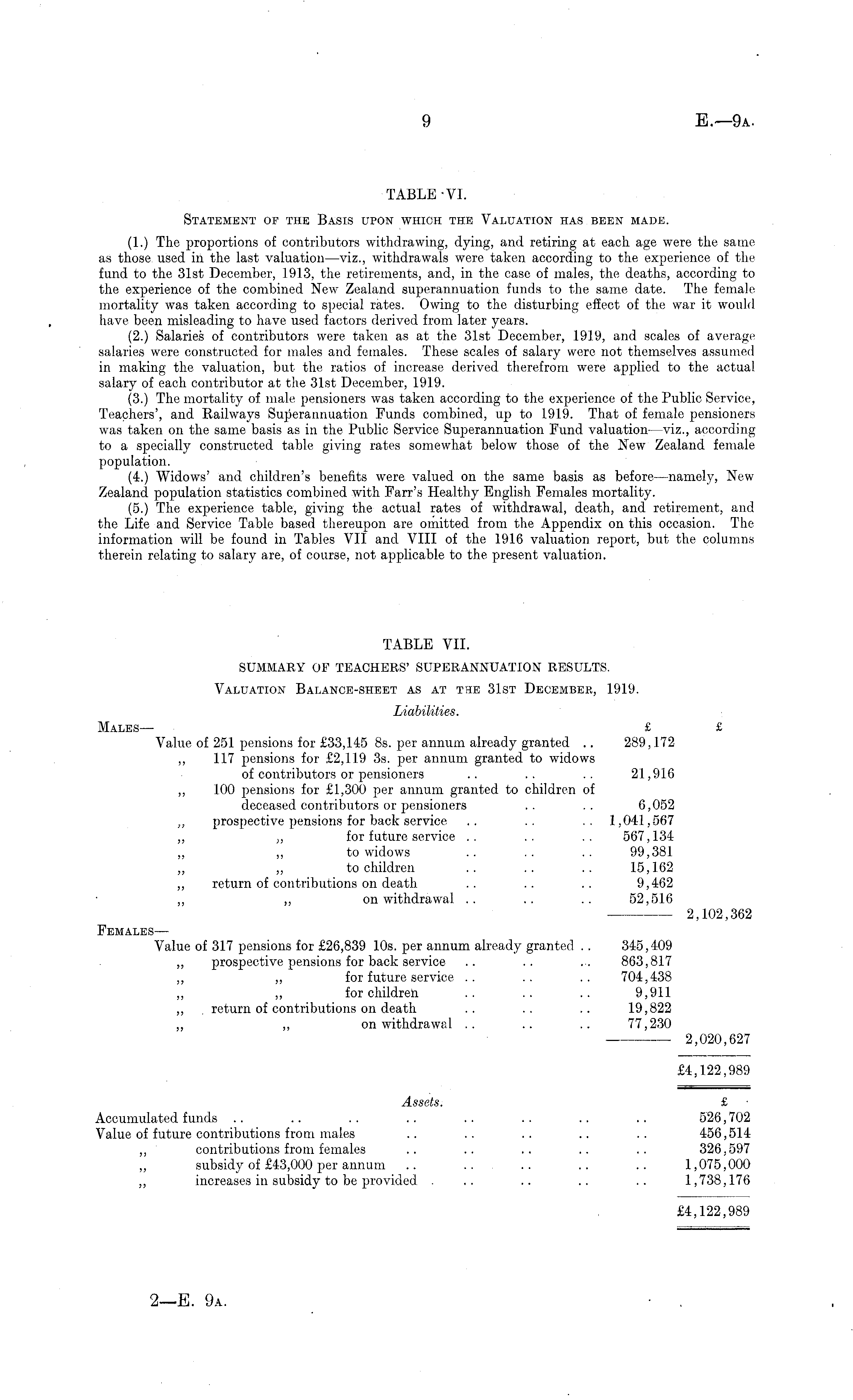 TABLE VT. Statement of the Basis upon which the Valuation has been made. (1.) The proportions of contributors withdrawing, dying, and retiring at each age were the same as those used in the last valuation —viz., withdrawals were taken according to the experience of the fund to the 31st December, 1913, the retirements, and, in the case of males, the deaths, according to the experience of the combined New Zealand superannuation funds to the same date. The female mortality was taken according to special rates. Owing to the disturbing effect of the war it would have been misleading to have used factors derived from later years. (2.) Salaries of contributors were taken as at the 31st December, 1919, and scales of average salaries were constructed for males and females. These scales of salary were not themselves assumed in making the valuation, but the ratios of increase derived therefrom were applied to the actual salary of each contributor at the 31st December, 1919. (3.) The mortality of male pensioners was taken according to the experience of the Public Service, Teachers', and Railways Superannuation Funds combined, up to 1919. That of female pensioners was taken on the same basis as in the Public Service Superannuation Fund valuation —viz., according to a specially constructed table giving rates somewhat below those of the New Zealand female population. (4.) Widows' and children's benefits were valued on the same basis as before—namely, New Zealand population statistics combined with Farr's Healthy English Females mortality. (5.) The experience table, giving the actual rates of withdrawal, death, and retirement, and the Life and Service Table based thereupon are omitted from the Appendix on this occasion. The information will be found in Tables VII and VIII of the 1916 valuation report, but the columns therein relating to salary are, of course, not applicable to the present valuation. TABLE VII. SUMMARY OF TEACHERS' SUPERANNUATION RESULTS. Valuation Balance-sheet as at the 31st December, 1919. Liabilities. Males— £ £ Value of 251 pensions for £33,145 Bs. per annum already granted .. 289,172 ~ 117 pensions for £2,119 3s. per annum granted to widows of contributors or pensioners .. .. .. 21,916 ~ 100 pensions for £1,300 per annum granted to children of deceased contributors or pensioners .. .. 6,052 ~ prospective pensions for back service .. .. .. 1,041,567 ~ „ for future service .. .. .. 567,134 ~ ~ to widows .. .. .. 99,381 ~ ~ to children .. .. .. 15,162 ~ return of contributions on death .. .. .. 9,462 ~ ~ on withdrawal .. .. .. 52,516 2,102,362 Females— Value of 317 pensions for £26,839 10s. per annum already granted . . 345,409 ~ prospective pensions for back service .. .. ... 863,817 ~ ~ for future service .. .. .. 704,438 ~ ~ for children .. .. .. 9,911 ~ . return of contributions on death .. .. .. 19,822 ~ ~ on withdrawal .. .. .. 77,230 2,020,627 £4,122,989 Assets. £ Accumulated funds .. .. . . .. .. .. .. .. 526,702 Value of future contributions from males .. .. .. .. ... 456,514 ~ contributions from females .. .. .. .. .. 326,597 ~ subsidy of £43,000 per annum .. .. .. 1,075,000 ~ increases in subsidy to be provided .. .. .. .. 1,738,176 £4,122,989