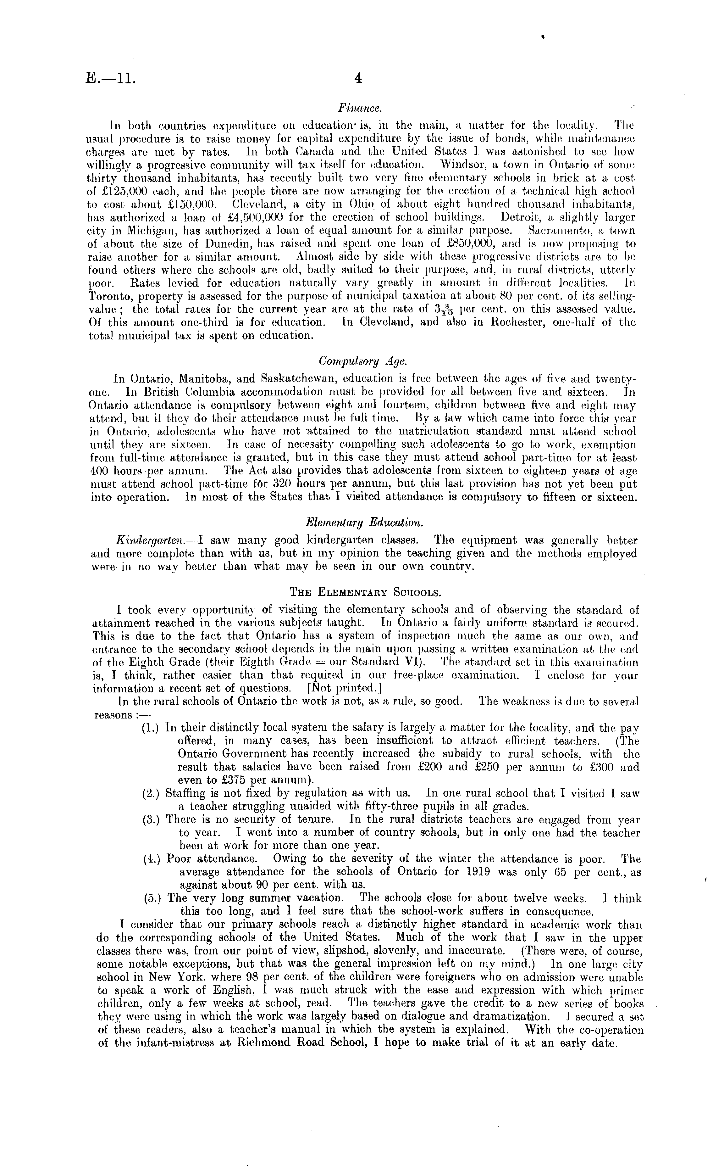 Finance. in both countries expenditure on education , is, in the main, a matter for the locality. The usual procedure is to raise money for capital expenditure by the issue of bonds, while maintenance charges are met by rates. In both Canada and the United States 1 was astonished to sec how willingly a progressive community will tax itself for education. Windsor, a. town in Ontario of some thirty thousand inhabitants, has recently built two very fine elementary schools in brick at a coat of £125,000 each, and the people there are now arranging for the erection of a technical high school to cost about £150,000. Cleveland, a city in Ohio of about eight hundred thousand inhabitants, has authorized a loan of £4,500,000 for the erection of school buildings. Detroit, a slightly larger city in Michigan, has authorized a loan of equal amount for a similar purpose. Sacramento, a town of about the size of Dunedin, lias raised and spent one loan of £850,000, and is now proposing to raise another for a similar amount. Almost side by side with these progressive districts are to be found others where the schools an; old, badly suited to their purpose, and, in rural districts, utterlypoor. Rates levied for education naturally vary greatly in amount in different localities. In Toronto, property is assessed for the purpose of municipal taxation at about 80 per cent, of its sellingvalue ; the total rates for the current year are at the rate of per cent, on this assessed value. Of this amount one-third is for education. In Cleveland, and also in Rochester, one-half of the total municipal tax is spent on education. Compulsory Age. In Ontario, Manitoba, and Saskatchewan, education is free between the ages of five and twentyone. In British Columbia accommodation must bo provided for all between five and sixteen. In Ontario attendance is compulsory between (right and fourteen, children between five and eight may attend, but if they do their attendance must Be full time. By a law which came into force this year in Ontario, adolescents who have not 'attained to the matriculation standard must attend school until they are sixteen. In case of necessity compelling such adolescents to go to work, exemption from full-time attendance is granted, but in this case they must attend school part-time for at least 400 hours per annum. The Act also provides that adoloscents from sixteen to eighteen years of age must attend school part-time f6r 320 hours per annum, but this last provision has not yet been put into operation. In most of the States that I visited attendance is compulsory to fifteen or sixteen. Elementary Education. Kindergarten.— ! saw many good kindergarten classes. The equipment was generally better and more complete than with us, but in my opinion the teaching given and the methods employed were in no way better than what may be seen in our own country. The Elementary Schools. 1 took every opportunity of visiting the elementary schools and of observing the standard of attainment reached in the various subjects taught. In Ontario a fairly uniform standard is secured. This is due to the fact that Ontario has a system of inspection much the same as our own, and entrance to the secondary school depends in the main upon passing a written examination at the end of the Eighth Grade (their Eighth Grade — our Standard VI). The standard set in this examination is, 1 think, rather easier than that required in our free-place examination. I enclose for your information a recent set of questions. [Not printed.] In the rural schools of Ontario the work is not, as a rule, so good. The weakness is due to several reasons : — (1.) In their distinctly local system the salary is largely a matter for the locality, and the pay offered, in many cases, has been insufficient to attract efficient teachers. (The Ontario Government has recently increased the subsidy to rural schools, with the result that salaries have been raised from £200 and £250 per annum to £300 and even to £375 per annum). (2.) Staffing is not fixed by regulation as with us. In one rural school that I visited 1 saw a teacher struggling unaided with fifty-three pupils in all grades. (3.) There is no security of tenure. In the rural districts teachers are engaged from year to year. I went into a number of country schools, but in only one had the teacher been at work for more than one year. (4.) Poor attendance. Owing to the severity of the winter the attendance is poor. The average attendance for the schools of Ontario for 1919 was only 65 per cent., as against about 90 per cent, with us. (5.) The very long summer vacation. The schools close for about twelve weeks. J think this too long, and I feel sure that the school-work suffers in consequence. I consider that our primary schools reach a distinctly higher standard in academic work than do the corresponding schools of the United States. Much of the work that 1 saw in the upper classes there was, from our point of view, slipshod, slovenly, and inaccurate. (There were, of course, some notable exceptions, but that was the general impression left on my mind.) In one large city school in New York, where 98 per cent, of the children were foreigners who on admission were unable to speak a work of English, I was much struck with the ease and expression with which primer children, only a few weeks at school, read. The teachers gave the credit to a new series of books they were using in which the work was largely based on dialogue and dramatization. I secured a set of these readers, also a teacher's manual in which the system is explained. With the co-operation of the infant-mistress at Richmond Road School, I hope to make trial of it at an early date.