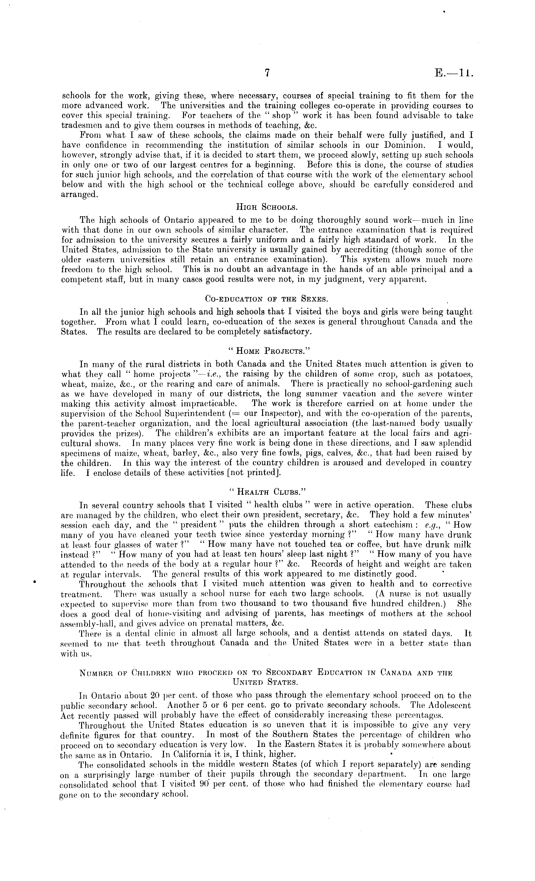 schools for the work, giving these, where necessary, courses of special training to fit them for the more advanced work. The universities and the training colleges co-operate in providing courses to cover this special training. For teachers of the " shop " work it has been found advisable to take tradesmen and to give them, courses in methods of teaching, &c. From what I saw of these schools, the claims made on their behalf were fully justified, and I have confidence in recommending the institution of similar schools in our Dominion. I would, however, strongly advise that, if it is decided to start them, we proceed slowly, setting up such schools in only one or two of our largest centres for a beginning. Before this is done, the course of studies for such junior high schools, and the correlation of that course with the work of the elementary school below and with the high school or the technical college above, should be carefully considered and arranged. High Schools. The high schools of Ontario appeared to me to be doing thoroughly sound work—much in line with that done in our own schools of similar character. The entrance examination that is required for admission to the university secures a fairly uniform and a fairly high standard of work. In the United States, admission to the State university is usually gained by accrediting (though some of the older eastern universities still retain an entrance examination). This system allows much more freedom to the high school. This is no doubt an advantage in the hands of an able principal and a competent staff, but in many cases good results were not, in my judgment, very apparent. Co-education of the Sexes. In all the junior high schools and high schools that I visited the boys and girls were being taught together. From what I could learn, co-education of the sexes is general throughout Canada and the States. The results are declared to be completely satisfactory. " Home Projects." In many of the rural districts in both Canada and the United States much attention is given to what they call " home projects " — i.e., the raising by the children of some crop, such as potatoes, wheat, maize, &c, or the rearing and care of animals. There is practically no school-gardening such as we have developed in many of our districts, the long summer vacation and the severe winter making this activity almost impracticable. Hie work is therefore carried on at home under the supervision of the School Superintendent (= our Inspector), and with the co-operation of the parents, the parent-teacher organization, and the local agricultural association (the last-named body usually provides the prizes). The children's exhibits are an important feature at the local fairs and agricultural shows. In many places very fine work is being done in these directions, and I saw splendid specimens of maize, wheat, barley, &c, also very fine fowls, pigs, calves, &c., that had been raised by the children. In this way the interest of the country children is aroused and developed in country life. I enclose details of these activities [not printed]. " Health Clubs." In several country schools that I visited " health clubs " were in active operation. These clubs are managed by the children, who elect their own president, secretary, &c. They hold a few minutes' session each day, and the " president " puts the children through a short catechism : e.g., " How many of you have cleaned your teeth twice since yesterday morning V " How many have drunk at least four glasses of water ?" " How many have not touched tea or coffee, but have drunk milk instead ?" " How many of you had at least ten hours' sleep last night ?" " How many of you have attended to the needs of the body at a regular hour ?" &c. Records of height and weight are taken at regular intervals. The general results of this work appeared to me distinctly good. Throughout the schools that I visited much attention was given to health and to corrective treatment. There was usually a school nurse for each two large schools. (A nurse is not usually expected to supervise more than from two thousand to two thousand five hundred children.) She does a good deal of home-visiting and advising of parents, has meetings of mothers at the school assembly-hall, and gives advice on prenatal matters, &c. There is a dental clinic in almost all large schools, and a dentist attends on stated days. It seemed to me that teeth throughout Canada and the. United States were in a better state than with us. Number of Children who proceed on to Secondary Education tn Canada and the United States. Tn Ontario about 20 per cent, of those who pass through the elementary school proceed on to the public secondary school. Another sor (i per cent, go to private, secondary schools. The Adolescent Act recently passed will probably have the effect of considerably increasing these percentages. Throughout the United States education is so uneven that it is impossible to give any very definite figures for that country. In most of the Southern States the percentage of children who proceed on to secondary education is very low. In the Eastern States it is probably somewhere about the same as in Ontario. In California it is, I think, higher. The consolidated schools in the middle western States (of which I report separately) are sending on a surprisingly large number of their pupils through the secondary department. Tn one large consolidated school that I visited 90 per cent, of those who had finished the elementary course had gone on to the secondary school.