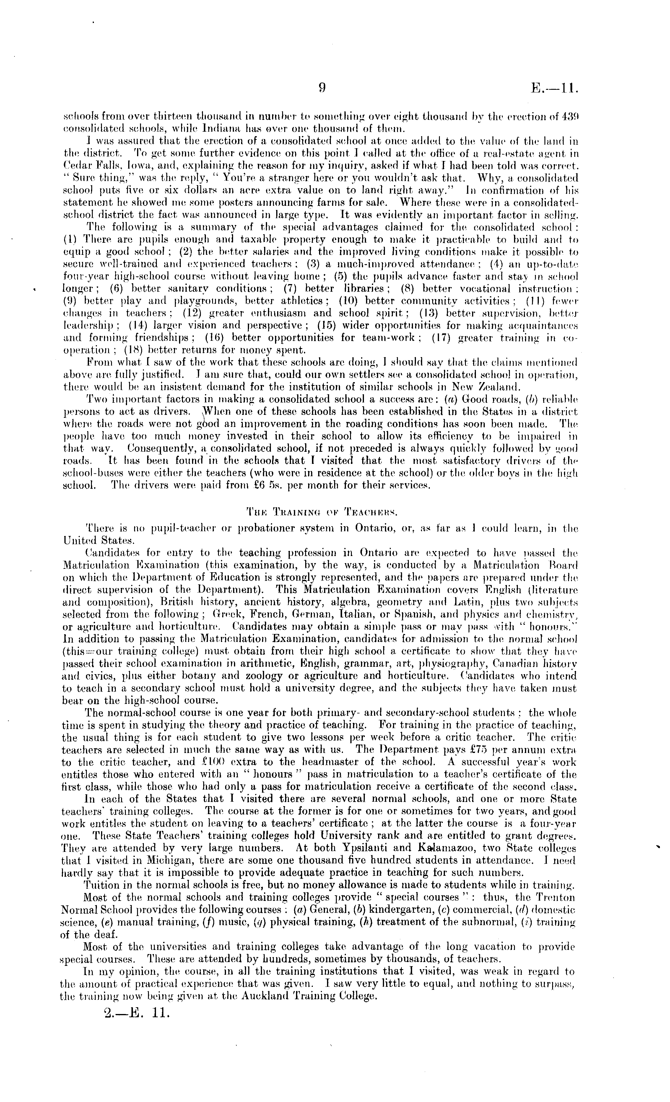 schools from over thirteen thousand in number to something over eight thousand by the erection of 439 consolidated schools, while Indiana lias over one thousand of them. .1 was assured that the erection of a consolidated school at once added to the value of the land in the district. To get some further evidence on this point I called at the office of v real-estate agent in Cedar Falls, lowa, and, explaining the reason for my inquiry, asked if what 1 had been told was correct. " Sure tiling," was the reply, " You're a stranger here or yon wouldn't ask that. Why, a consolidated school puts five or six dollars an acre extra value on to land right away." In confirmation of his statement he showed me some posters announcing farms for sale. Where these were in a consolidated school district the fact was announced in large type. It was evidently an important factor in selling. The following is a summary of the special advantages claimed for the consolidated school : (I) There are pupils enough and taxable property enough to make it practicable to build and to equip a good school ; (2) the better salaries and the improved living conditions make it possible to secure well-trained and experienced teachers ; (3) a much-improved attendance ; (4) an up-to-date four-year high-school course without leaving home ; (5) the pupils advance faster and stay in school longer; (6) better sanitary conditions : (7) better libraries ; (8) better vocational instruction : (9) better play and playgrounds, better athletics; (10) better community activities; (II) fewer changes in teachers; (12) greater enthusiasm and school spirit; (13) better supervision, better leadership; (14) larger vision and perspective; (15) wider opportunities for making acquaintances and forming friendships; (16) better opportunities for team-work; (17) greater training in cooperation ; (18) better returns for money spent. From what I saw of the work that these schools are doing, I should say that the claims mentioned above are fully justified. lam sure that, could our own settlers see a consolidated school in operation, there would be an insistent demand for the institution of similar schools in New Zealand. Two important factors in making a consolidated school a success are; (a) Good roads, (/;) reliable persons to act as drivers. When one of these schools has been established in the States in a district where the roads were not good an improvement in the roading conditions has soon been made. The people have too much money invested in their school to allow its efficiency to be impaired in that way. Consequently, a consolidated school, if not preceded is always quickly followed by good roads. It has been found in the schools that 1 visited that the most satisfactory drivers of the school-buses were either the teachers (who were in residence at the school) or the older boys in the high school. The drivers were paid from £6 . r )s. per month for their services. The Training ok Teachers, There is no pupil-teacher or probationer system in Ontario, or, as far as I could learn, in the. United States. Candidates for entry to the teaching profession in Ontario are expected to have passed the Matriculation Examination (this examination, by the way, is conducted by a. Matriculation Hoard on which the Department of Education is strongly represented, and the papers are prepared under the direct supervision of the Department). This Matriculation Examination covers English (literature and composition), British history, ancient history, algebra, geometry and Latin, plus two subjects selected from the following ; Greek, French, German, Italian, or Spanish, and physics and chemistry, or agriculture and horticulture. Candidates may obtain a simple pass or may puss vith " honours. , ' In addition to passing the Matriculation Examination, candidates for admission to the normal school (t,his=our training college) must obtain from their high school a certificate to show that they have passed their school examination in arithmetic, Knglish, grammar, art, physiography, Canadian history and civics, plus either botany and zoology or agriculture and horticulture. Candidates who intend to teach in a secondary school must hold a university degree, and the subjects they have taken must bear on the high-school course. The normal-school course is one year for both primary- and secondary-school students : the whole time is spent in studying the theory and practice of teaching. For training in the practice of teaching, the usual thing is for each student to give two lessons per week before a critic teacher. The critic teachers are selected in much the same way as with us. The Department pays £75 per annum extra to the critic teacher, and £100 extra to the headmaster of the school. A successful year's work entitles those who entered with an " honours " pass in matriculation to a teacher's certificate of the first class, while those who had only a pass for matriculation receive a certificate of the second class. In each of the States that I visited there are several normal schools, and one or more State teachers' training colleges. The course at the former is for one or sometimes for two years, and good work entitles the student on leaving to a teachers' certificate ; at the latter the course is a four-year one. These State Teachers' training colleges hold University rank and are entitled to grant degrees. They are attended by very large numbers. At both Ypsilanti and Kalamazoo, two State colleges that J visited in Michigan, there are some one thousand five hundred students in attendance. 1 need hardly say that it is impossible to provide adequate practice in teaching for such numbers. Tuition in the normal schools is free, but no money allowance is made to students while in training. Most of the normal schools and training colleges provide " special courses " : thus, the Trenton Normal School provides the following courses : (a) General, (l>) kindergarten, (c) commercial,