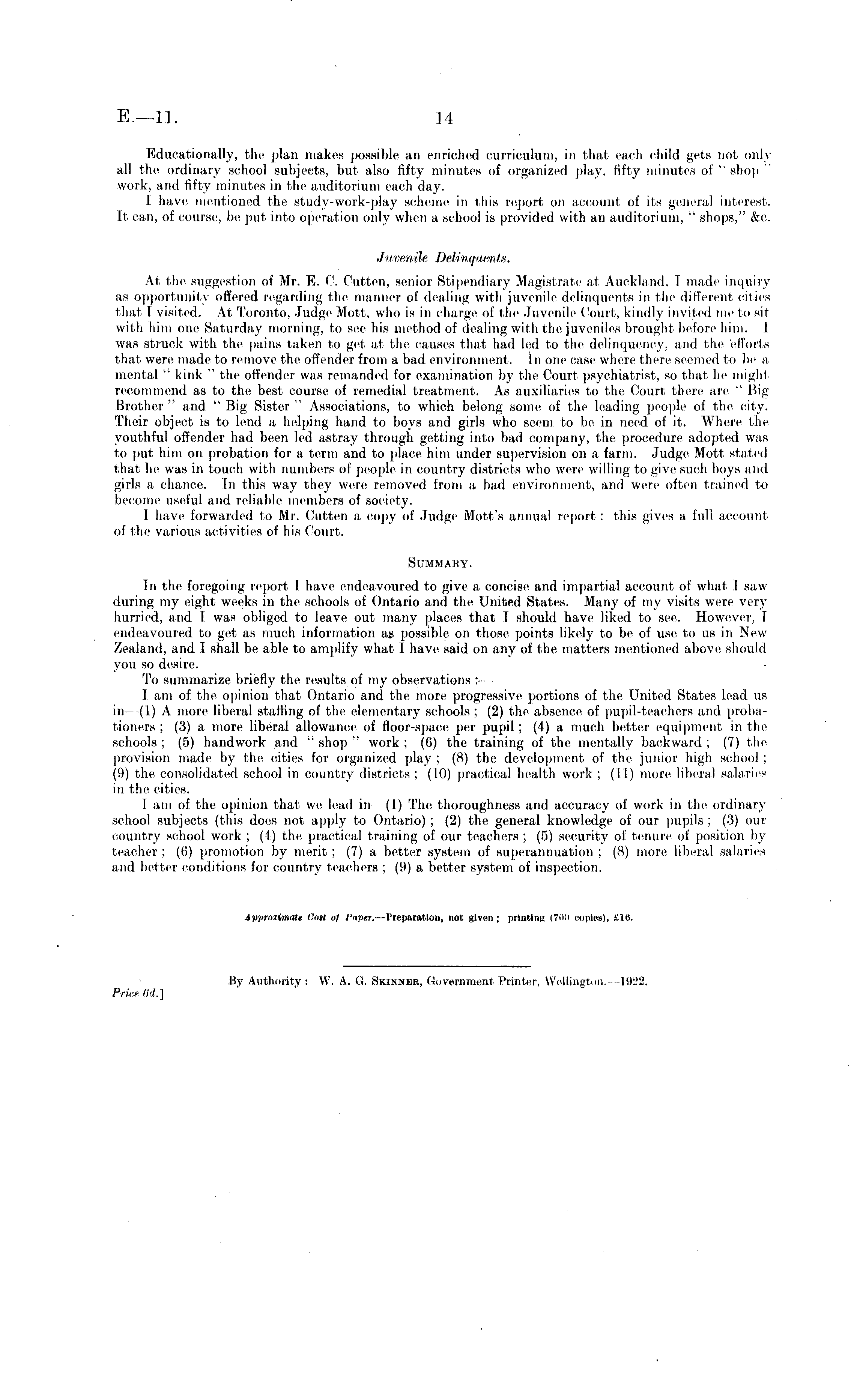 Educationally, the plan makes possible an enriched curriculum, in that each child gets not only all the ordinary school subjects, but also fifty minutes of organized play, fifty minutes of " shop work, and fifty minutes in the auditorium each day. 1 have mentioned the study-work-play scheme in this report on account of its general interest. It can, of course, be put into operation only when a school is provided with an auditorium, " shops," &c. Juvenile Delinquents, At the suggestion of Mr. E. C. Cutten, senior Stipendiary Magistrate at Auckland. T made inquiry as opportunity offered regarding the manner of dealing with juvenile delinquents in the different cities that I visited. At Toronto, Judge Mott, who is in charge of the Juvenile Court, kindly invited me to sit with him one Saturday morning, to see his method of dealing with the juveniles brought before him. 1 was struck with the pains taken to get at the causes that had led to the delinquency, and the efforts that were made to remove the offender from a bad environment. In one ease where there seemed to be a mental " kink " the offender was remanded for examination by the Court psychiatrist, so that he might recommend as to the best course of remedial treatment. As auxiliaries to the Court there are " 15ig Brother " and " Big Sister " Associations, to which belong some of the leading people of the city. Their object is to lend a helping hand to boys and girls who seem to be in need of it. Where the youthful offender had been led astray through getting into bad company, the procedure adopted was to put him on probation for a term and to place him under supervision on a farm. Judge Mott stated that he was in touch with numbers of people in country districts who were willing to give such boys and girls a chance. In this way they were removed from a bad environment, and were often trained to become useful and reliable members of society. I have forwarded to Mr. Cutten a copy of Judge Mott's annual report : this gives a full account of the various activities of his Court. Summary. In the foregoing report I have endeavoured to give a concise and impartial account of what I saw during my eight weeks in the schools of Ontario and the United States. Many of my visits were very hurried, and I was obliged to leave out many places that T should have liked to see. However, I endeavoured to get as much information as possible on those points likely to be of use to us in New Zealand, and I shall be able to amplify what I have said on any of the matters mentioned above should you so desire. To summarize briefly the results of my observations :—-• \ am of the opinion that Ontario and the more progressive portions of the United States lead us in- (I) A more liberal staffing of the elementary schools ; (2) the absence of pupil-teachers and probationers ; (3) a more liberal allowance of floor-space per pupil ; (4) a much better equipment in the schools ; (5) handwork and " shop " work ; (6) the training of the mentally backward ; (7) the provision made by the cities for organized play ; (8) the development of the junior high school; (9) the consolidated school in country districts ; (10) practical health work ; (11) more liberal salaries in the cities. Tarn of the opinion that we lead in (I) The thoroughness and accuracy of work in the ordinary school subjects (this does not apply to Ontario) ; (2) the general knowledge of our pupils ; (3) our country school work ; (4) the practical training of our teachers ; (5) security of tenure of position by teacher ; (6) promotion by merit ; (7) a better system of superannuation ; (8) more liberal salaries and better conditions for country teachers ; (9) a better system of inspection.