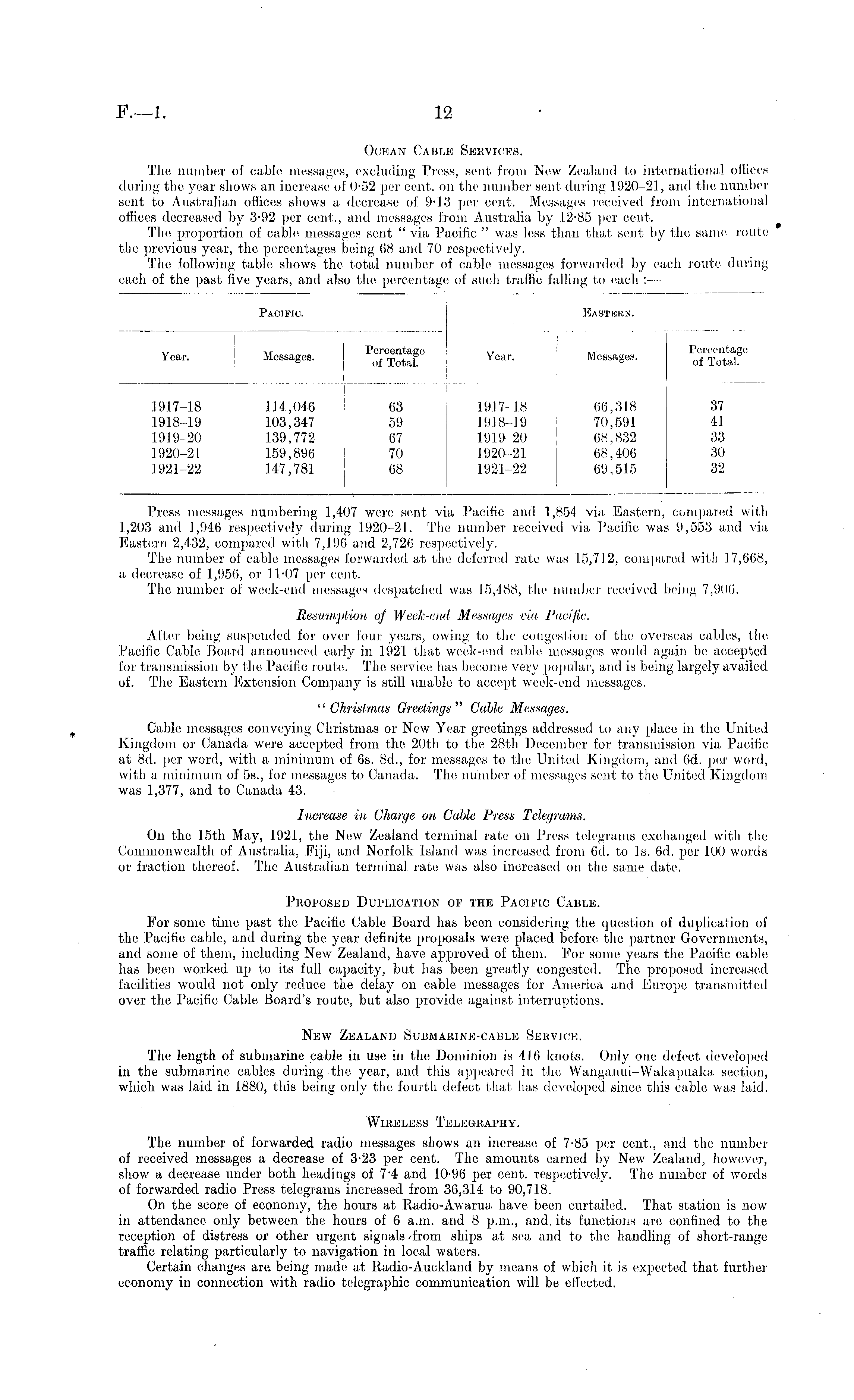 Press messages numbering 1,407 were sent via Pacific and 1,851 via Kastern, compared with 1,203 and 1,946 respectively during 1920-21. The number received via, Pacific was 9,553 and via Eastern 2,432, compared with 7,196 and 2,726 respectively. The number of cable, messages forwarded at the deferred rate was 15,712, compared with 17,668, a decrease of 1,956, or 11-07 per cent. The number of week-end messages despatched was 15,488, Hie number received being 7,906. Resumption of Week-end, Messages via Pacific. Alter being suspended for over four years, owing to the congestion of the overseas cables, flic Pacific Cable Board announced early in 1921 that week-end cable messages would again be accepted for transmission by the Pacific route. The service has become very popular, and is being largely availed of. The Eastern Extension Company is still unable to accept week-end messages. "Christmas Greetings" Cable Messages. Cable messages conveying Christmas or New Year greetings addressed lo any place in the United Kingdom or Canada were accepted from the 20th to the 28th December I'm' transmission via Pacific at Bd. pei- word, with a minimum of 6s. Bd., for messages to the United Kingdom, and 6d. per word, with a minimum of 55., for messages to Canada. The number of messages sent to the United Kingdom was 1,377, and to Canada 43. Increase in- Charge, on Cable Press Telegrams. On the 15th May, 1921, the New Zealand terminal rate on Press telegrams exchanged with the Commonwealth of Australia, Fiji, and Norfolk Island was increased from (id. to Is. 6d. per 100 words or fraction thereof. The Australian terminal rate was also increased on the same date. Proposed Duplication of the Pacific Cable. For some time past the Pacific Cable Board has been considering (he question of duplication of the Pacific cable, and during the year definite proposals were placed before the partner Governments, and some of them, including New Zealand, have approved of them. For some years the Pacific cable, has been worked up to its full capacity, but has been greatly congested. The proposed increased facilities would not only reduce the delay on cable messages for America and Europe transmitted over the Pacific Cable Board's route, but also provide against interruptions. New Zealand Submarine-cable Service. The length of submarine cable in use in the Dominion is 416 knots. Only one defect developed in the submarine cables during the year, and this appeared in the Wanganui-Wakapuaka section, which was laid in 1880, this being only the fourth defect that has developed since this cable was laid. Wireless Telegraphy. The number of forwarded radio messages shows an increase of 7-85 per cent., and the number of received messages a decrease of 3-23 per cent. The amounts earned by New Zealand, however, show a decrease under both headings of 74 and 10-96 per cent, respectively. The number of words of forwarded radio Press telegrams increased from 36,314 to 90,718. On the score of economy, the hours at Radio-Awarua, have been curtailed. That station is now in attendance only between the hours of 6 a.m. and 8 p.m., and. its functions are confined to the reception of distress or other urgent signals 'from ships at sea and to the handling of short-range traffic relating particularly to navigation in local waters. Certain changes are being made at Radio-Auckland by means of which it is expected that further economy in connection with radio telegraphic communication will be effected.