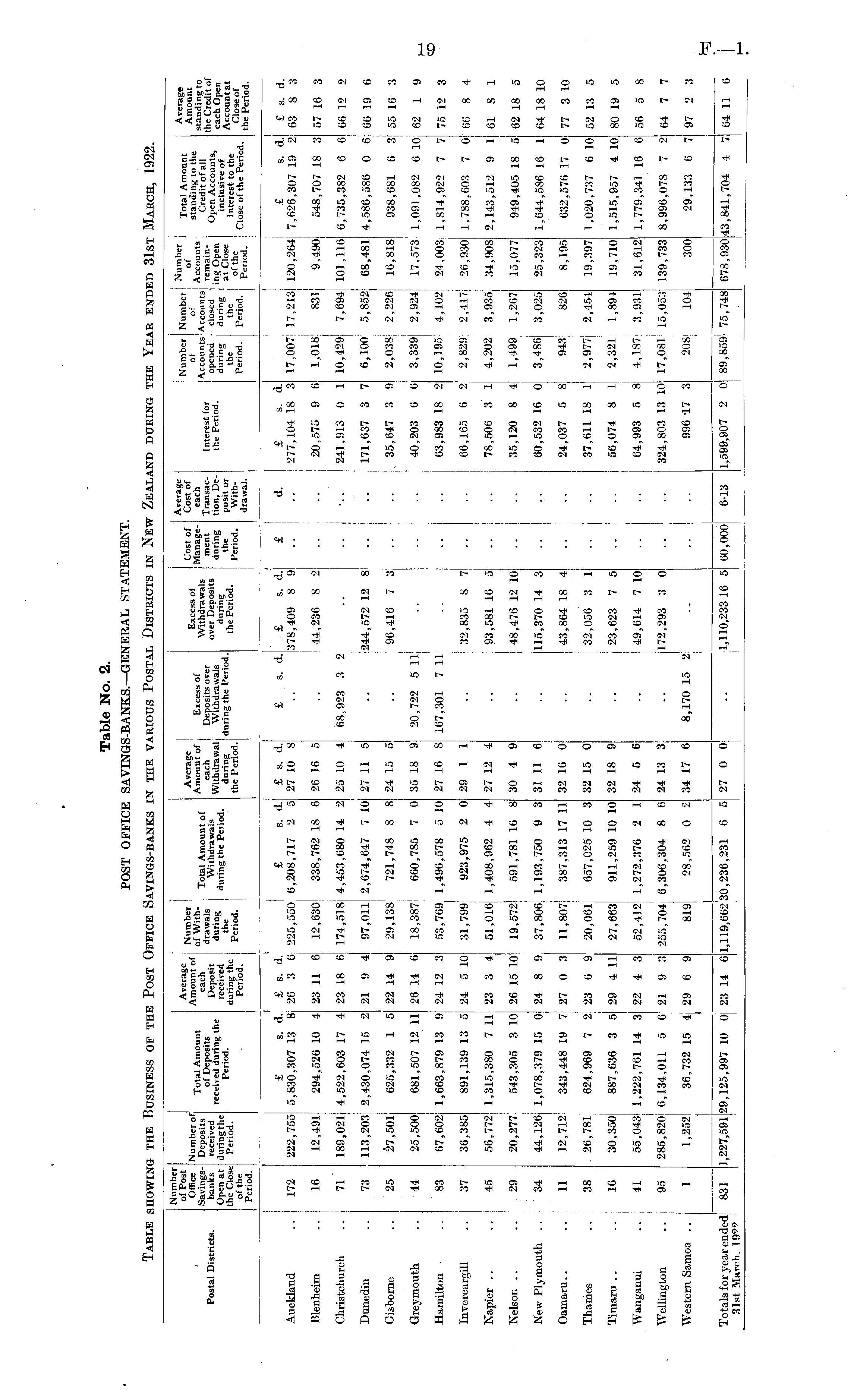 Table No. 2. POST OFFICE SAVINGS-BANKS.— GENERAL STATEMENT. Table showing the Business of the Post Office Savings-banks in the various Postal Districts in New Zealand during the Year ended 31st March, 1922.