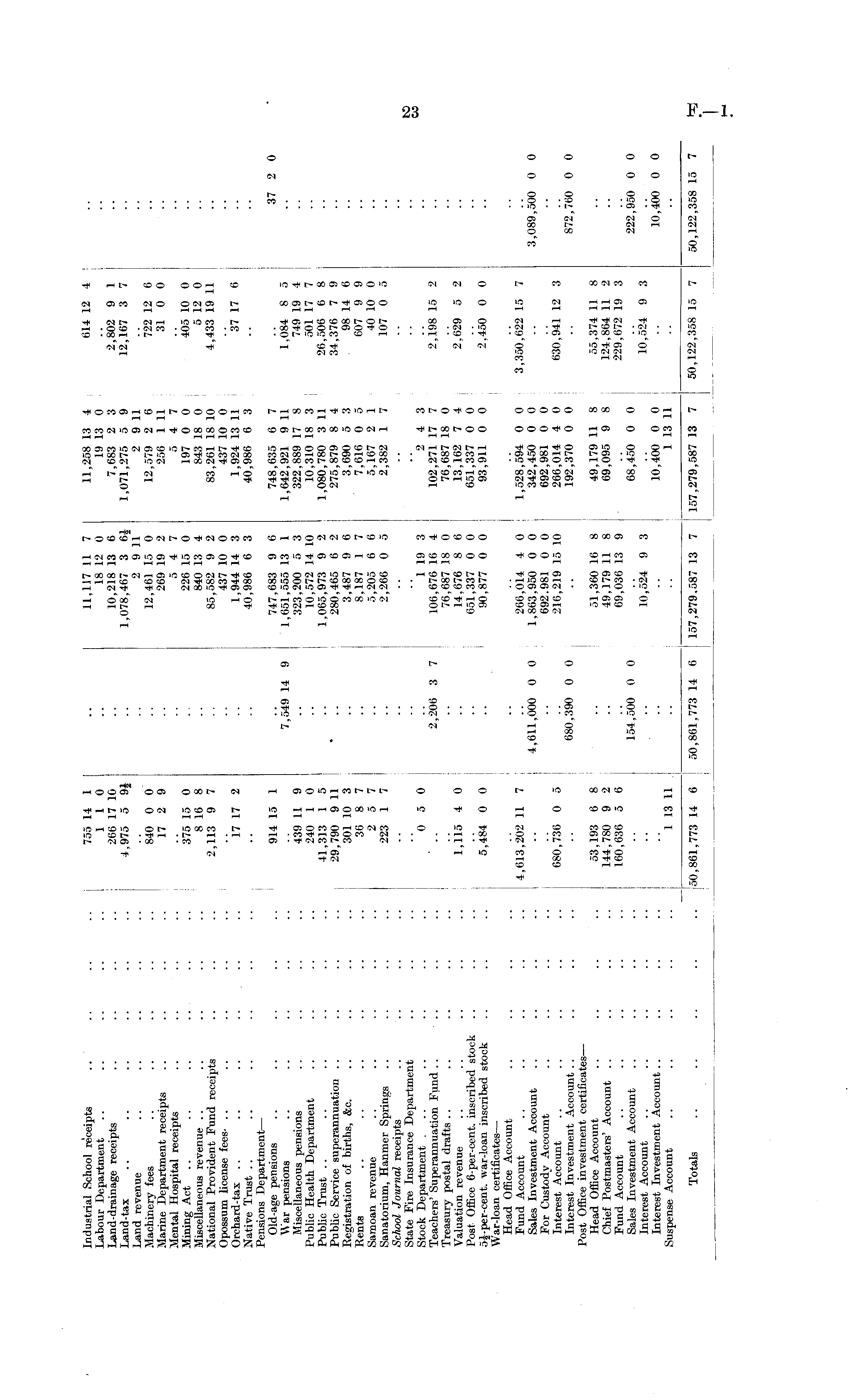 Industrial School receipts .» Labour Department Land-drainage receipts Land-tax Land revenue Machinery fees Marine Department receipts Mental Hospital receipts Mining Act Miscellaneous revenue National Provident Fund receipts Opossum license fees-Orchard-tax Native Trust Pensions Department — Old-age pensions War pensions Miscellaneous pensions Public Health Department Public Trust Public Service superannuation .. Registration of births, &c. Rents Samoan revenue Sanatorium, Hanmer Springs School Journal receipts State Fire Insurance Department Stock Department Teachers' Superannuation Fund .. Treasury postal drafts Valuation revenue Post Office 6-per-cent. inscribed stock 5J-per-cent. war-loan inscribed stock War-loan certificates — Head Office Account Fund Account Sales Investment Account For Custody Account Interest Account Interest Investment Account .. Post Office investment certificates — Head Office Account Chief Postmasters' Account .. Fund Account Sales Investment Account Interest Account Interest Investment Account.. Suspense Account 755 14 1 1 1 0 266 17 10 4,975 5 9$ 840 0 0 17 2 9 375 15 0 8 16 8 2,113 9 7 17 17 2 914 15 1 439 11 9 240 1 0 41,313 1 5 29,790 9 11 301 10 3 36 8 7 2 5 7 223 1 7 0 5 0 1,115 4 0 5,484 0 0 4,613,202 11 7 680,736 0 5 53,193 6 8 144,780 9 2 160,636 5 6 1 13 11 7,549 14 9 2,206 3 7 4,611,000 0 0 680,390 0 0 154,500 0 0 11,117 11 7 18 12 0 10,218 13 6 1,078,467 3 6i 2 9 11 12,461 15 0 269 19 2 5 4 7 226 15 0 840 13 4 85,582 9 2 437 10 0 1,944 14 3 40,986 6 3 747,683 9 6 1,651,555 13 1 323,200 5 3 10,572 14 10 1,065,973 9 2 280,465 6 2 3,487 9 6 8,187 1 7 5,205 6 6 2,266 0 5 1 19 3 106,676 16 4 76,687 18 0 14,676 8 6 651,337 0 0 90,877 0 0 266,014 4 0 1,863,950 0 0 692.981 0 0 216,219 15 10 51,360 16 8 49,179 11 8 69,036 13 9 10,524 9 3 11,258 13 4 19 13 0 7,683 2 3 1,071,275 5 9 2 9 11 12,579 2 6 256 1 11 5 4 7 197 0 0 843 18 0 83,261 18 10 437 10 0 1,924 13 11 40,986 6 3 748,635 6 7 1,642,921 9 11 322,889 17 8 10,310 18 3 1,080,780 3 11 275,879 8 4 3,690 5 3 7,616 0 5 5,167 2 1 2,382 1 7 614 12 4 2,802 9 1 12,167 3 7 722 12 6 31 0 0 405 10 0 5 12 0 4,433 19 11 37 17 6 1,084 8 5 749 19 4 501 17 7 26,506 6 8 34,376 7 9 98 14 6 607 9 9 40 10 0 107 0 5 37 2 0 2 4 3 102,271 17 7 76,687 18 0 13,162 7 4 651,337 0 0 93,911 0 0 2,198 15 2 2,629 5 2 2,450 0 0 1,528,594 0 0 342,450 0 0 692,981 0 0 266,014 4 0 192,370 0 0 3,350,622 15 7 630,941 12 3 3,089,500 0 0 872,760 0 0 49.179 11 8 69,095 9 8 68,450 0 0 10,400 0 0 1 13 11 55,374 11 8 124,864 11 2 229,672 19 3 10,524 9 3 222,950 0 0 10,400 0 0 Totals 50,861,773 14 6 50,861,773 14 6 50,861,773 14 6 50,861,773 14 6 1 157,279.587 13 7 157,279.587 13 7 157,279,587 13 7 50,122,358 15 7 50,122,358 15 7 I