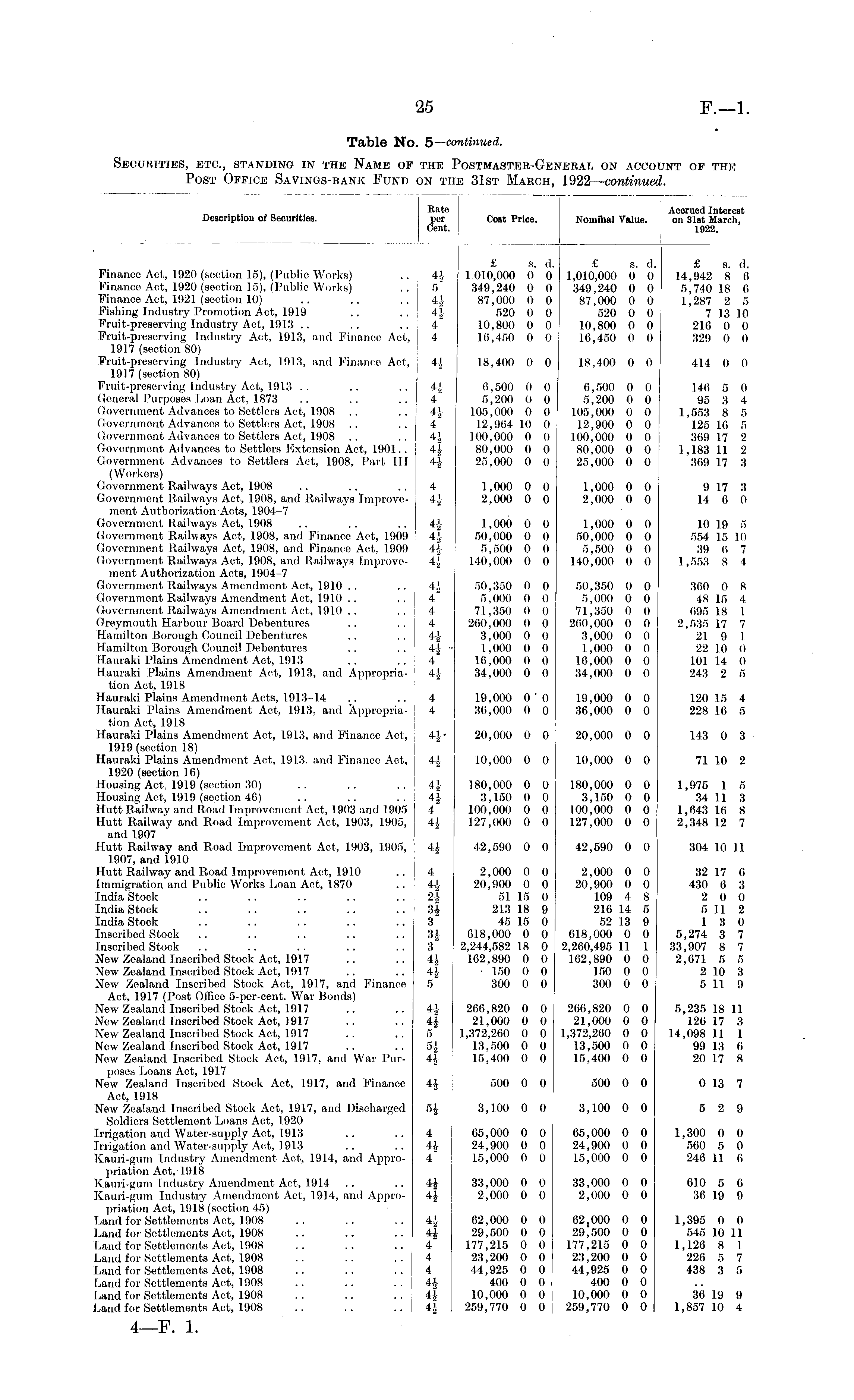 Description of Securities. Bate per Cent. Cost Price. Nominal Value. Accrued Interest on 31st March, 1922. Finance Act, 1920 (section 15), (Public Works) Finance Act, 1920 (section 15), (Public Works) Finance Act, 1921 (section 10) Fishing Industry Promotion Act, 1919 Fruit-preserving Industry Act, 1913 Fruit-preserving industry Act, 1913, and Finance Act, 1917 (section 80) Fruit-preserving Industry Act, 1913, and Finance Act, 1917 (section 80) Fruit-preserving Industry Aet, 1913 General Purposes Loan Act, 1873 Government Advances to Settlers Act, 1908 Government Advances to Settlers Act, 1908 Government Advances to Settlers Act, 1908 Government Advances to Settlers Extension Act, 1901.. Government Advances to Settlers Act, 1908, Part III (Workers) Government Railways Act, 1908 Government Railways Act, 1908, and Railways Improvement Authorization Acts, 1904-7 Government Railways Act, 1908 Government Railways Act, 1908, and Finance Act, 1909 Government Railways Act, 1908, and Finanoe Act, 1909 Government Railways Act, 1908, and Railways Improvement Authorization Acts, 1904-7 Government Railways Amendment Act, 1910 Government Railways Amendment Act, 1910 Government Railways Amendment Act. 1910 .. Greymouth Harbour Board Debentures Hamilton Borough Council Debentures Hamilton Borough Council Debentures Hauraki Plains Amendment Act, 1913 Hauraki Plains Amendment Act, 1913, and Appropriation Act, 1918 Hauraki Plains Amendment Acts, 1913-14 Hauraki Plains Amendment Act, 1913. and Appropriation Act, 1918 Hauraki Plains Amendment Act, 1913, anil Finance Aet, 1919 (section 18) Hauraki Plains Amendment Act, 1913. and Finance Act, 1920 (section 16) Housing Act, 1919 (section 30) Housing Act, 1919 (section 46) Hutt Railway and Road Improvement Act, 1903 and 1905 Hutt Railway and Road Improvement Act, 1903, 1905, and 1907 Hutt Railway and Road Improvement Act, 1903, 1905, 1907, and 1910 Hutt Railway and Road Improvement Aet, 1910 Immigration and Public Works Loan Act, 1870 India Stock India Stock India Stock Inscribed Stock Inscribed Stock New Zealand Inscribed Stock Act, 1917 New Zealand Inscribed Stock Act, 1917 New Zealand Inscribed Stock Act, 1917, and Finance Act, 1917 (Post Office 5-per-cent. War Bonds) New Zealand Inscribed Stock Act, 1917 New Zealand Inscribed Stock Act, 1917 New Zealand Inscribed Stock Act, 1917 New Zealand Inscribed Stock Act, 1917 New Zealand Inscribed Stock Act, 1917, and War Purposes Loans Act, 1917 New Zealand Inscribed Stock Act, 1917, and Finance Act, 1918 Now Zealand Inscribed Stock Act, 1917, and Discharged Soldiers Settlement Loans Act, 1920 irrigation and Water-supply Act, 1913 irrigation and Water-supply Act, 1913 Kauri-gum Industry Amendment Act, 1914, and Appropriation Act, 1918 Kauri-gum Industry Amendment Act, 1914 Kauri-gum Industry Amendment Act, 1914, and Appropriation Act, 1918 (section 45) Land for Settlements Act, 1908 Land for Settlements Act, 1908 Land for Settlements Act, 1908 Land for Settlements Act, 1908 Land for Settlements Aet, 1908 Land for Settlements Act, 1908 Land for Settlements Act, 1908 Land for Settlements Act, 1908 41 5 41 4i 4 4 4! 41 4" 41 4 41 41 41 4 41 41 4.! 4i 41 4.', 4" 4 4 41 4-1 ■ 4 41 4 4 4141 41 41 4 4.5 £ s. d. 1010,000 0 0 349,240 0 0 87,000 0 0 520 0 0 10,800 0 0 16,450 0 0 18,400 0 0 6,500 0 0 5,200 0 0 105,000 0 0 12,964 10 0 100,000 0 0 80,000 0 0 25,000 0 0 1,000 0 0 2,000 0 0 1,000 0 0 50,000 0 0 5,500 0 0 140,000 0 0 50,350 0 0 5,000 0 0 71,350 0 0 260, (MM) 0 0 3,000 0 0 I,000 0 0 16,000 0 0 34,000 0 0 19,000 0 0 36,000 0 0 20,000 0 0 10,000 0 0 180,000 0 0 3,150 0 0 100,000 0 0 127,000 0 0 £ s. d. 1,010,000 0 0 349,240 0 0 87,000 0 0 520 0 0 10,800 0 0 16,450 0 0 18,400 0 0 6,500 0 0 5,200 0 0 105,000 0 0 12,900 0 0 100,000 0 0 80,000 0 0 25,000 0 0 1,000 0 0 2,000 0 0 1,000 0 0 50,000 0 0 5,500 0 0 140,000 0 0 50,350 0 0 5,000 0 0 71,350 0 0 260,000 0 0 3,000 0 0 I,000 0 0 16,000 0 0 34,000 0 0 19,000 0 0 36,000 0 0 20,000 0 0 10,000 0 0 180,000 0 0 3,150 0 0 100,000 0 0 127,000 0 0 £ s. d. 14,942 8 6 5,740 18 6 1,287 2 5 7 13 10 216 0 0 329 0 0 414 0 0 146 5 0 95 3 4 1,553 8 5 125 16 5 369 17 2 1,183 11 2 369 17 3 9 17 3 14 6 0 10 19 5 554 15 10 39 0 7 1,553 8 4 360 0 8 48 15 4 695 18 1 2,535 17 7 21 9 1 22 10 0 101 14 0 243 2 5 120 15 4 228 16 5 143 0 3 71 10 2 1,975 1 5 34 11 3 1,643 16 8 2,348 12 7 4i 42,590 0 0 42,590 0 0 304 10 11 4 41 2J 34 3 8* 3 41 41 5 2,000 0 0 20,900 0 0 51 15 0 213 18 9 45 15 0 618,000 0 0 2,244,582 18 0 162,890 0 0 • 150 0 0 300 0 0 2,000 0 0 20,900 0 0 109 4 8 216 14 5 52 13 9 618,000 0 0 2,260,495 11 1 162,890 0 0 150 0 0 300 0 0 32 17 6 430 6 3 2 0 0 5 11 2 1 3 0 5,274 3 7 33,907 8 7 2,671 5 5 2 10 3 5 11 9 41 41 5 01 41 266,820 0 0 21,000 0 0 1,372,260 0 0 13,500 0 0 15,400 0 0 266,820 0 0 21,000 0 0 1,372,260 0 0 13,500 0 0 15,400 0 0 5,235 18 11 126 17 3 14,098 11 1 99 13 6 20 17 8 41 500 0 0 500 0 0 0 13 7 54 3,100 0 0 3,100 0 0 5 2 9 4 41 4" 65,000 0 0 24,900 0 0 15,000 0 0 65,000 0 0 24,900 0 0 15,000 0 0 1,300 0 0 560 5 0 246 11 6 41 45 33,000 0 0 2,000 0 0 33,000 0 0 2,000 0 0 610 5 6 36 19 9 41 4! 4 4 4 44 44 41 02,000 0 0 29,500 0 0 177,215 0 0 23,200 0 0 44,925 0 0 400 0 0 10,000 0 0 259,770 0 0 62.000 0 0 29,500 0 0 177,215 0 0 23,200 0 0 44,925 0 0 400 0 0 10,000 0 0 259,770 0 0 1,395 0 0 545 10 11 1,126 8 1 226 5 7 438 3 5 36 19 it 1,857 10 4