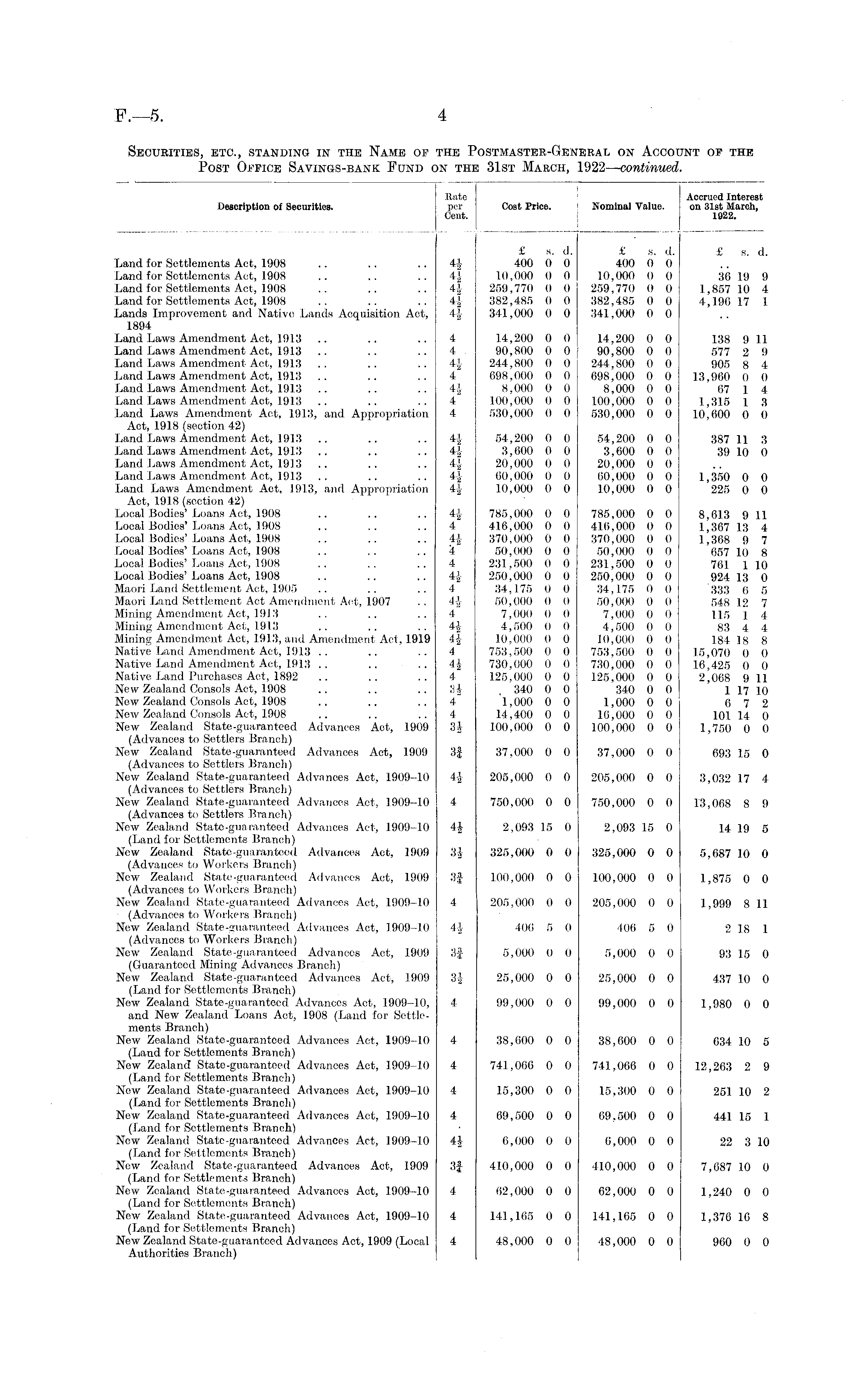Description of Securities. Rate per Cent. Cost Price. Nominal Value. Accrued Interest on 31st March, 1922. Land for Settlements Act, 1908 Land for Settlements Act, 1908 Land for Settlements Act, 1908 Land for Settlements Act, 1908 Lands Improvement and Native Lands Acquisition Act, 1894 Land Laws Amendment Act, 1913 Land Laws Amendment Act, 19.13 Land Laws Amendment Act, 1913 Land Laws Amendment Act, 1913 Land Laws Amendment Act, 1913 Land Laws Amendment Act, 1913 Land Laws Amendment Act, 1913, and Appropriation Act, 1918 (section 42) Land Laws Amendment Act, 1913 Land Laws Amendment Act, 1913 Land Laws Amendment Act, 1913 Land Laws Amendment Act, 1913 Land Laws Amendment Act, 1913, and Appropriation Act, 1918 (section 42) Local Bodies' Loans Act, 1908 Local Bodies' Loans Act, 1908 Local Bodies' Loans Act, 1908 Local Bodies' Loans Act, 1908 Local Bodies' Loans Act, 1908 Local Bodies' Loans Act, 1908 Maori Land Settlement Act, 1905 Maori Land Settlement Act Amendment Act, 1907 Mining Amendment Act, 191.'! Mining Amendment Act, 191.3 Mining Amendment Act, 1913, and Amendment Act, 1919 Native Land Amendment Act, 1913 .. Native Land Amendment Act, 1913 Native Land Purchases Act, 1892 New Zealand Consols Act, 1908 New Zealand Consols Act, 1908 New Zealand Consols Act, 1908 New Zealand State-guaranteed Advances Act, 1909 (Advances to Settlers Branch) New Zealand State-guaranteed Advances Act, 1909 (Advances to Settlers Branch) New Zealand State-guaranteed Advances Act, 1909-10 (Advances to Settlers Branch) New Zealand State-guaranteed Advances Act, 1909-10 (Advances to Settlers Branch) New Zealand State-guaranteed Advances Act, 1909-10 (Land for Settlements Branch) New Zealand State-guaranteed Advances Act, 1909 (Advances to Workers Branch) New Zealand State-guaranteed Advances Act, 1909 (Advances to Workers Branch) New Zealand State-guaranteed Advances Act, 1909-10 (Advances to Workers Branch) New Zealand State-guaranteed Advances Act, 1909-10 (Advances to Workers Branch) New Zealand State-guaranteed Advances Act, 1909 (Guaranteed. Mining Advances Branch) New Zealand State-guaranteed Advances Act, 1909 (Land for Settlements Branch) Now Zealand State-guaranteed Advances Act, 1909-10, and New Zealand Loans Act, 1908 (Land for Settlements Branch) New Zealand State-guaranteed Advances Act, 1909-10 (Land for Settlements Branch) New Zealand State-guaranteed Advances Act, 1909-10 (Land for Settlements Branch) New Zealand State-guaranteed Advances Act, 1909-10 (Land for Settlements Branch) New Zealand State-guaranteed Advances Act, 1909-10 (Land for Settlements Branch) New Zealand State-guaranteed Advances Act, 1909-10 (Land for Settlements Branch) New Zealand State-guaranteed Advances Act, 1909 (Land for Settlements Branch) New Zealand State-guaranteed Advances Act, 1909-10 (Land for Settlements Branch) New Zealand State-guaranteed Advances Act, 1909-10 (Land for Settlements Branch) New Zealand State-guaranteed Advances Act, 1909 (Local Authorities Branch) 44 44 44 44 44 £ s. d. 400 0 0 10,000 0 0 259,770 0 0 382,485 0 0 341,000 0 0 £ s. d. 400 0 0 10,000 0 0 259,770 0 0 382,485 0 0 341,000 0 0 £ s. d. 36 19 9 1,857 10 4 4,196 17 I 4 4 44 4 44 4 4 14,200 0 0 90,800 0 0 244,800 0 0 698,000 0 0 8,000 0 0 100,000 0 0 530,000 0 0 14,200 0 0 90,800 0 0 244,800 0 0 698,000 0 0 8,000 0 0 100,000 0 0 530,000 0 0 138 9 11 577 2 9 905 8 4 13,960 0 0 67 1 4 1,315 1 3 10,600 0 0 44 U H 44 44 54,200 0 0 3,600 0 0 20,000 0 0 00,000 0 0 10,000 0 0 54,200 0 0 3,600 0 0 20,000 0 0 60,000 0 0 10,000 0 0 387 11 3 39 10 0 1,350 0 0 225 0 0 44 4 44 4 4 44 4 4-1 4" 44 44 4 4| 4 84 4 4 3* 785,000 0 0 416,000 0 0 370,000 0 0 50,000 0 0 231,500 0 0 250,000 0 0 34,175 0 0 50,000 0 0 7,000 0 0 4,500 0 0 10,000 0 0 753,500 0 0 730,000 0 0 125,000 0 0 , 340 0 0 1,000 0 0 14,400 0 0 100,000 0 0 785,000 0 0 410,000 0 0 370,000 0 0 50,000 0 0 231,500 0 0 250,000 0 0 34,175 0 0 50,000 0 0 7,000 0 0 4,500 0 0 10,0(10 0 0 753,500 0 0 730,000 0 0 125,000 0 0 340 0 0 1,000 0 0 10,000 0 0 100,000 0 0 8,613 9 11 1.367 13 4 1.368 9 7 657 10 8 761 1 10 924 13 0 333 6 5 548 12 7 115 1 4 83 4 4 184 18 8 15,070 0 0 16,425 0 0 2,068 9 11 1 17 10 6 7 2 101 14 0 1,750 0 0 6 t 37,000 0 0 37,000 0 0 693 15 0 44 205,000 0 0 205,000 0 0 3,032 17 4 4 750,000 0 0 750,000 0 0 13,068 8 9 44 2,093 15 0 2,093 15 0 14 19 5 34 325,000 0 0 325,000 0 0 5,687 10 0 3f 100,000 0 0 100,000 0 0 1,875 0 0 4 205,000 0 0 205,000 0 0 1,999 8 11 44 406 5 0 406 5 0 2 18 1 •A~SL 5,000 0 0 5,000 0 0 93 15 0 34 25,000 0 0 25,000 0 0 437 10 0 4 99,000 0 0 99,000 0 0 1,980 0 0 4 38,000 0 0 38,600 0 0 634 10 5 4 741,066 0 0 741,066 0 0 12,263 2 9 4 15,300 0 0 15,300 0 0 251 10 2 4 09,500 0 0 69,500 0 0 441 15 1 44 6,000 0 0 6,000 0 0 22 3 10 31 410,000 0 0 410,000 0 0 7,687 10 0 4 62,000 0 0 02,000 0 0 1,240 0 0 4 141,165 0 0 141,165 0 0 1,376 10 8 4 48,000 0 0 48,000 0 0 960 0 0