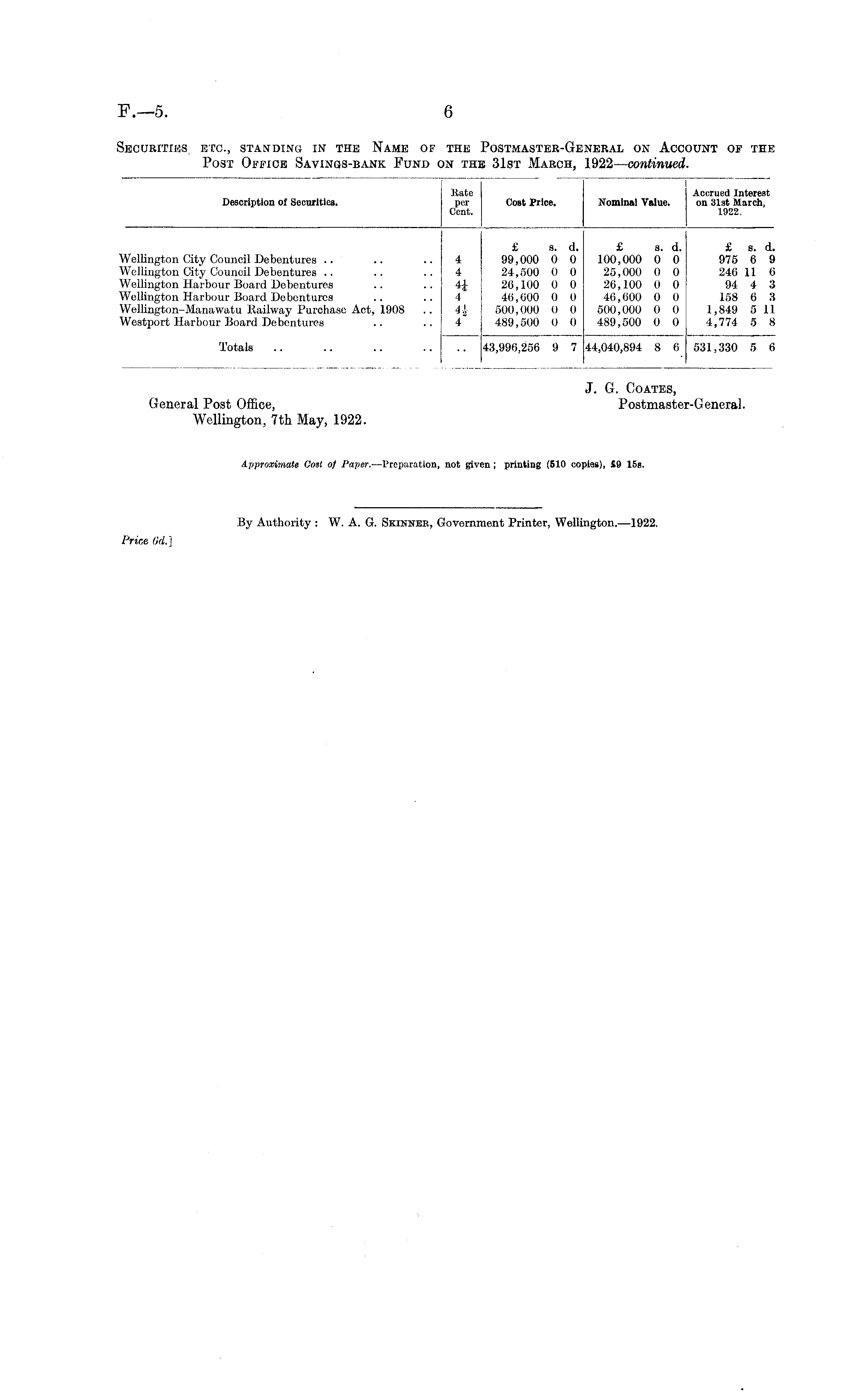 Description of Securities. Bate per Cent. Cost Price. Nominal Value. Accrued Interest on 31st March, 1922. Wellington City Council Debentures Wellington City Council Debentures Wellington Harbour Board Debentures Wellington Harbour Board Debentures Wellington-Manawatu Kailway Purchase Act, 1908 Westport Harbour Board Debentures 4 4 •u 4 4 £ s. d. 99,000 0 0 24,500 0 0 26,100 0 0 46,000 0 0 500,000 0 0 489,500 0 0 £ s. d. 100,000 0 0 25,000 0 0 26,100 0 0 40,600 0 0 500,000 0 0 489,500 0 0 £ s. d. 975 6 9 246 11 6 94 4 3 158 8 3 1,849 5 11 4,774 5 8 Totals 43,996,256 9 7 44,040,894 8 6 531,330 5 6
