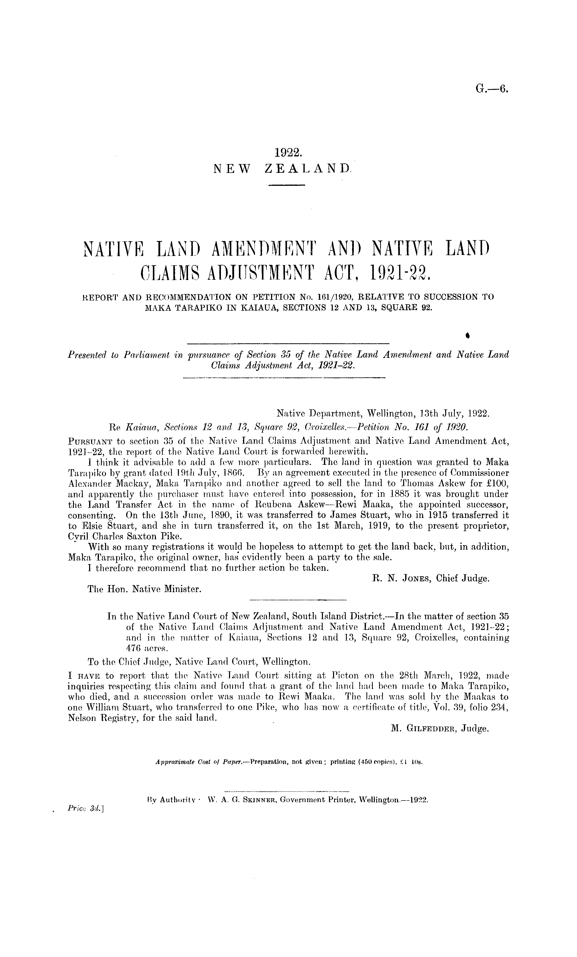 NATIVE LAND AMENDMENT AND NATIVE LAND CLAIMS ADJUSTMENT ACT, 1921-22. REPORT AND RECOMMENDATION ON PETITION No. 161/1920, RELATIVE TO SUCCESSION TO MAKA TARAPIKO IN KAIAUA, SECTIONS 12 AND 13, SQUARE 92.